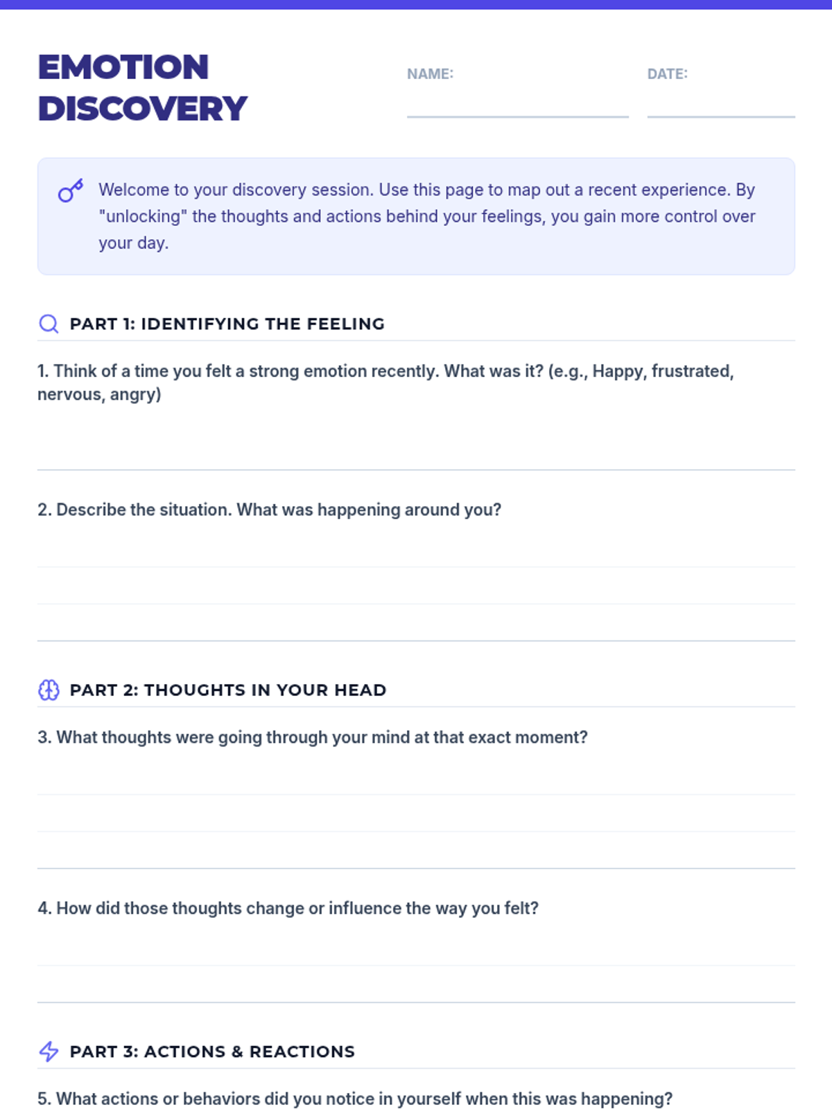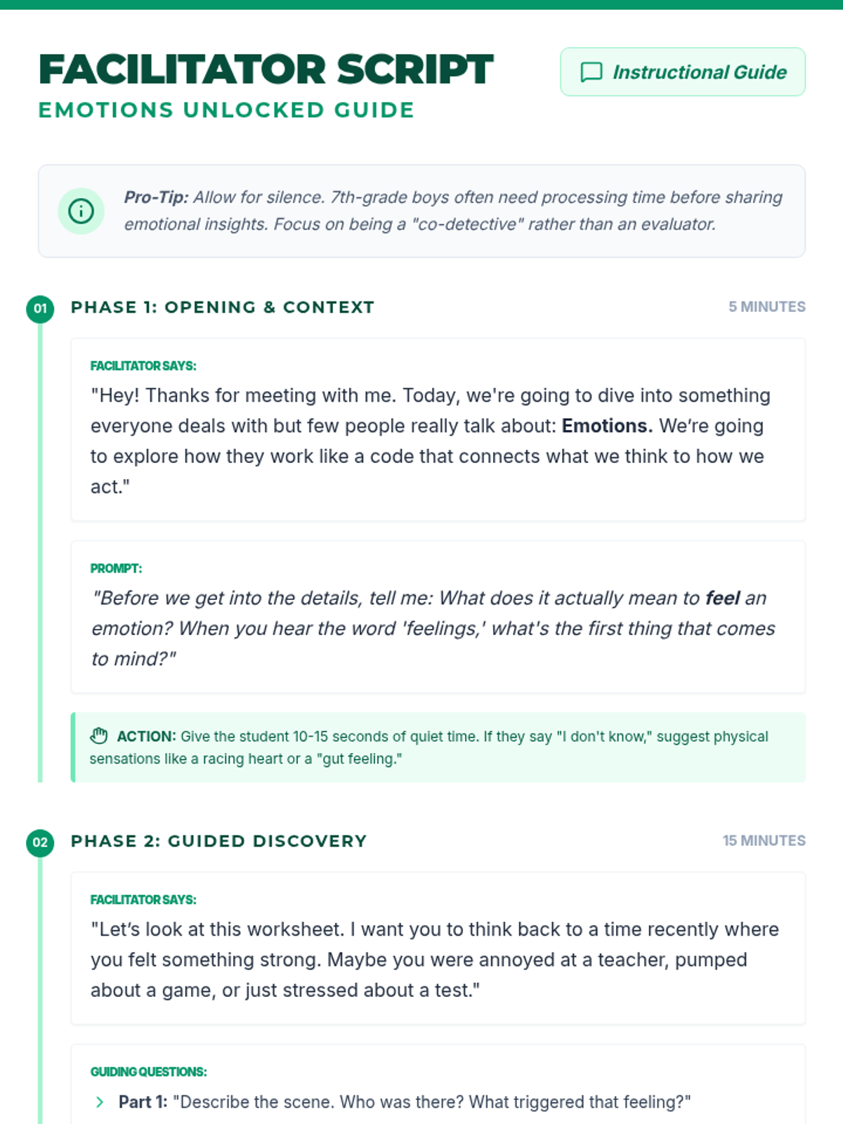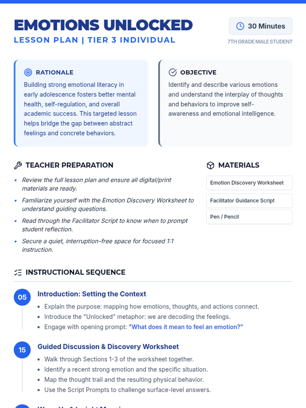 A 30-minute individual Tier 3 lesson for 7th-grade students focused on identifying emotions and understanding the connection between thoughts, feelings, and behaviors. The lesson uses a structured 'unlocking' metaphor to make emotional intelligence accessible and engaging.