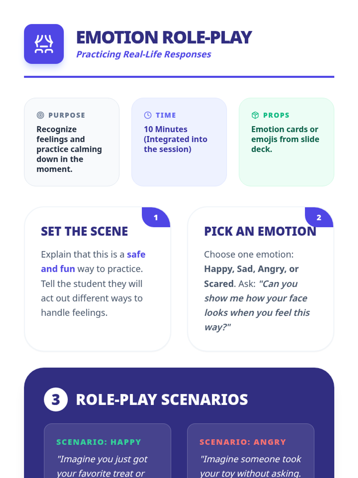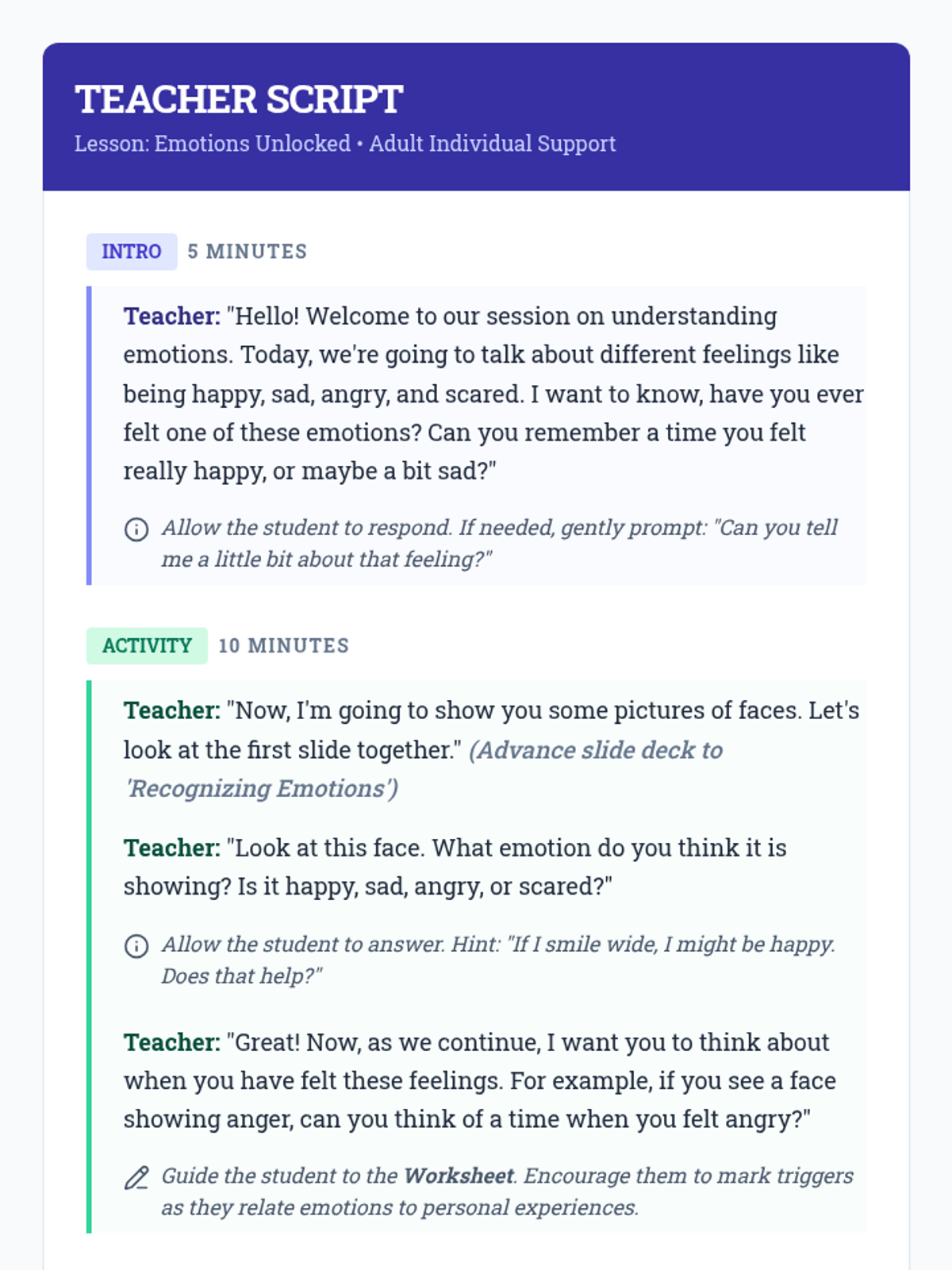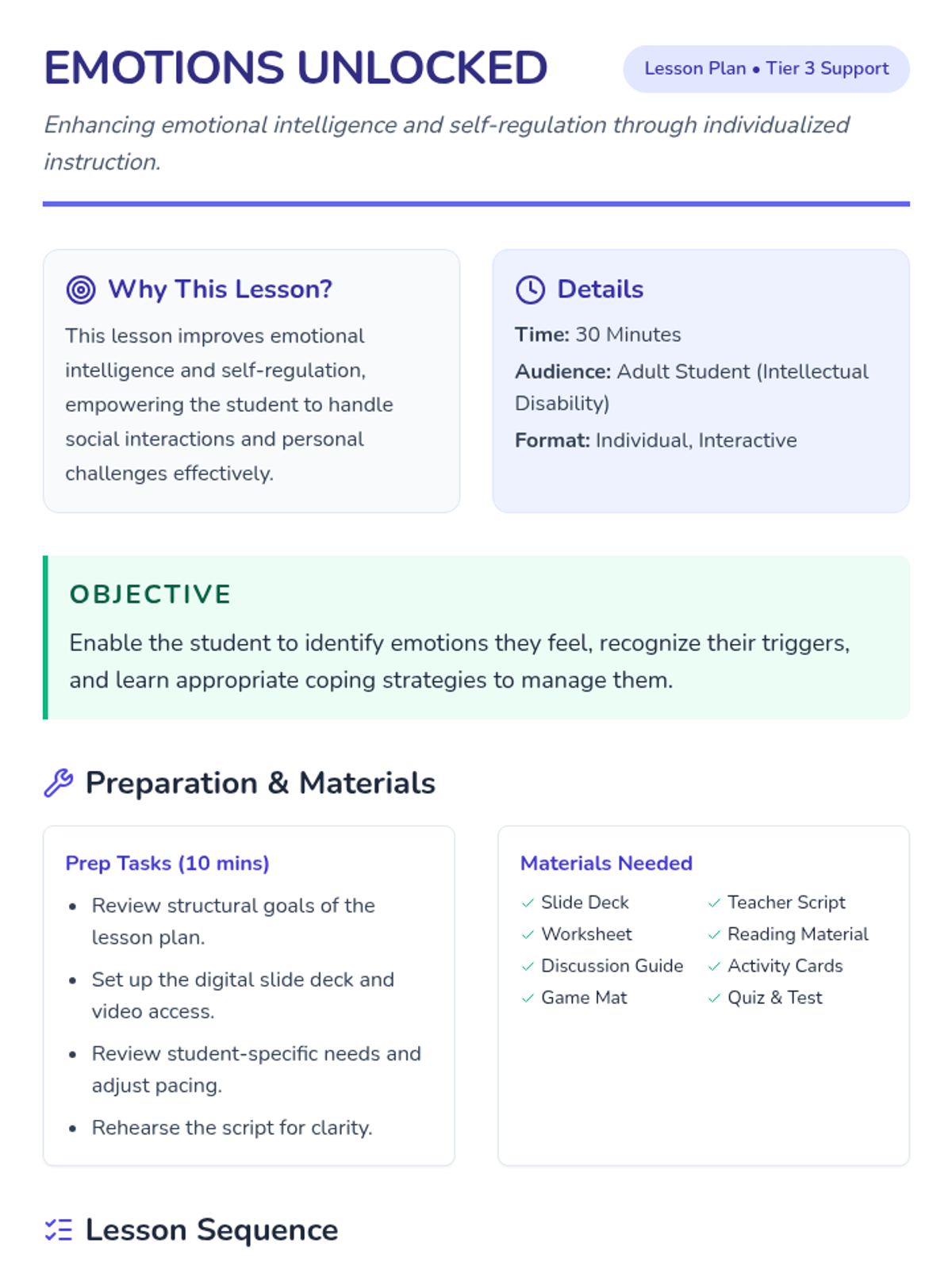 A specialized 30-minute individual lesson for an adult student with intellectual disabilities, focusing on identifying four core emotions, recognizing personal triggers, and practicing calming coping strategies.