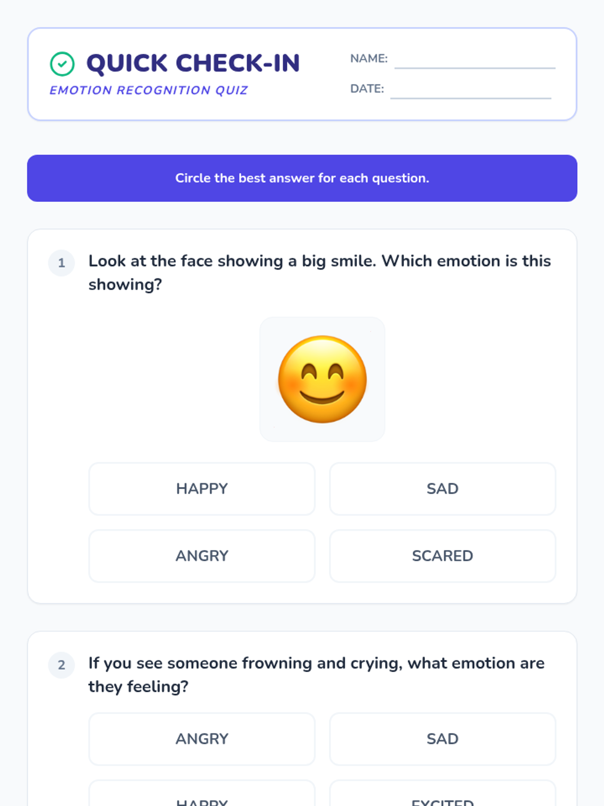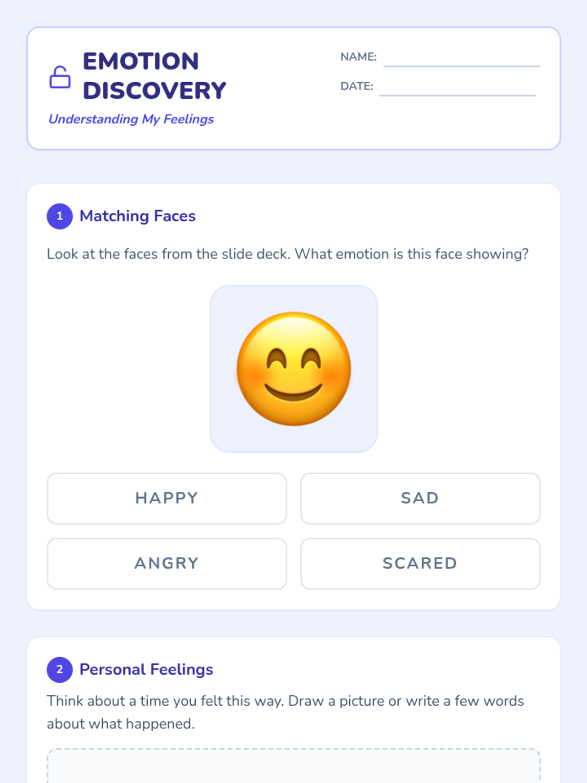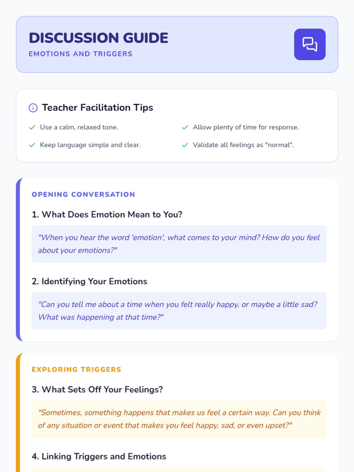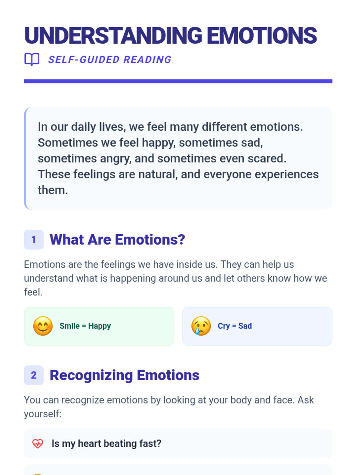 A specialized 30-minute individual lesson for an adult student with intellectual disabilities, focusing on identifying four core emotions, recognizing personal triggers, and practicing calming coping strategies.