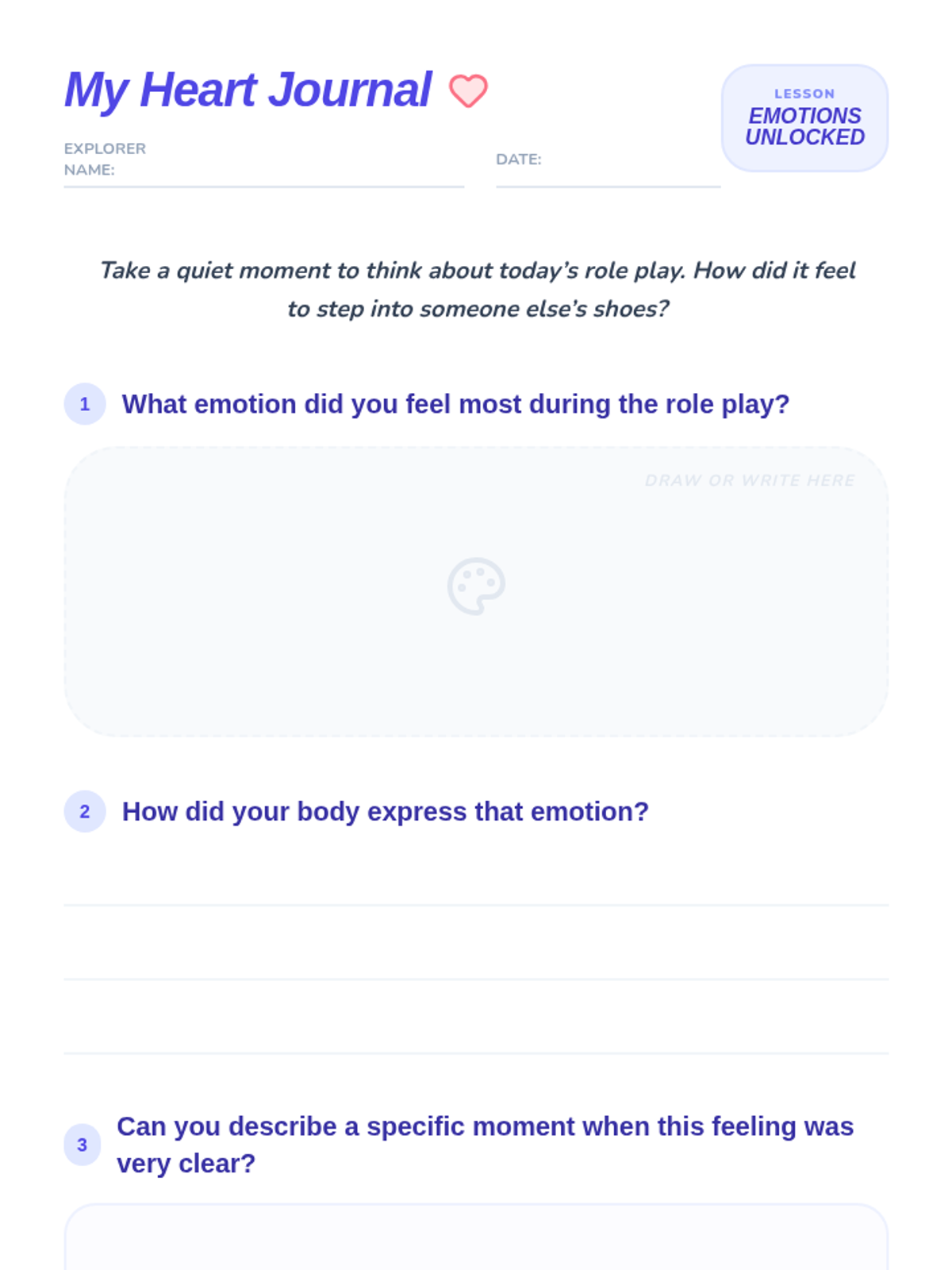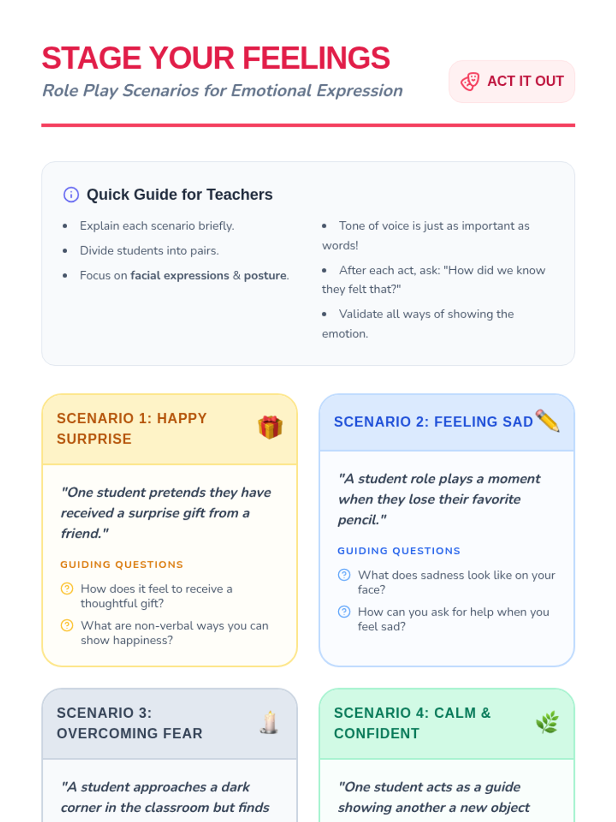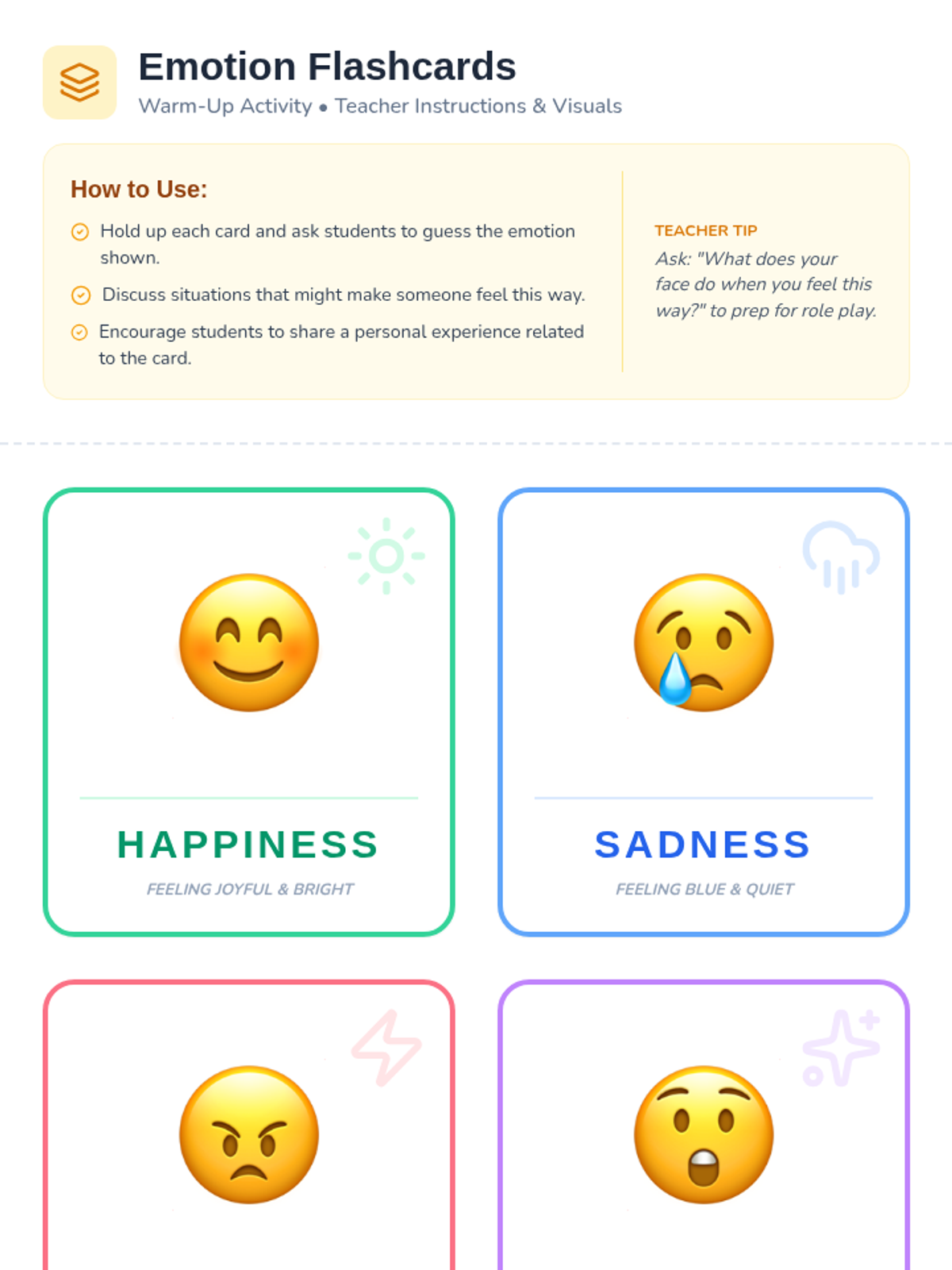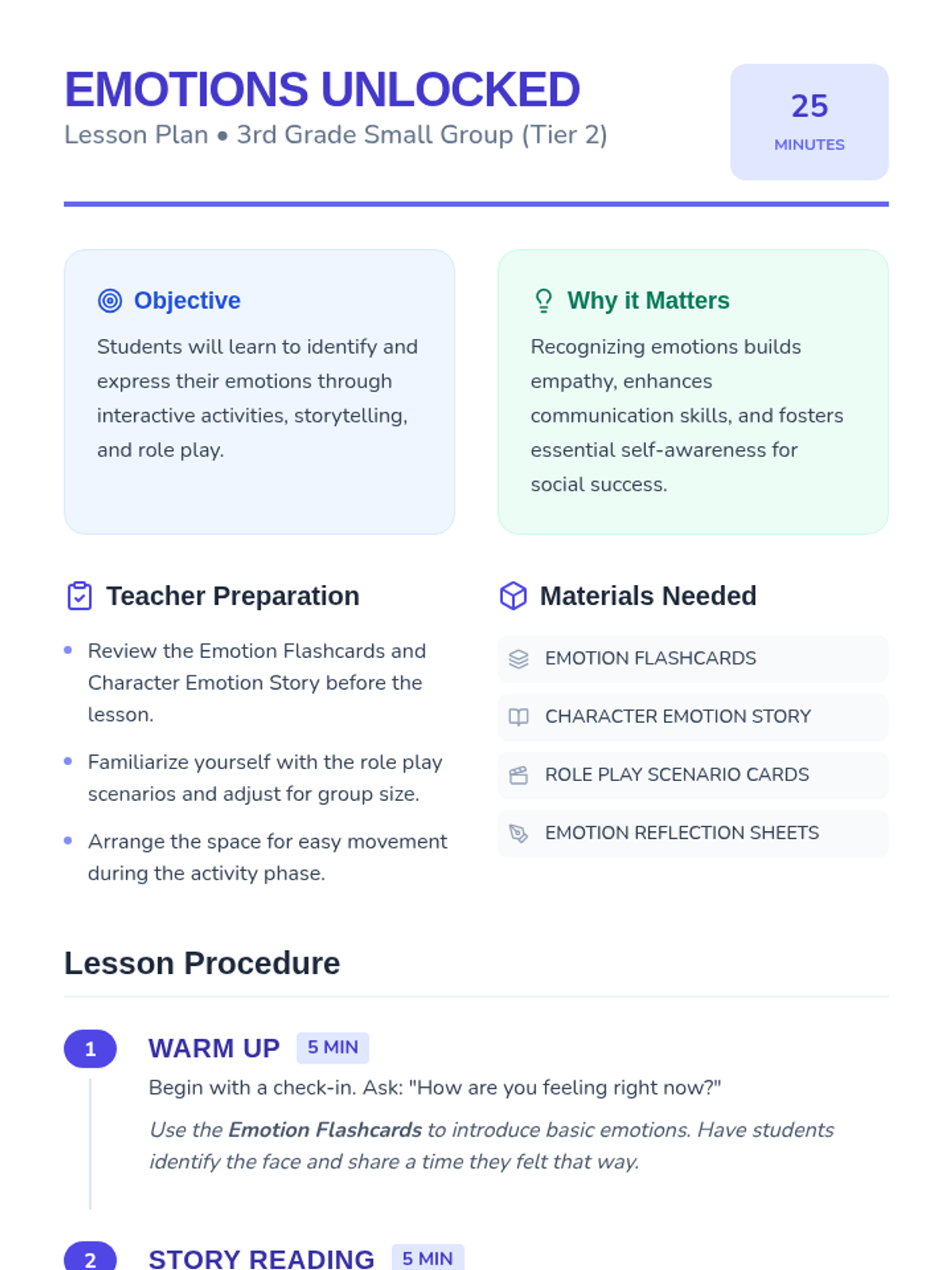 A 25-minute small group lesson for 3rd graders focused on identifying and expressing emotions through storytelling, flashcards, and role play. Students develop empathy and self-awareness by exploring how feelings guide their actions and communication.