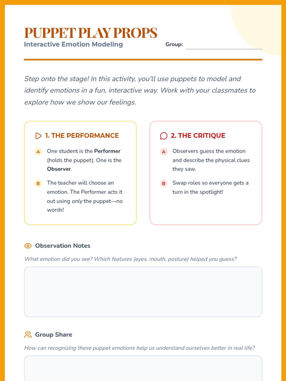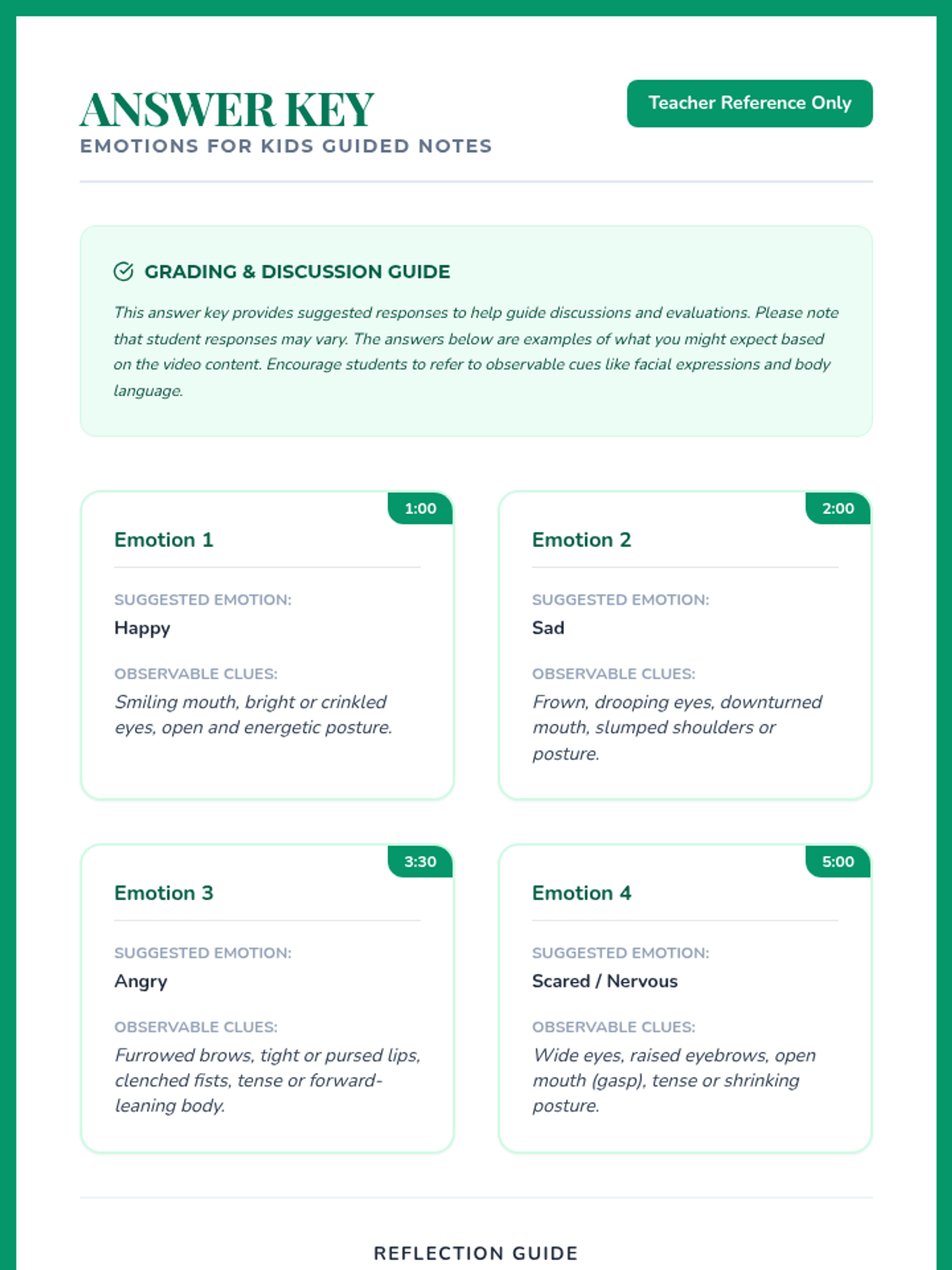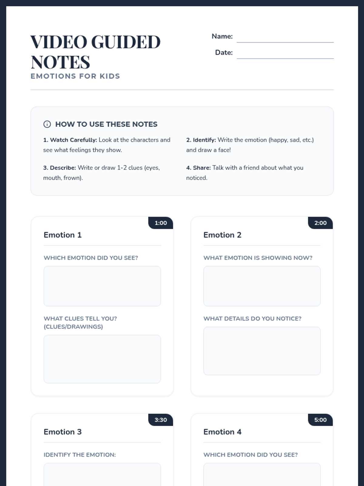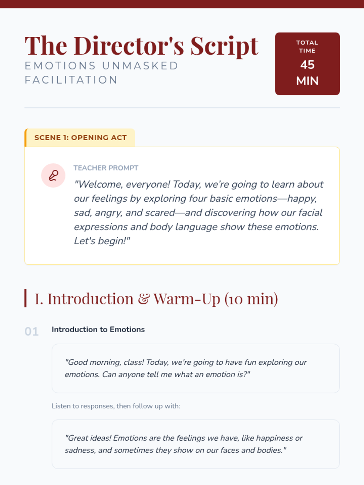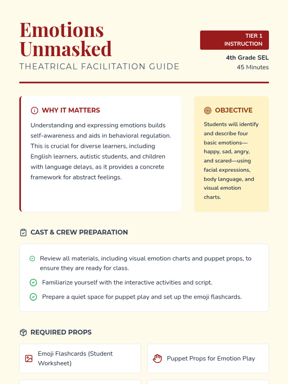 A 45-minute social-emotional learning lesson for 4th graders to identify and describe four basic emotions through visual aids, interactive play, and video reflection.
