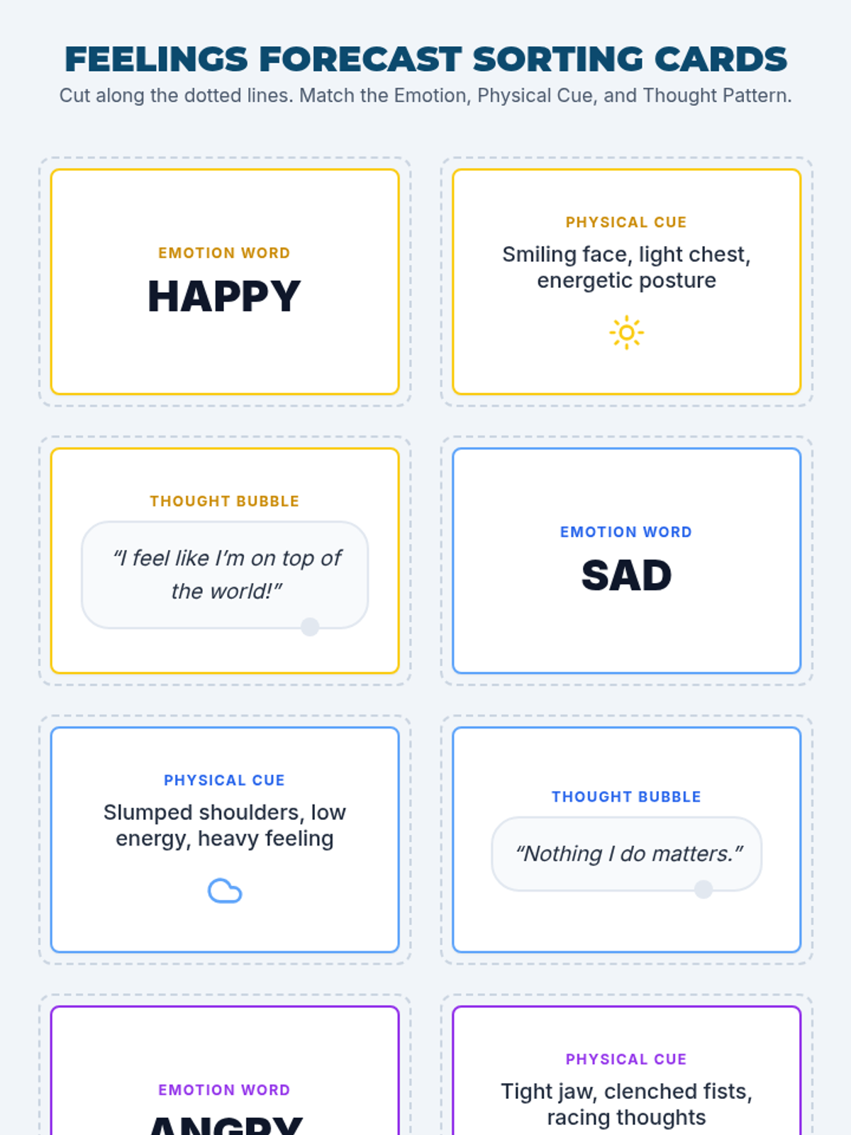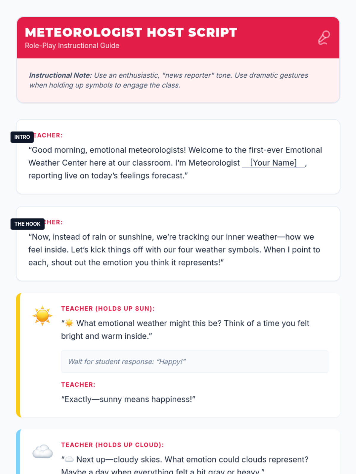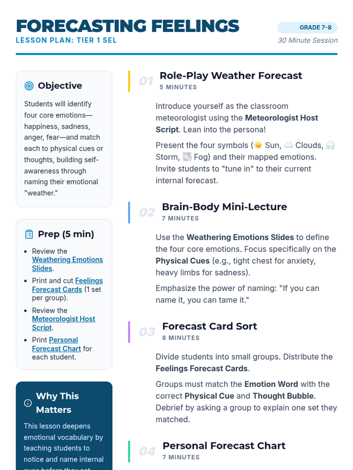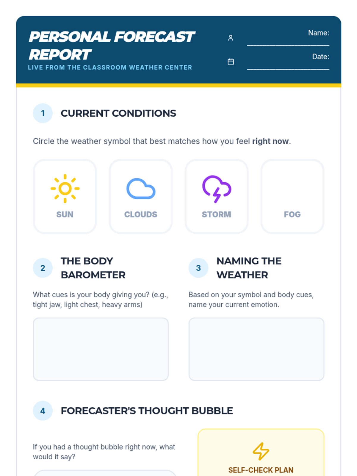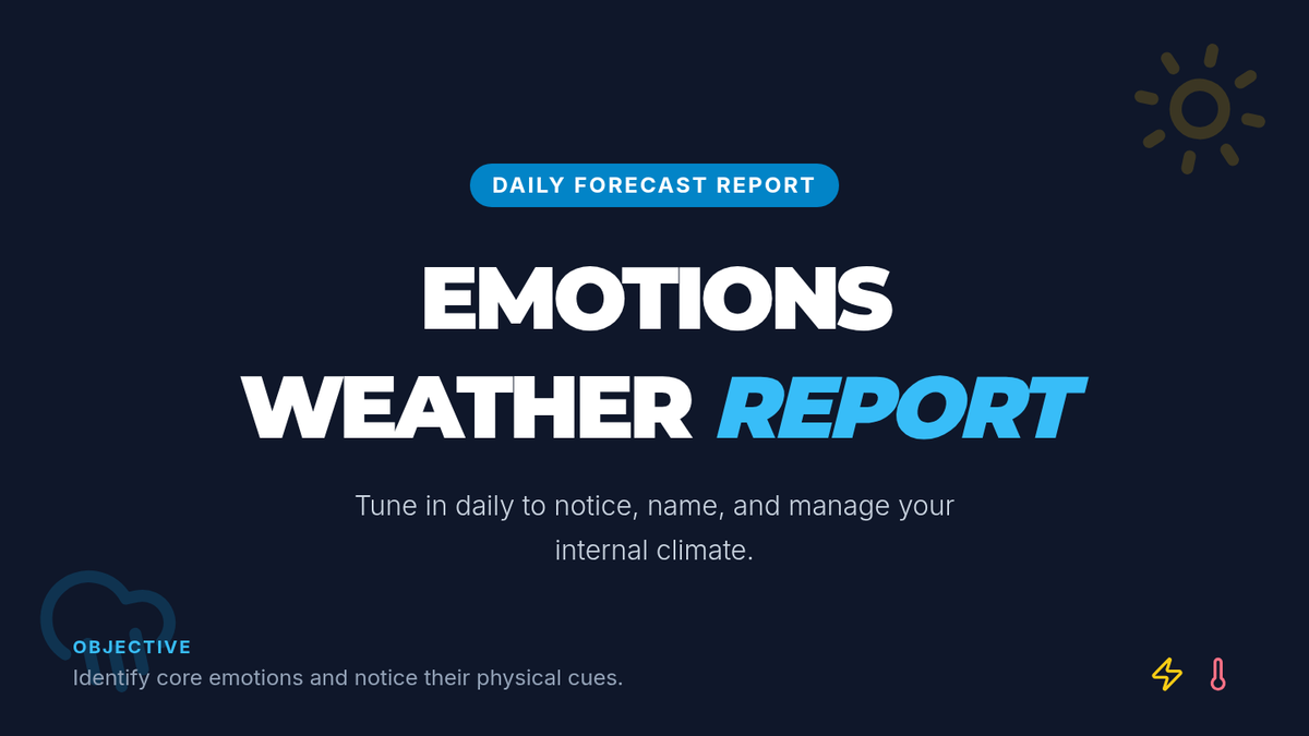 In this 30-minute lesson for 7th & 8th graders, students learn to identify four core emotions, link them to physical cues or thoughts, and build self-awareness through a fun weather-forecast role-play. Students will practice 'naming their weather' to build emotional vocabulary and self-management skills.