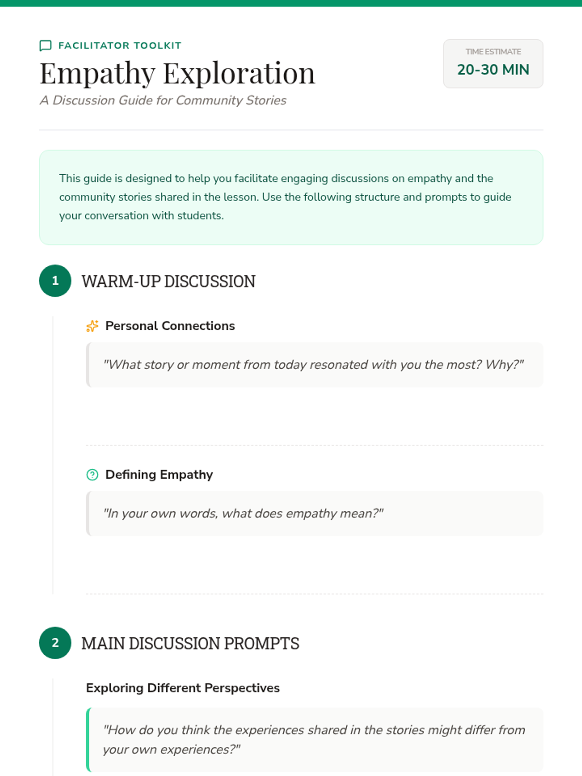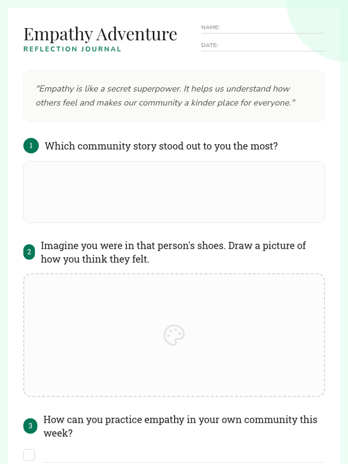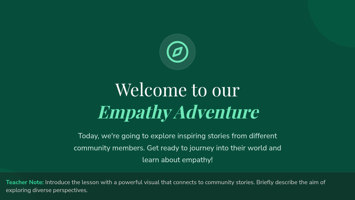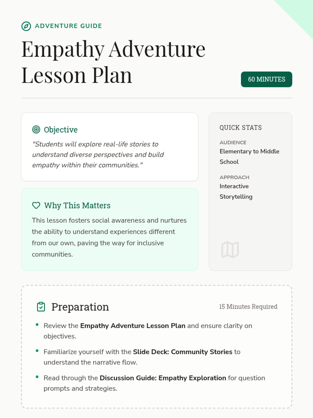 Students embark on an 'empathy adventure' by exploring real-life stories from diverse community members to build social awareness and perspective-taking skills.