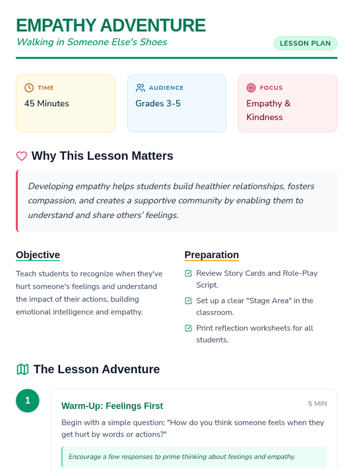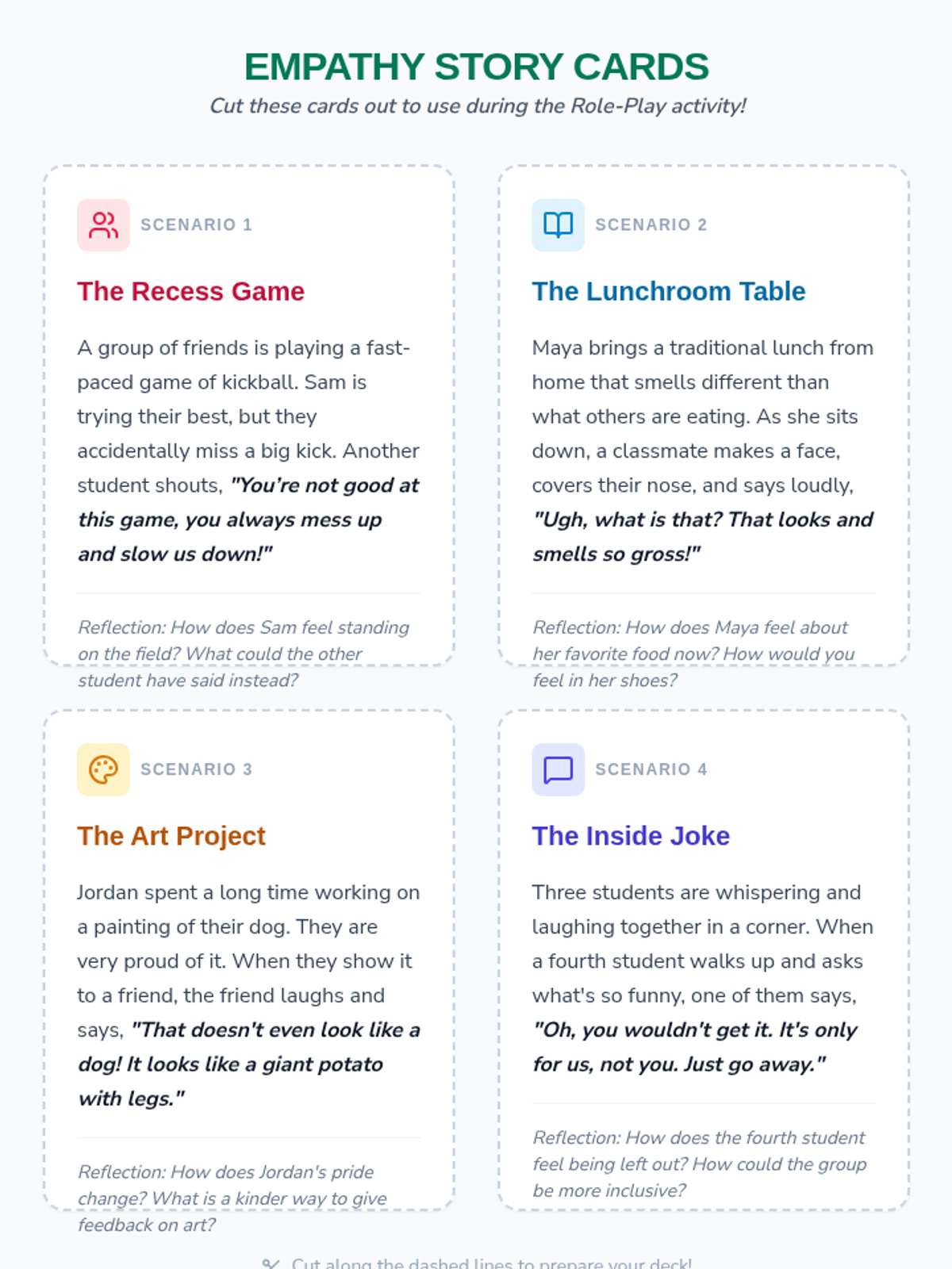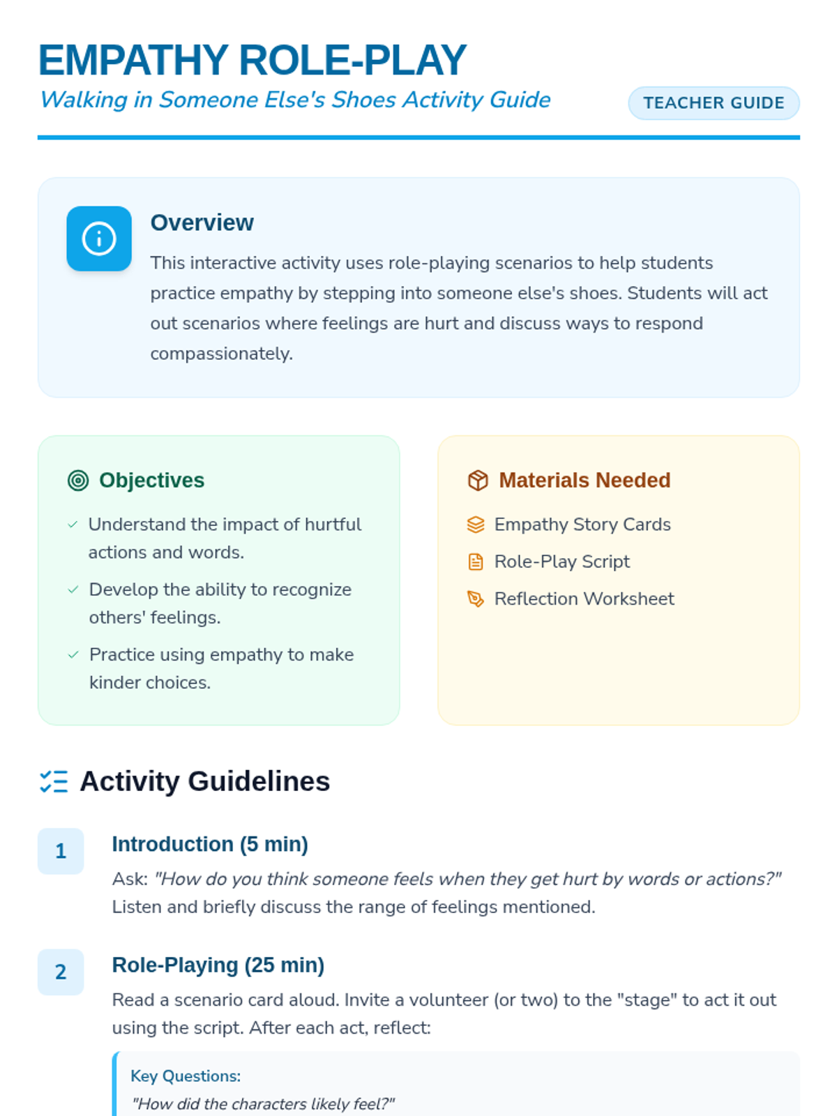 This engaging lesson for upper elementary students in an after-school program focuses on teaching empathy through role-play and reflection, helping them understand the impact of their actions on others.