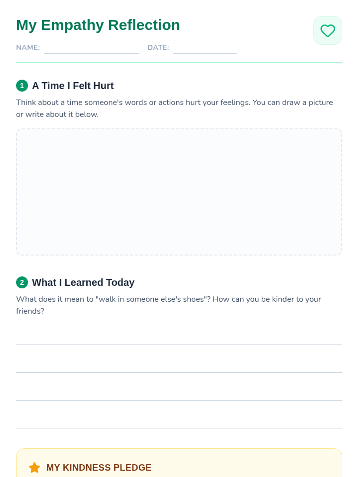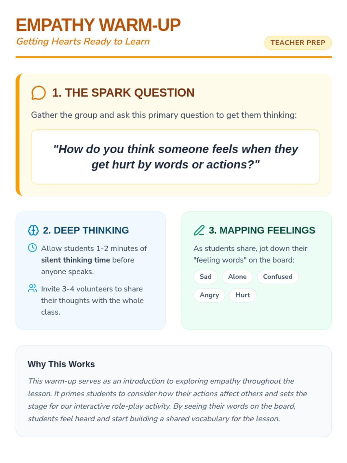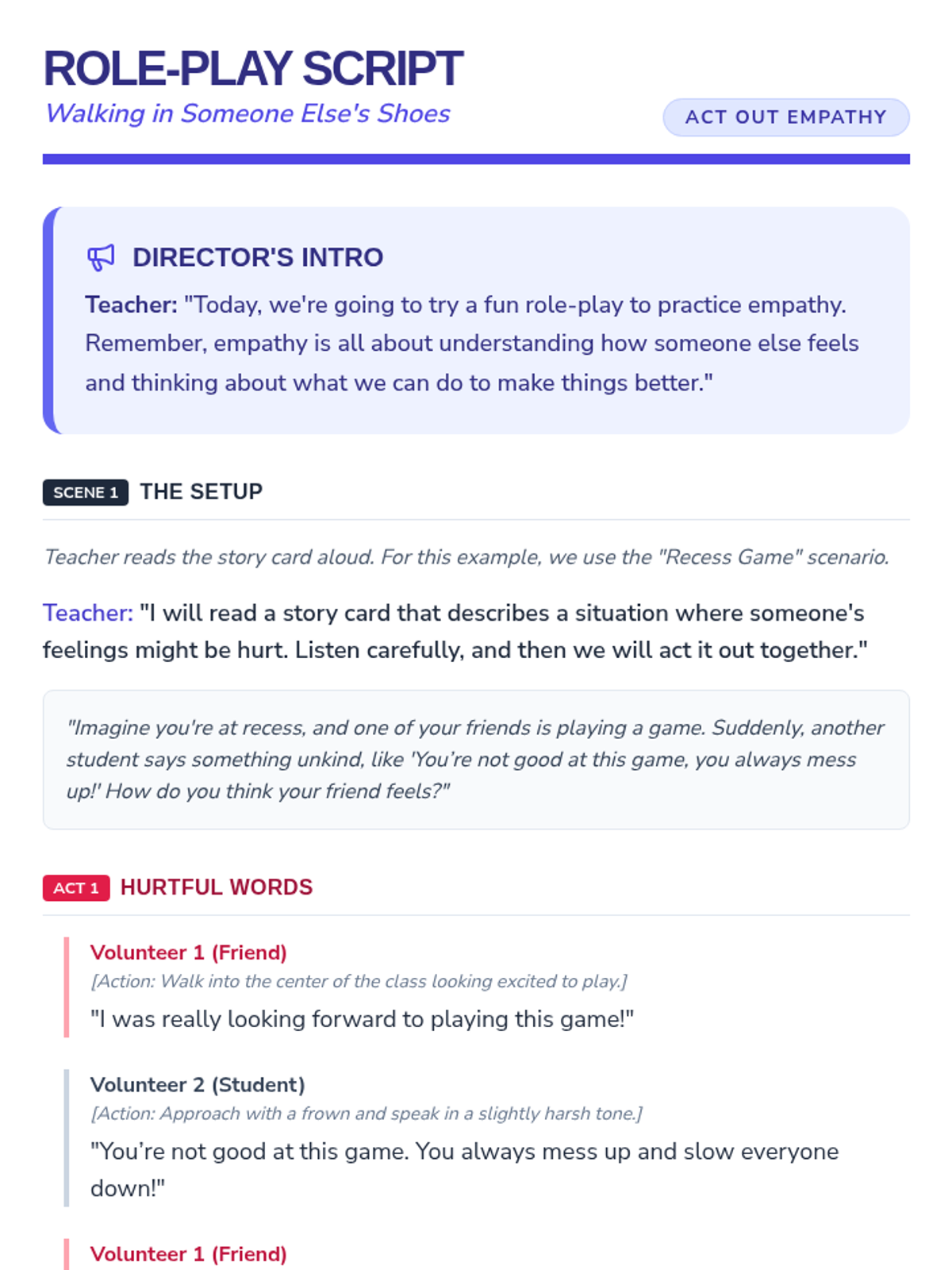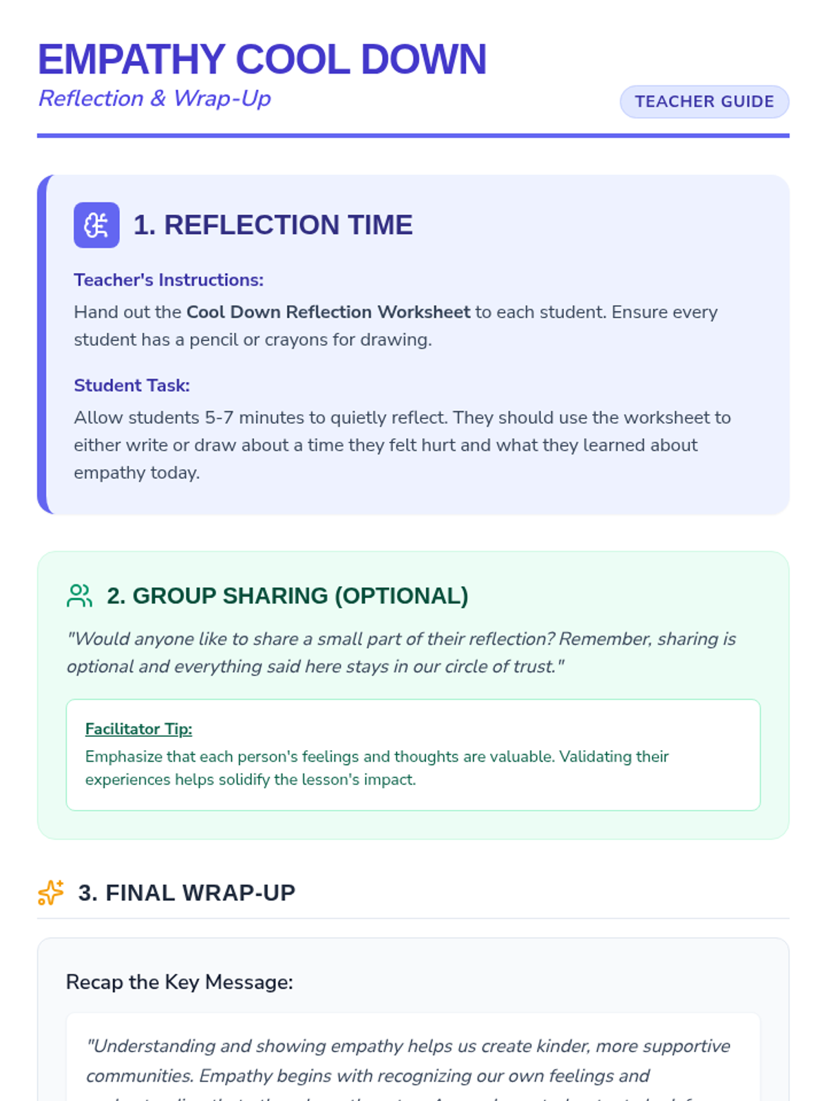 This engaging lesson for upper elementary students in an after-school program focuses on teaching empathy through role-play and reflection, helping them understand the impact of their actions on others.