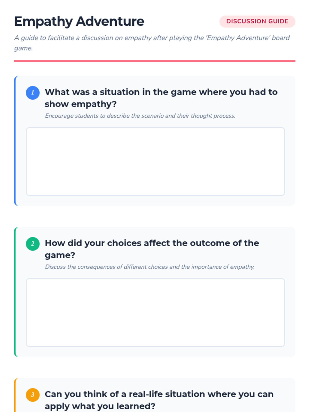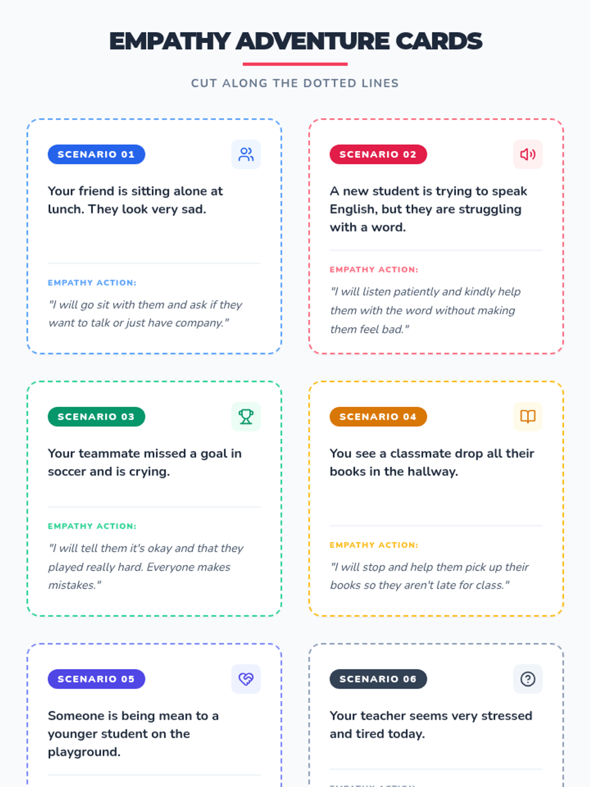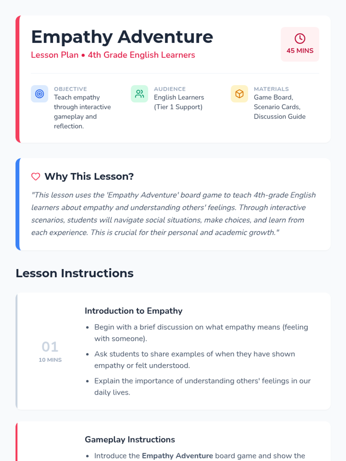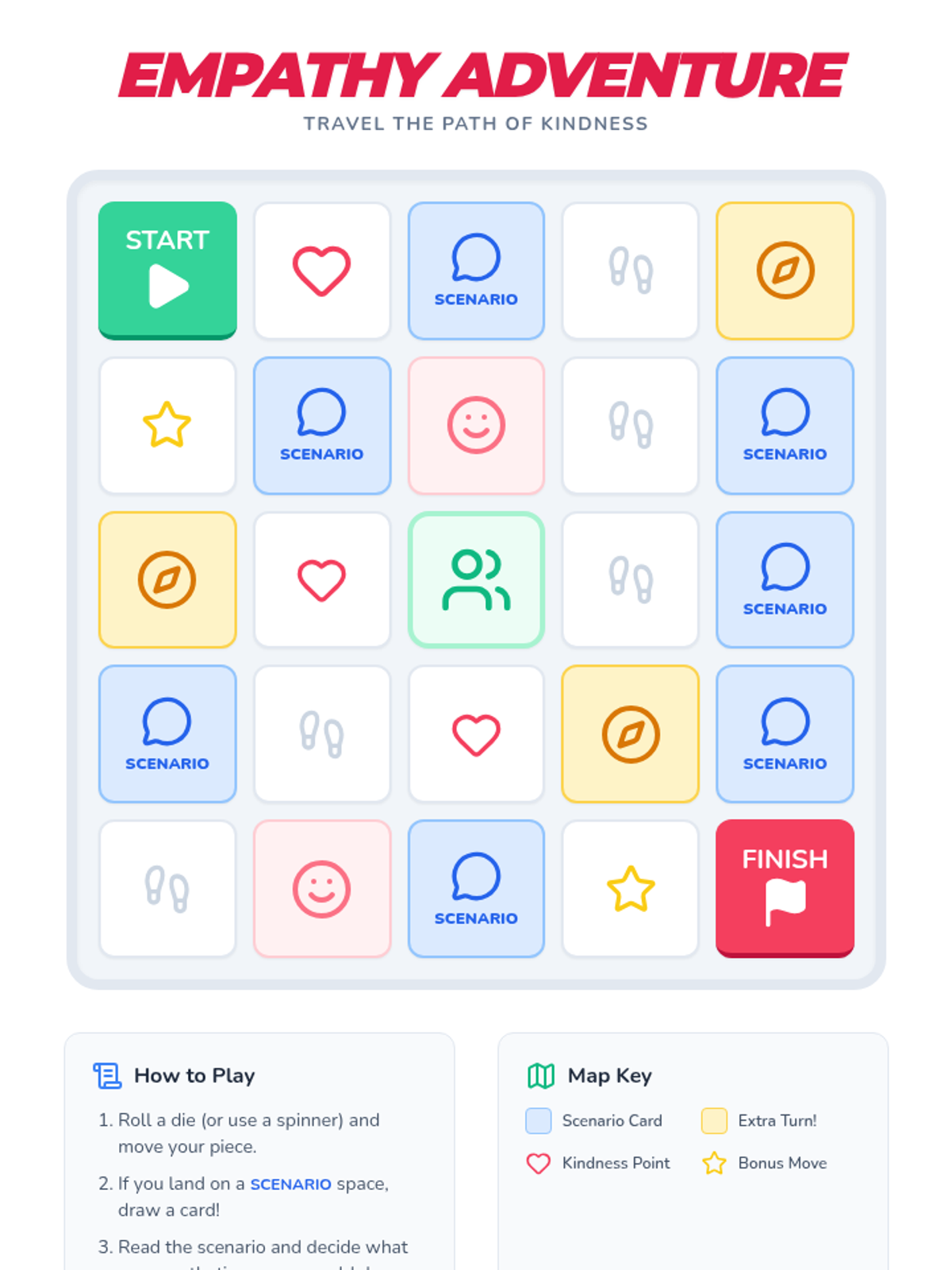 An interactive lesson for 4th-grade English learners that uses a custom board game to explore empathy, social scenarios, and understanding others' perspectives.