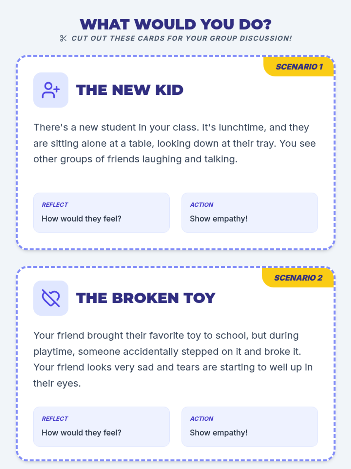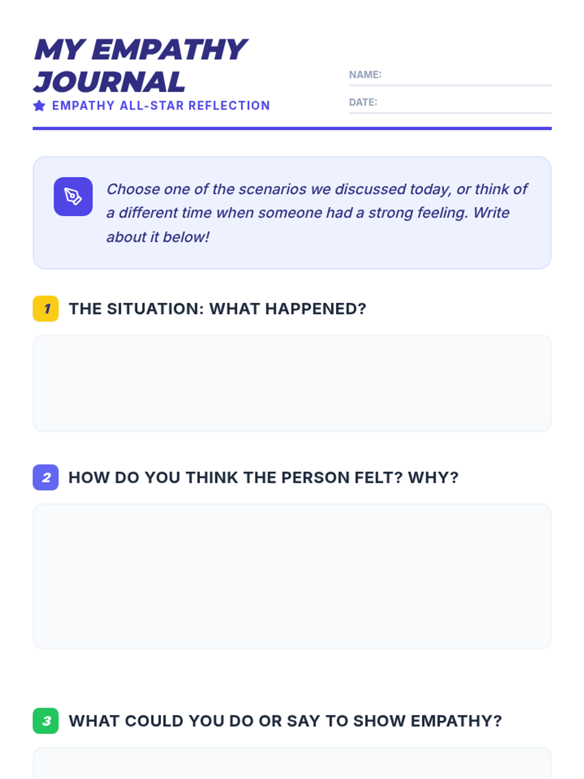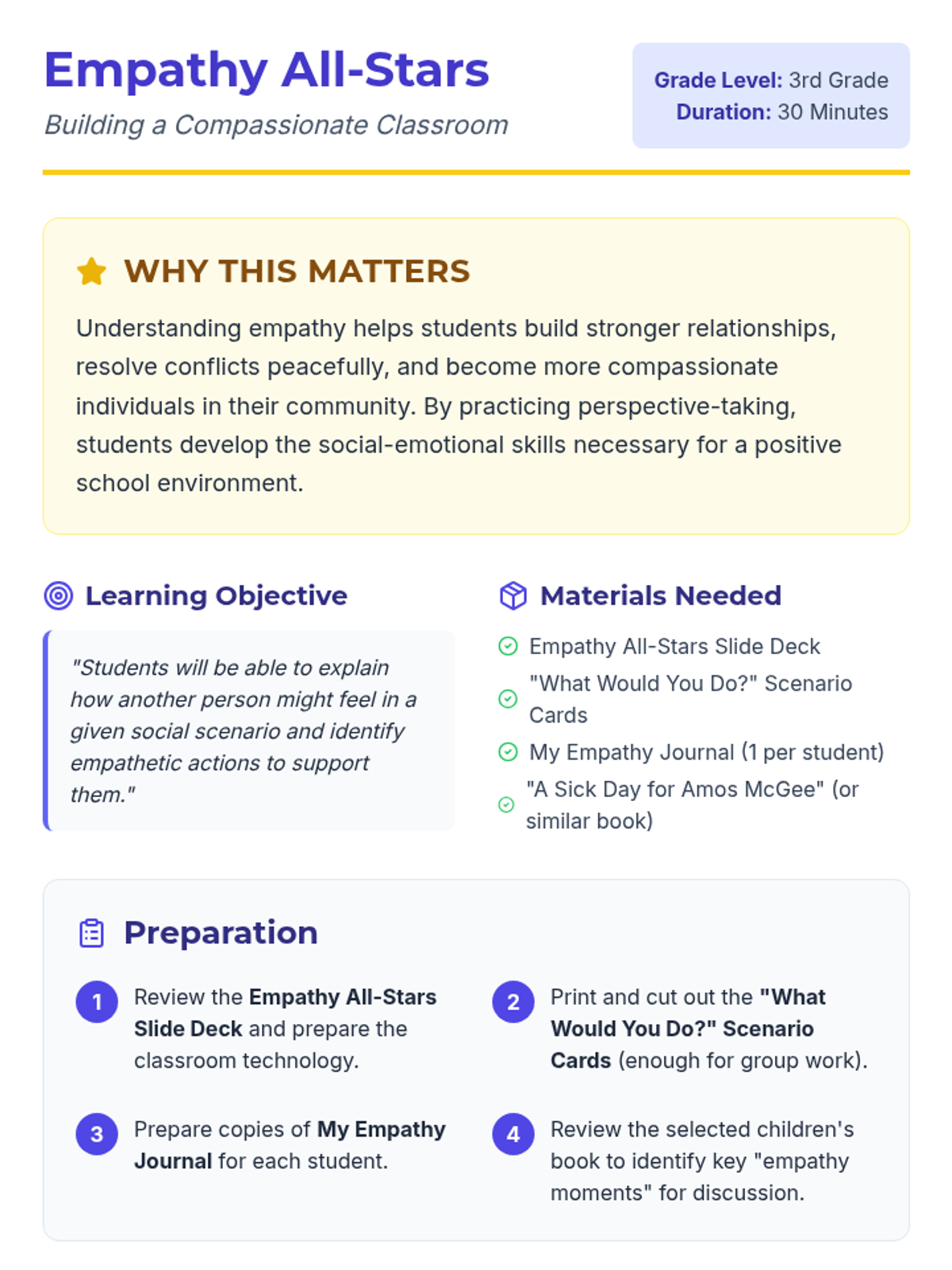 A 30-minute lesson for 3rd graders focused on understanding empathy through story-telling, interactive scenarios, and personal reflection. Students learn to recognize feelings and practice perspective-taking to build a more compassionate classroom community.