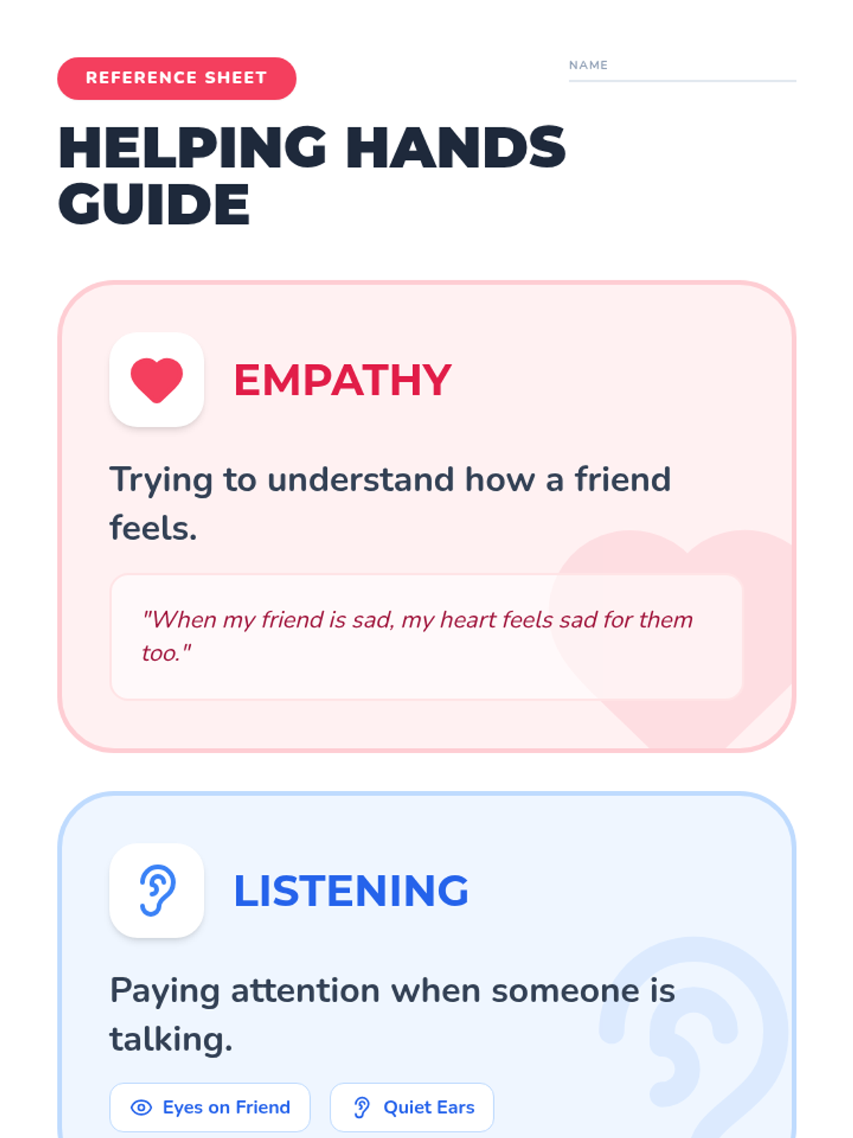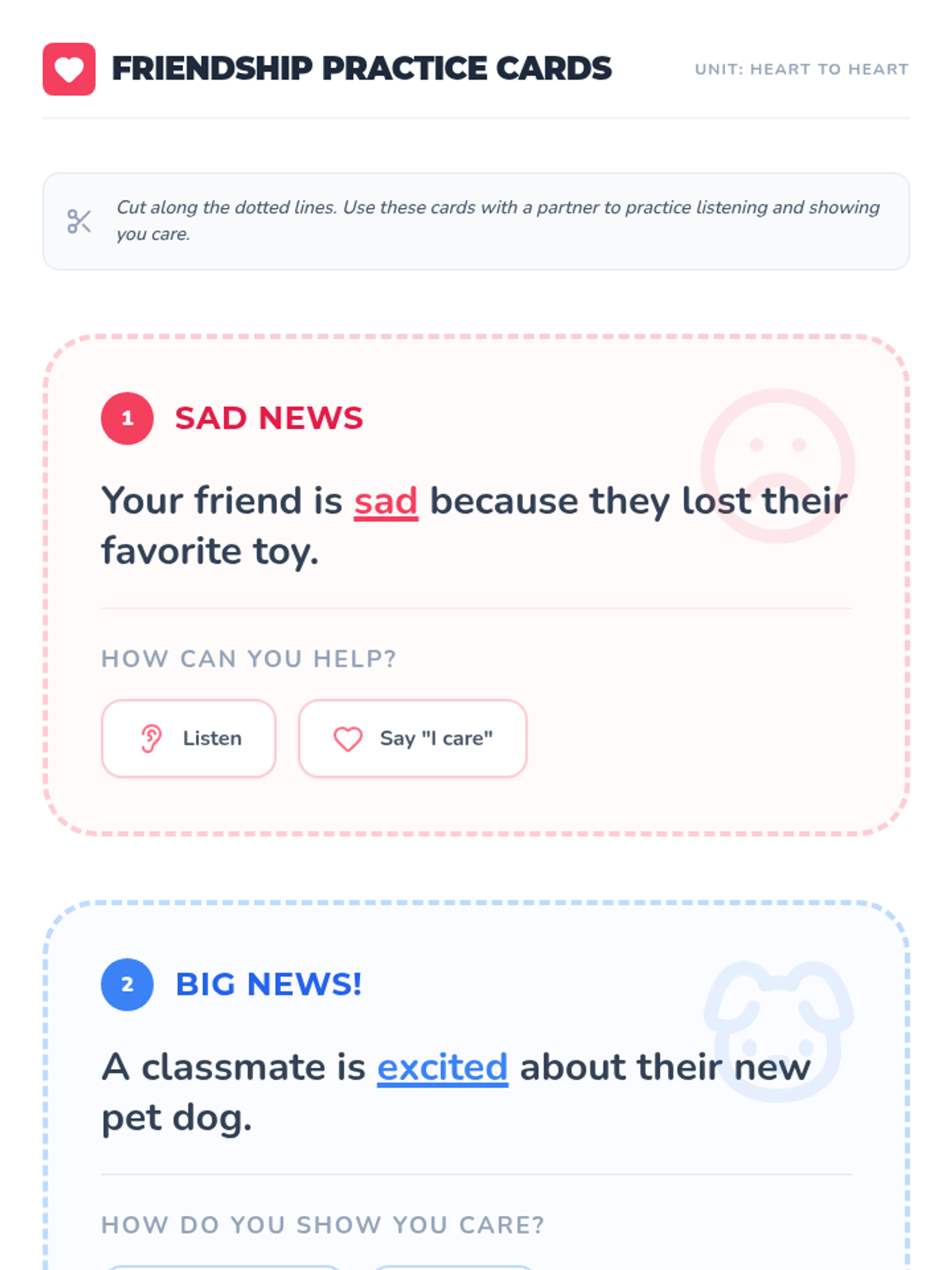 This lesson introduces 5th-grade students with lower cognition to empathy and active listening through relatable examples, videos, and role-play activities. Students will practice how to show they care and how to listen when a friend is talking.