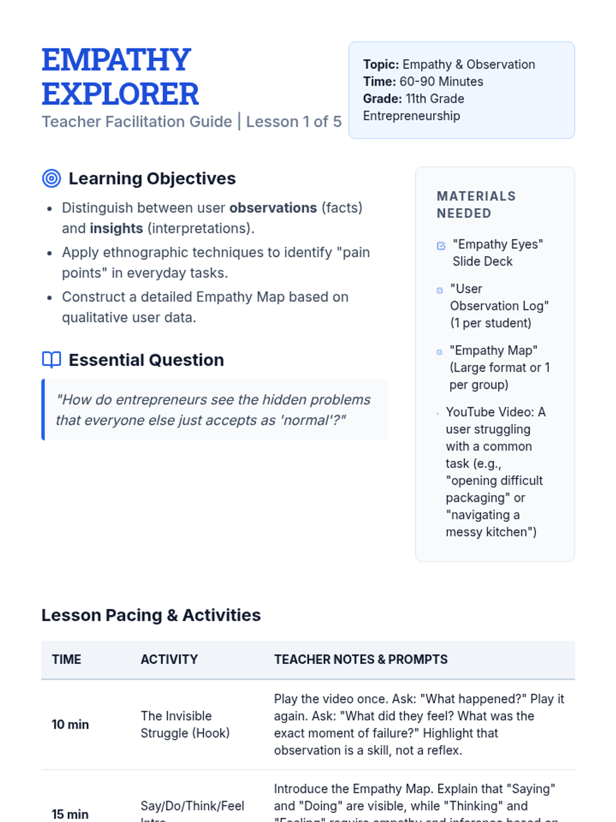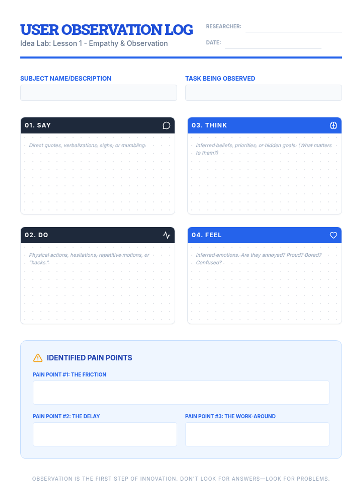 Students practice ethnographic research methods to observe users in natural environments, identifying latent needs and friction points using empathy maps.
