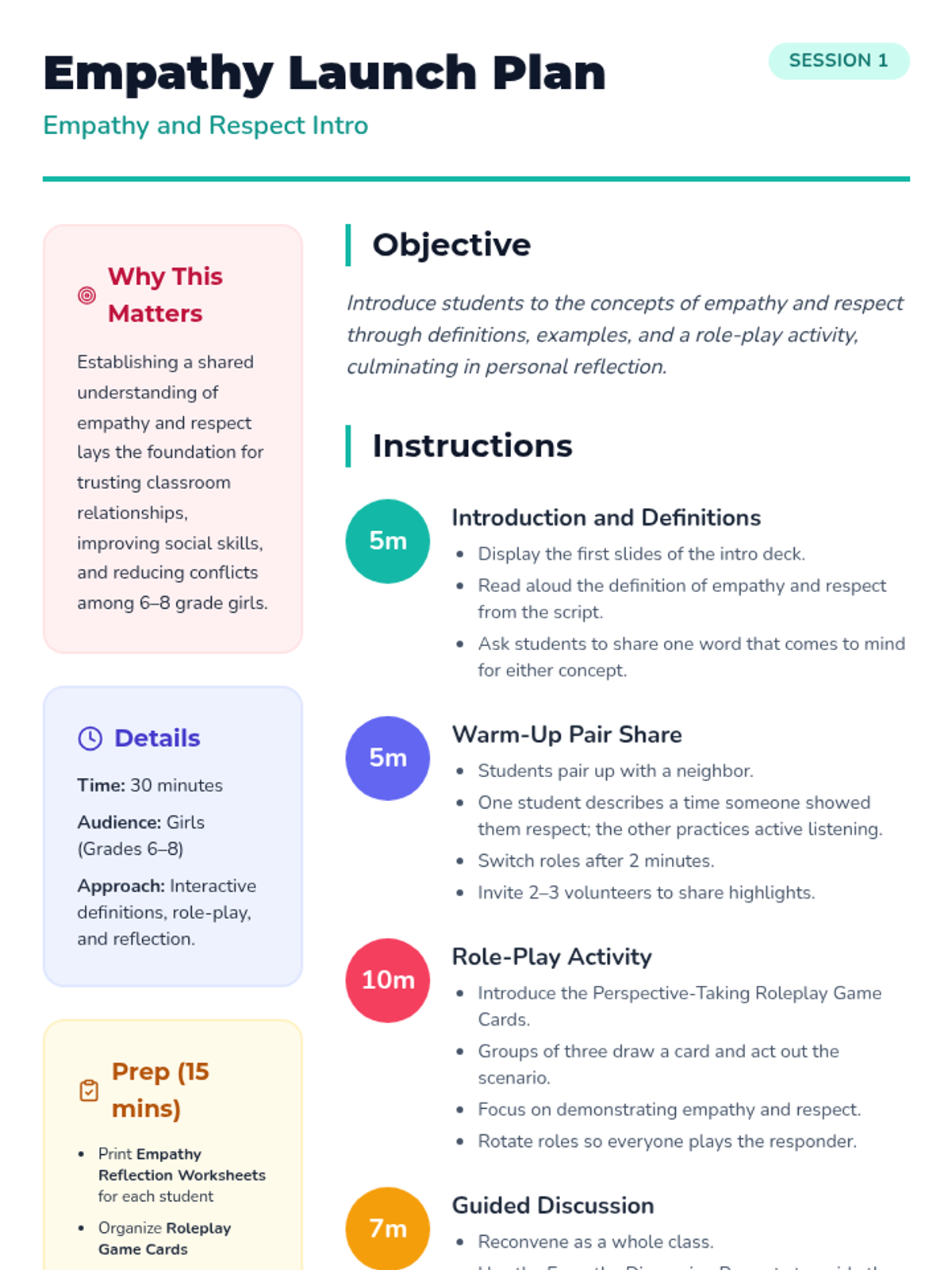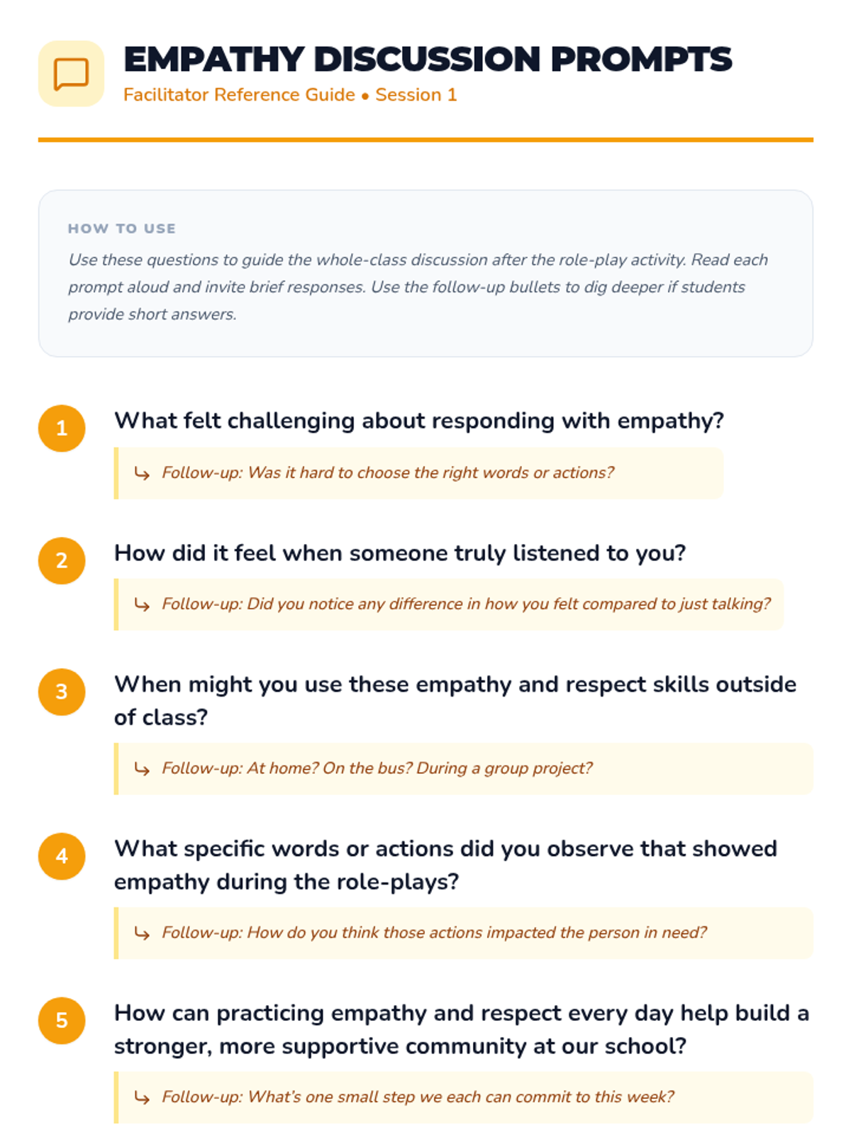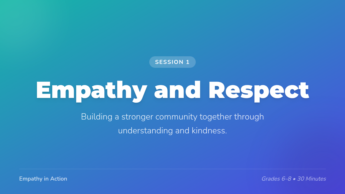 An introductory session that establishes a shared understanding of empathy and respect through definitions, pair-sharing, and role-play activities.