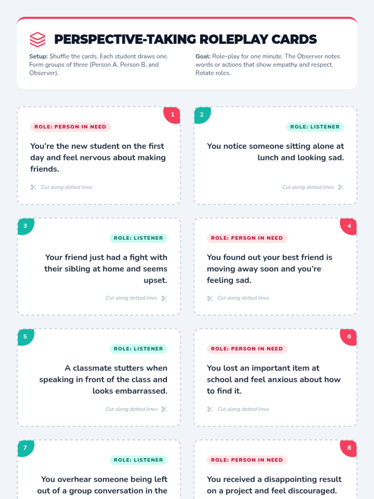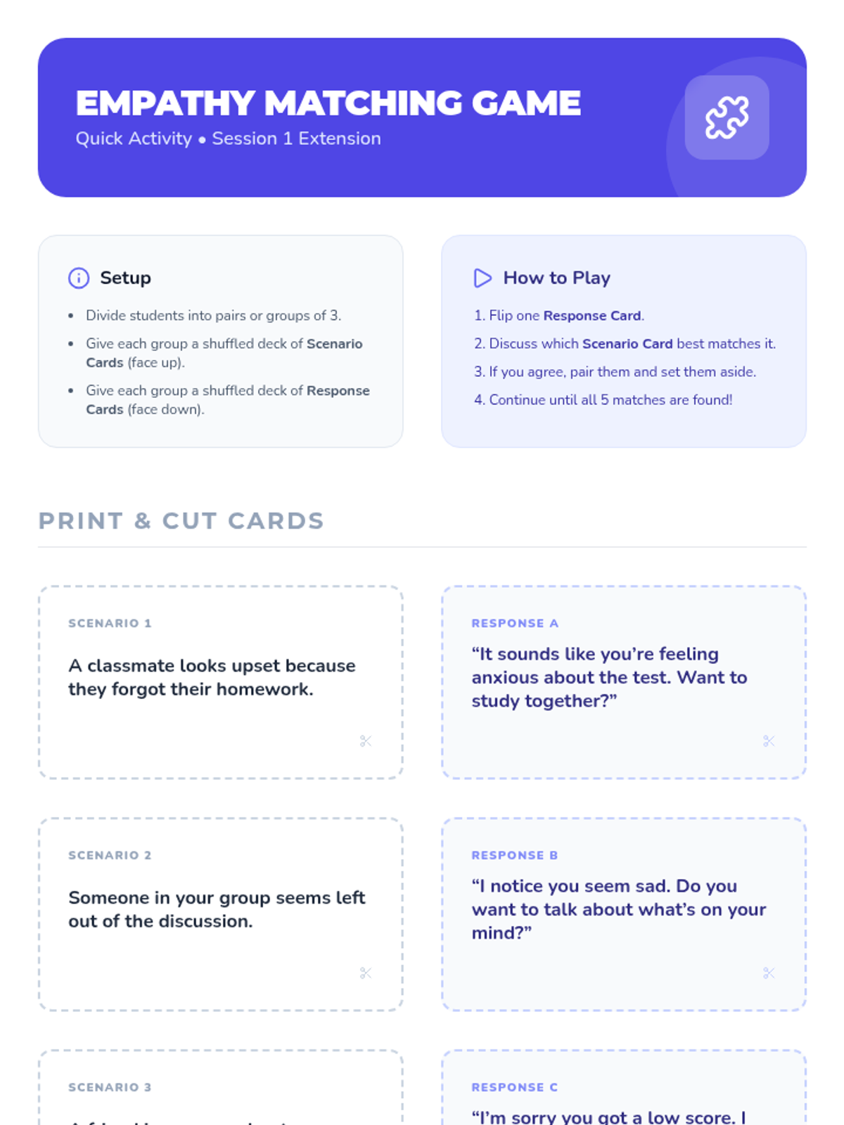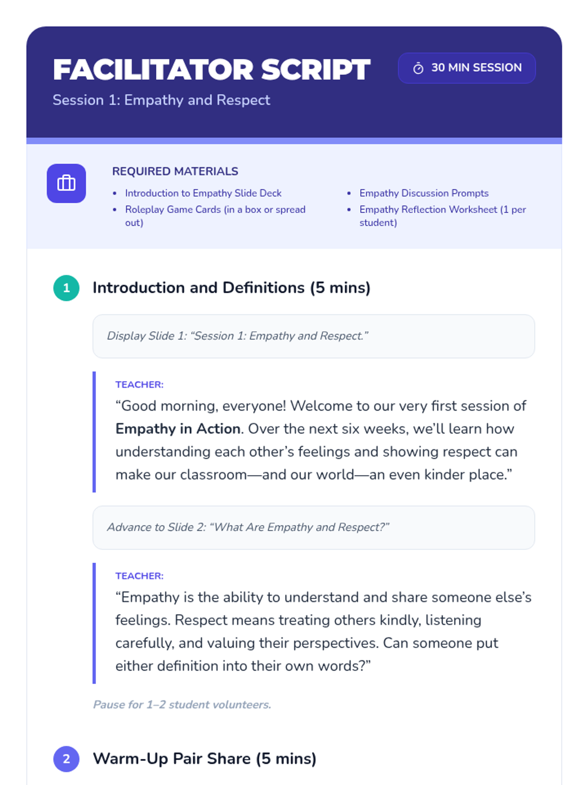 An introductory session that establishes a shared understanding of empathy and respect through definitions, pair-sharing, and role-play activities.