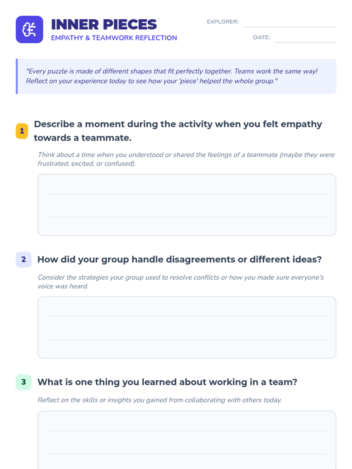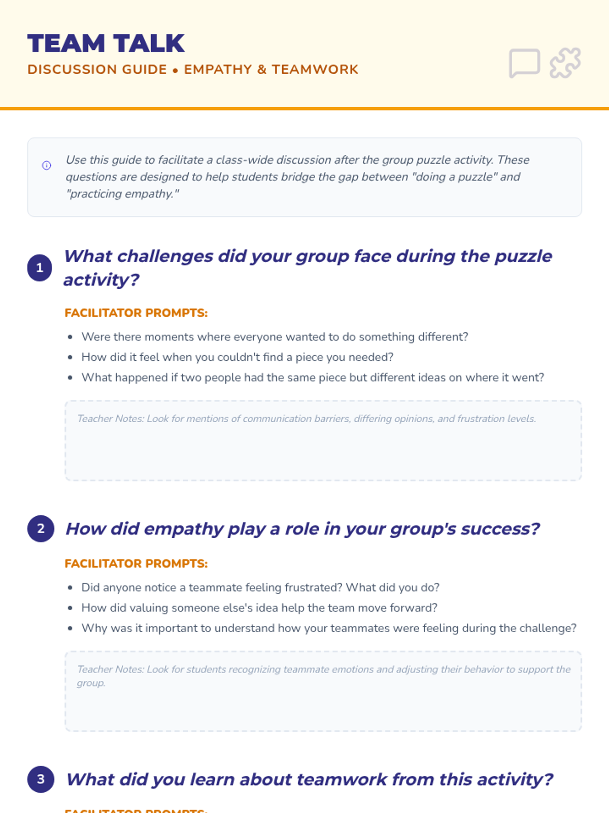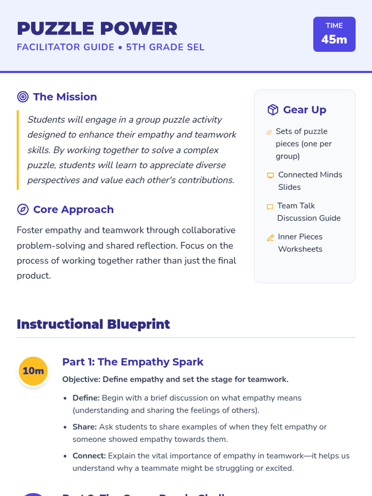 A 45-minute lesson for 5th graders focused on developing empathy and teamwork through a collaborative puzzle-solving challenge. Students will explore how diverse perspectives and mutual support lead to group success.