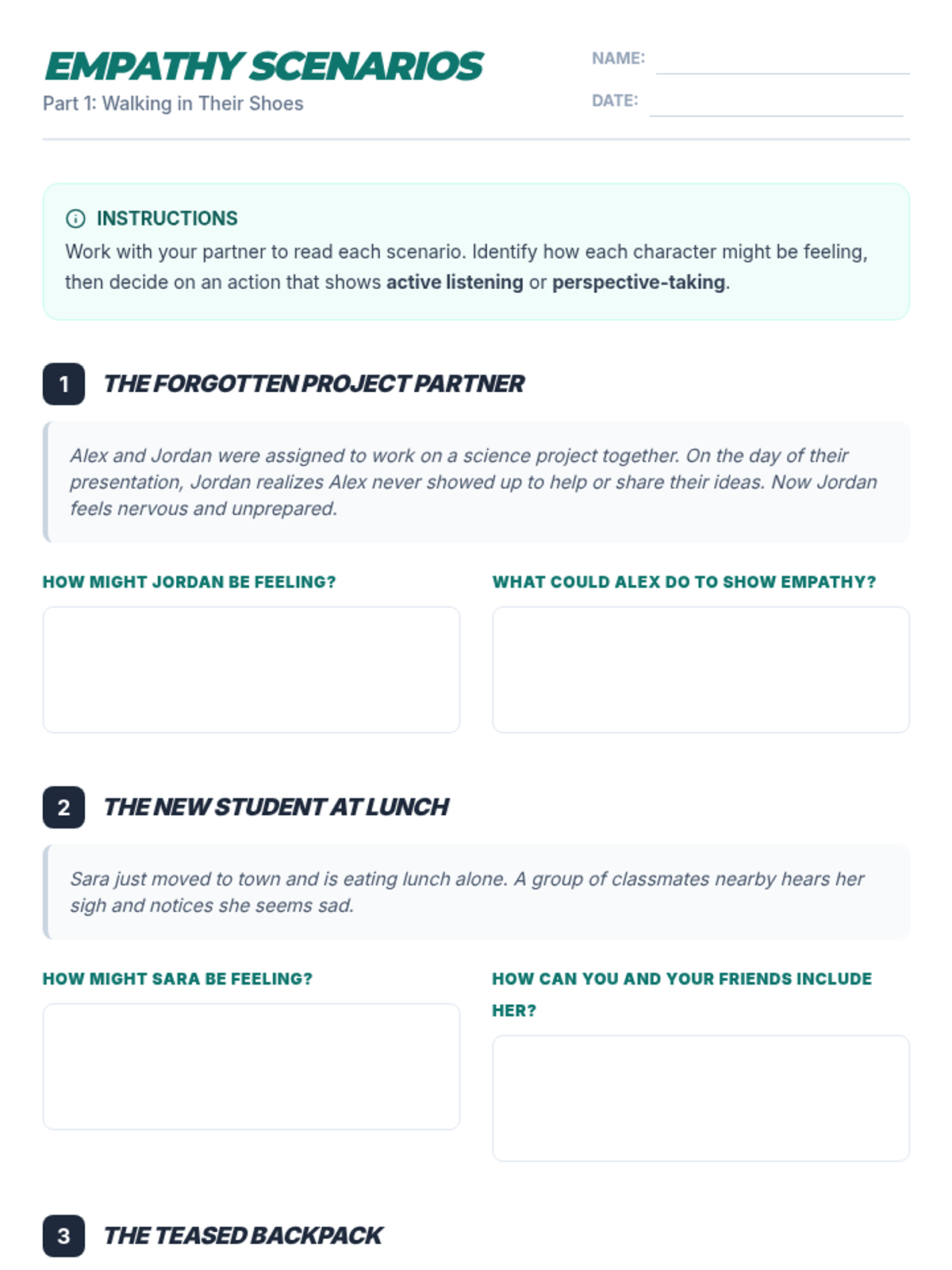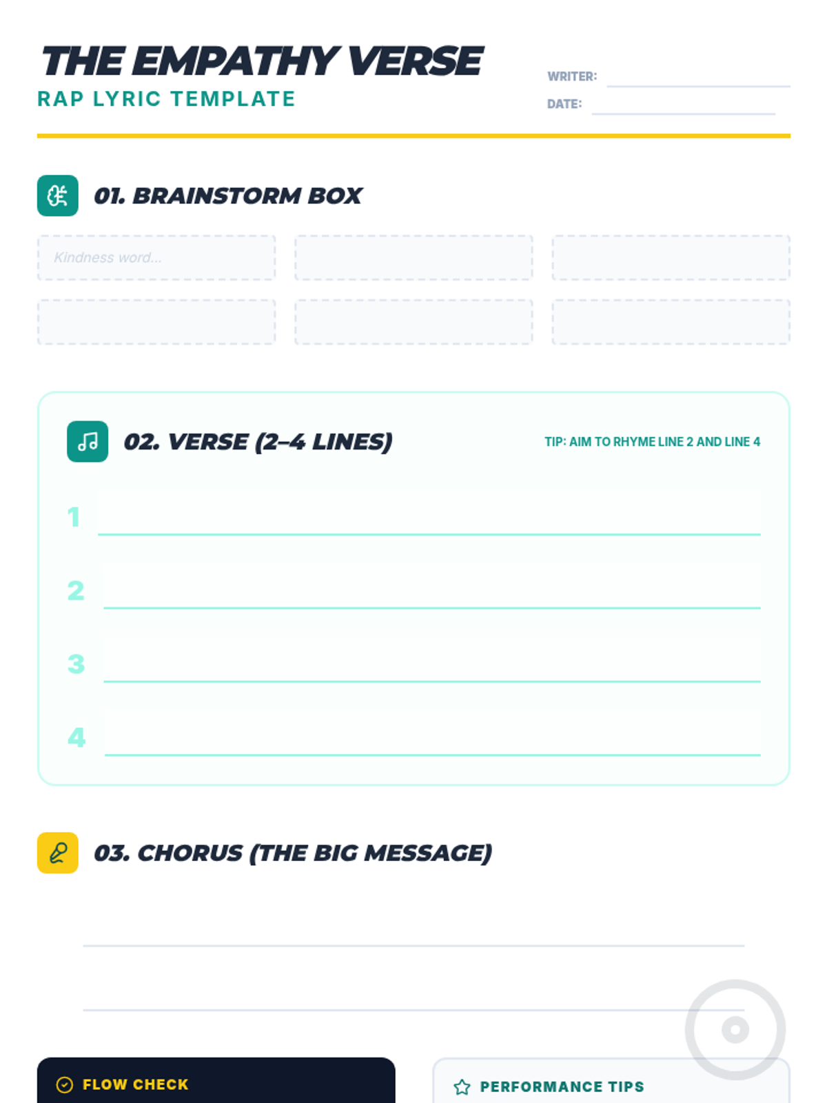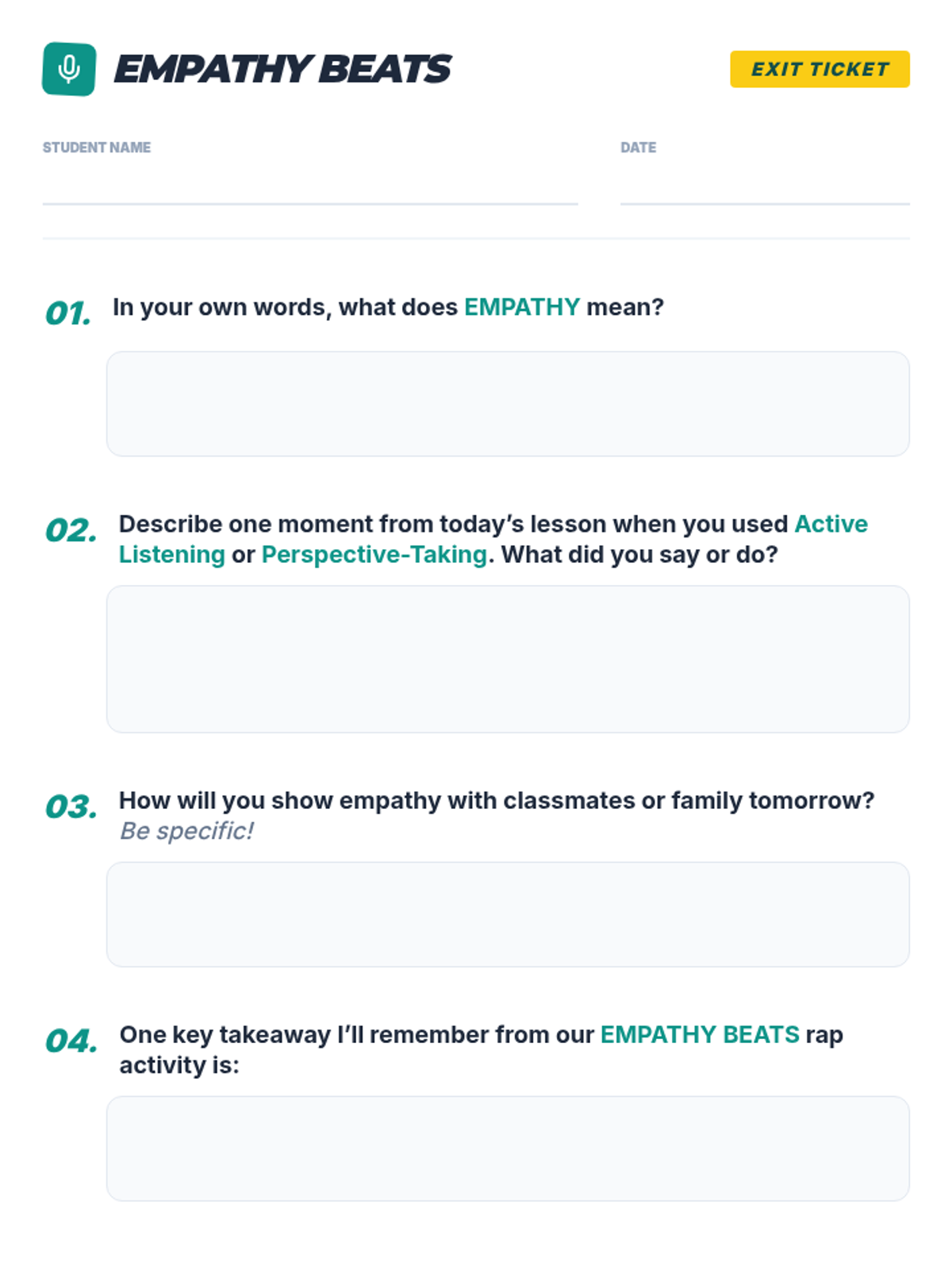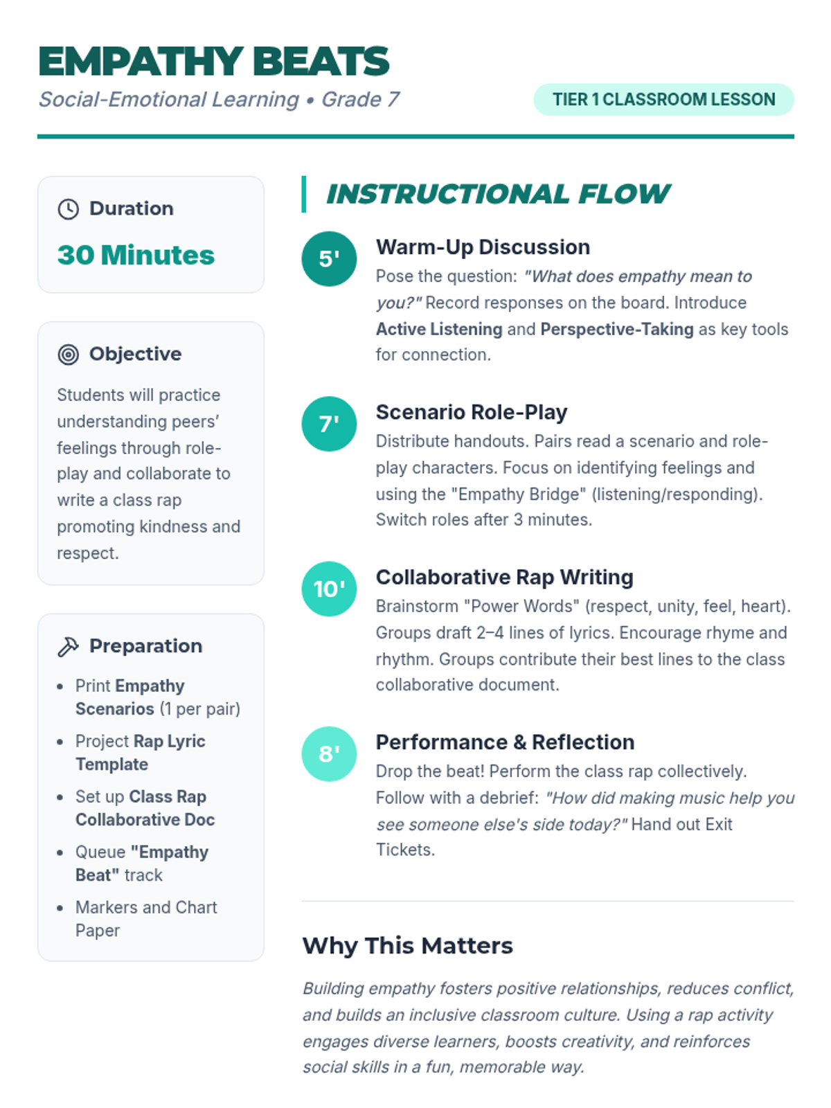 A 30-minute 7th grade SEL lesson that builds empathy, active listening, and perspective-taking through collaborative rap-writing and role-play.