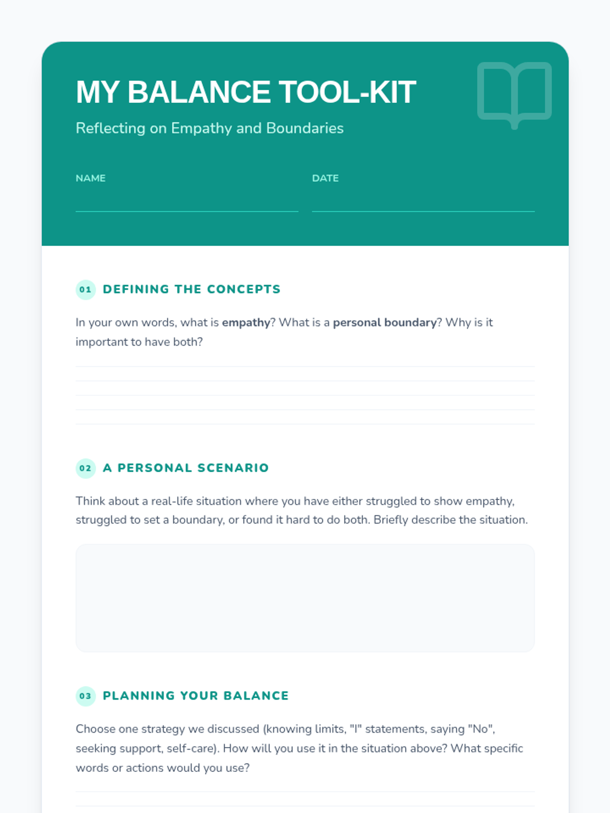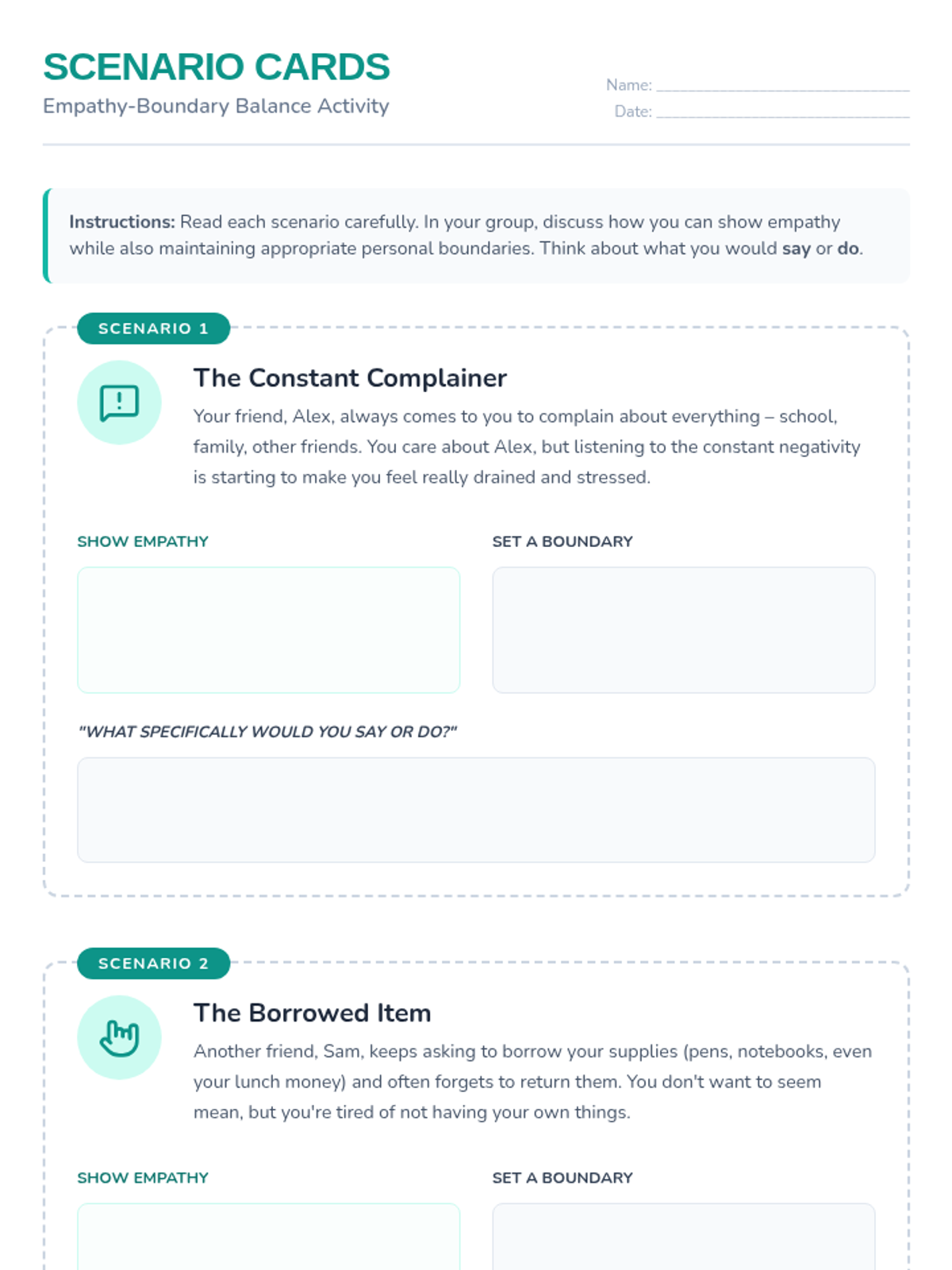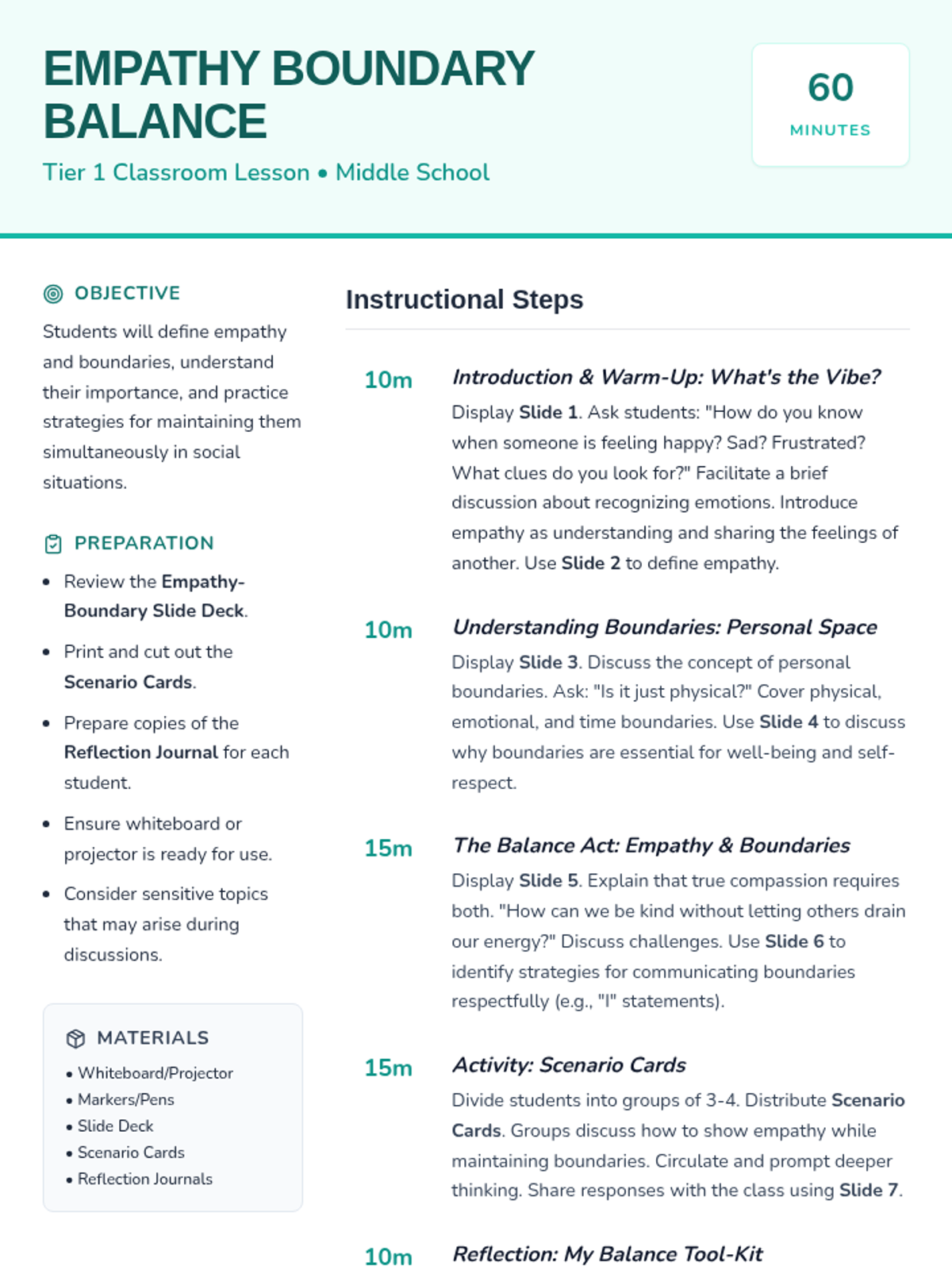 A 60-minute session for middle schoolers exploring the intersection of empathy and personal boundaries. Students learn to stay compassionate while protecting their own well-being through discussion, scenarios, and reflection.