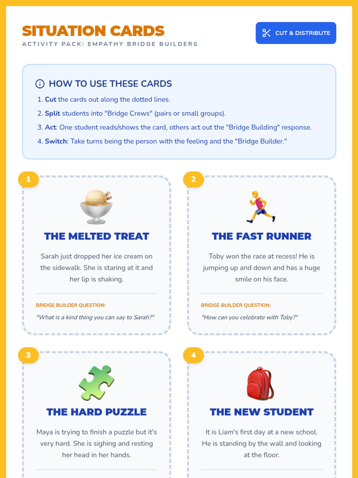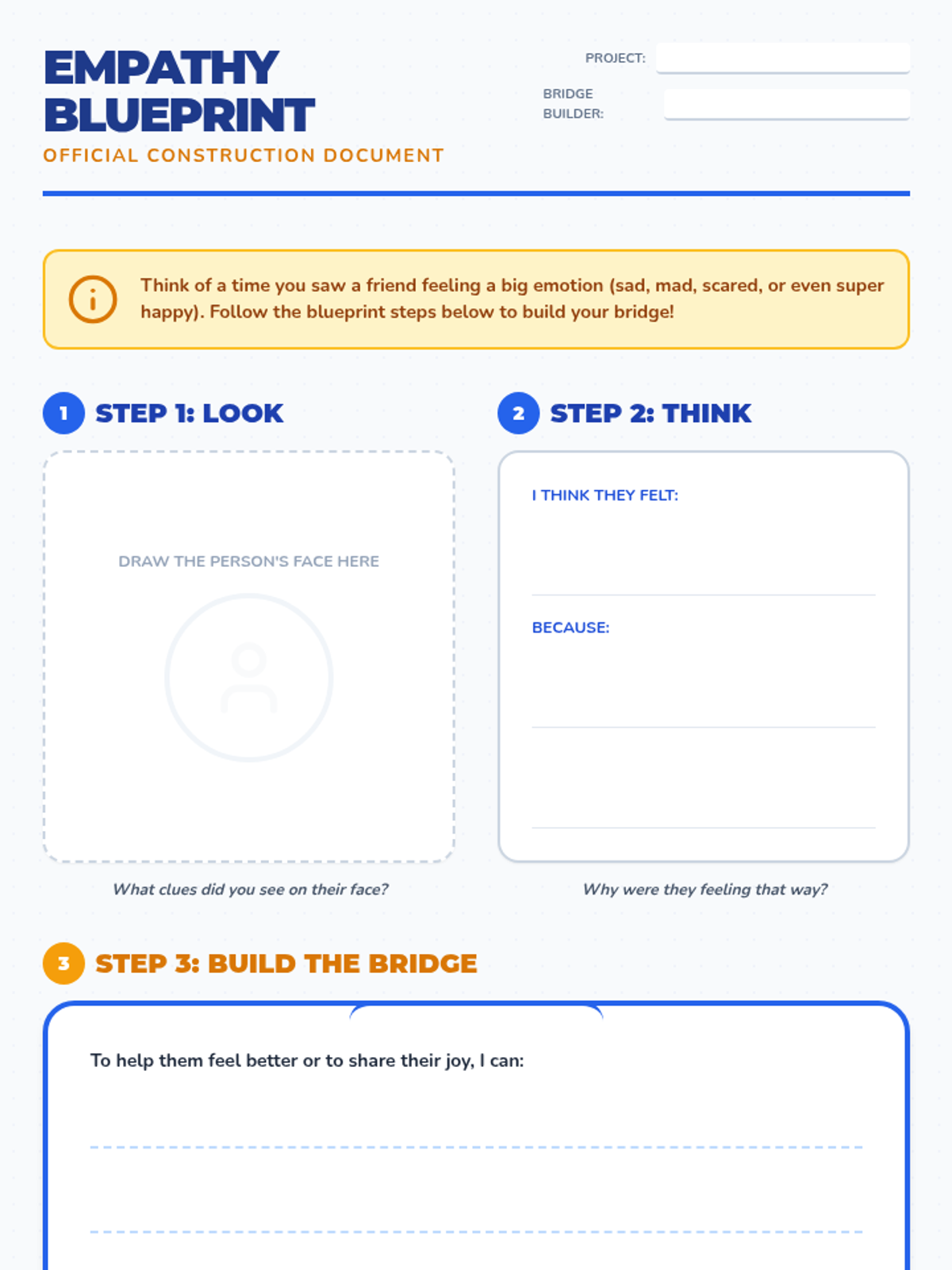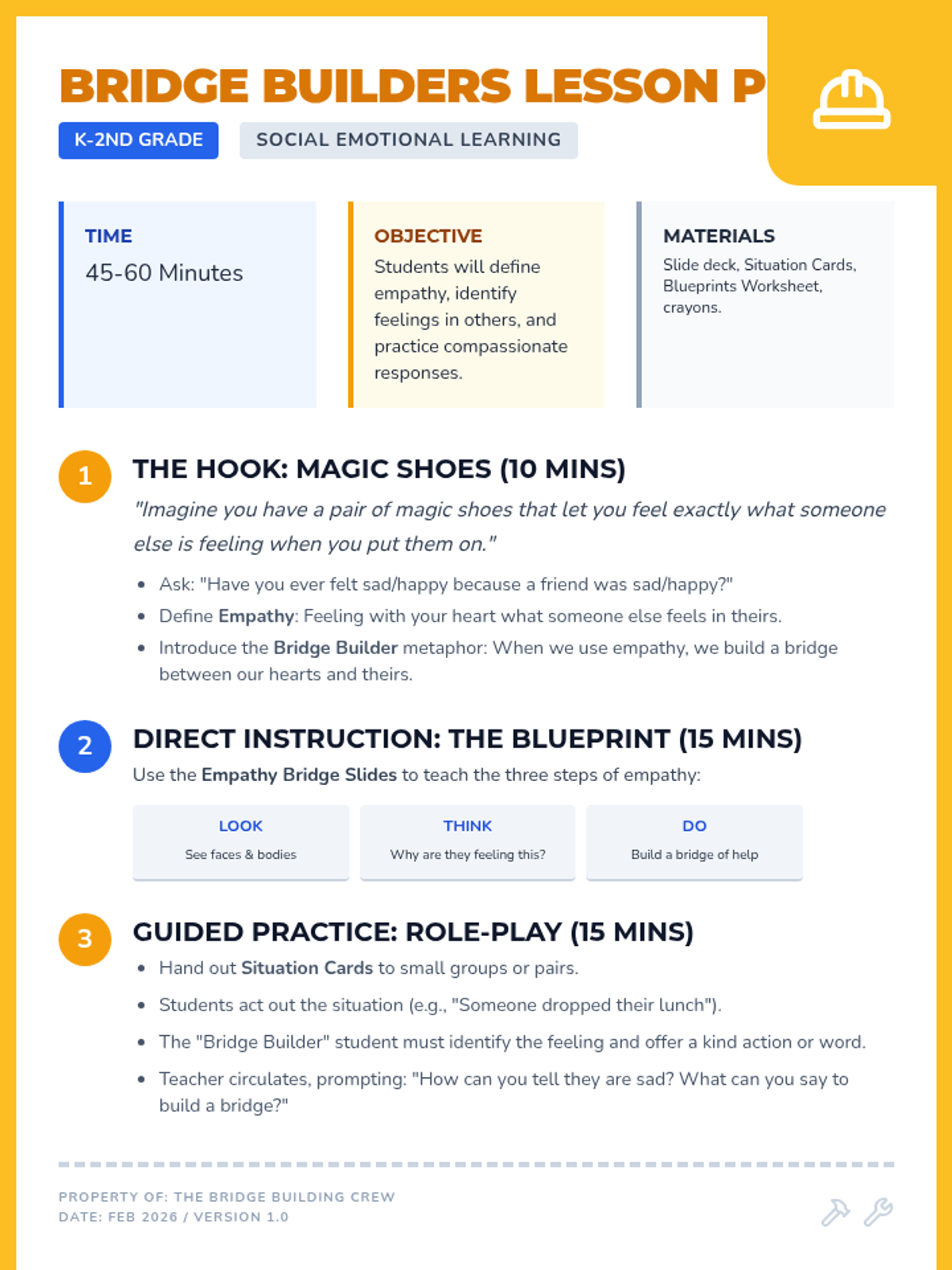 A lesson for K-2 students to develop empathy and perspective-taking skills through the metaphor of building bridges between people's feelings. Students will learn to recognize emotions, 'step into others' shoes,' and respond with compassion.