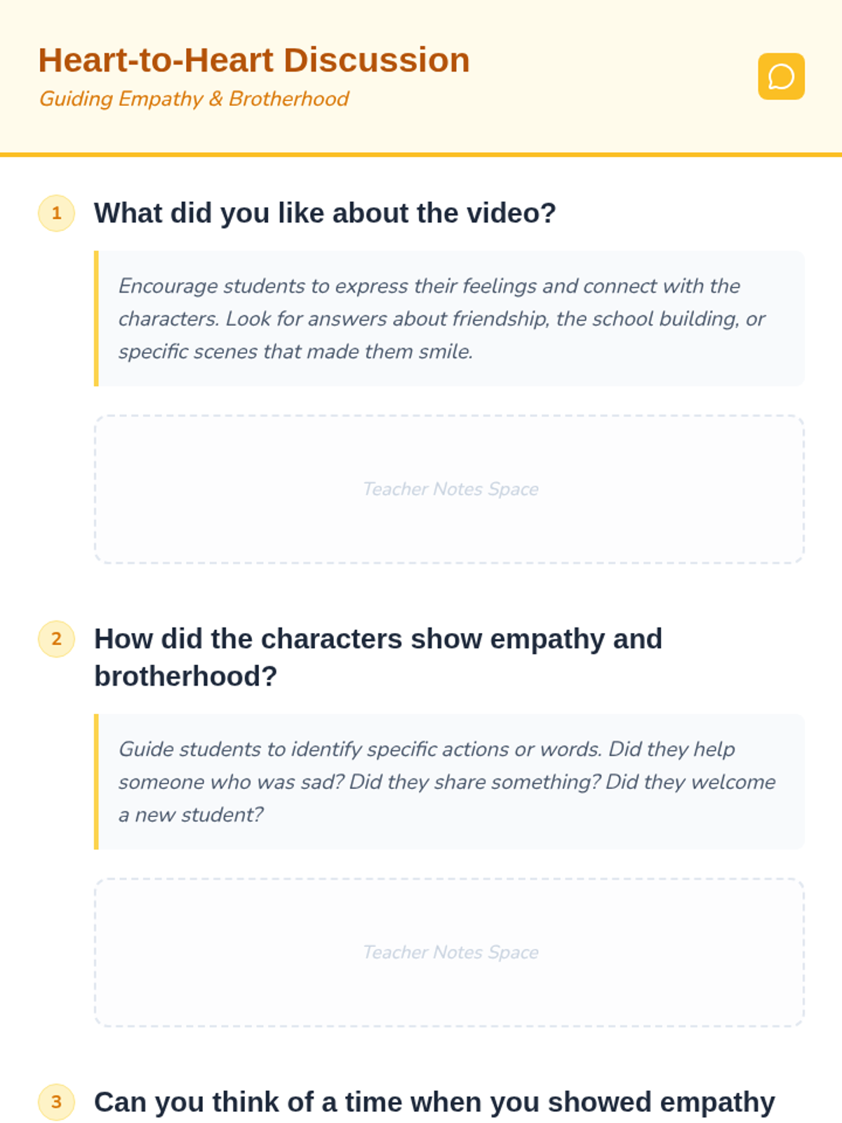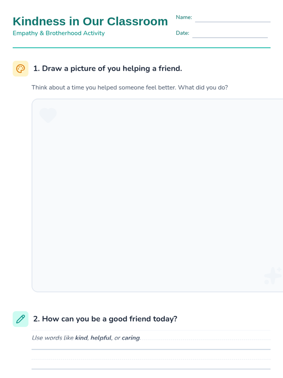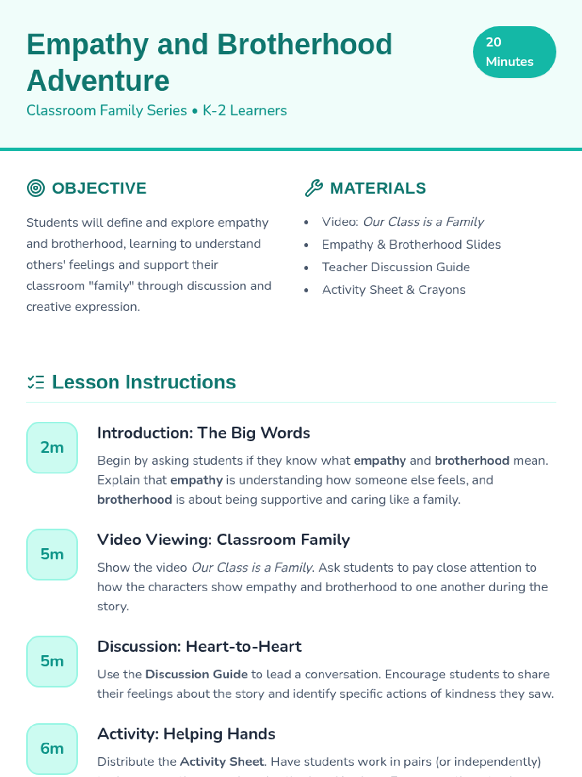 This lesson introduces K-2 students to empathy and brotherhood through a video story, guided discussion, and collaborative drawing activity, fostering a supportive classroom family.