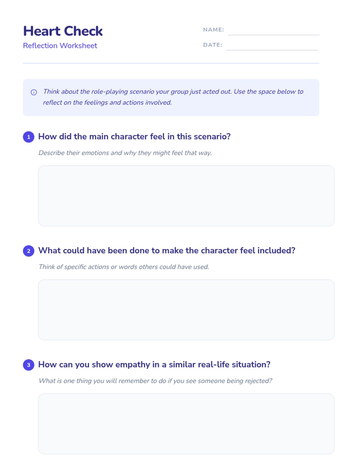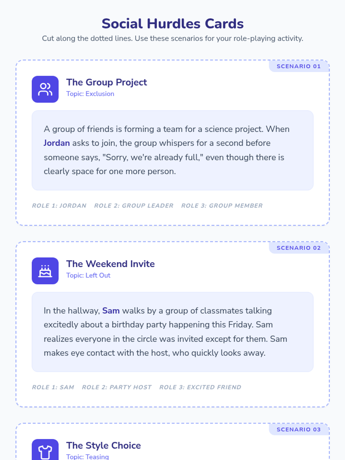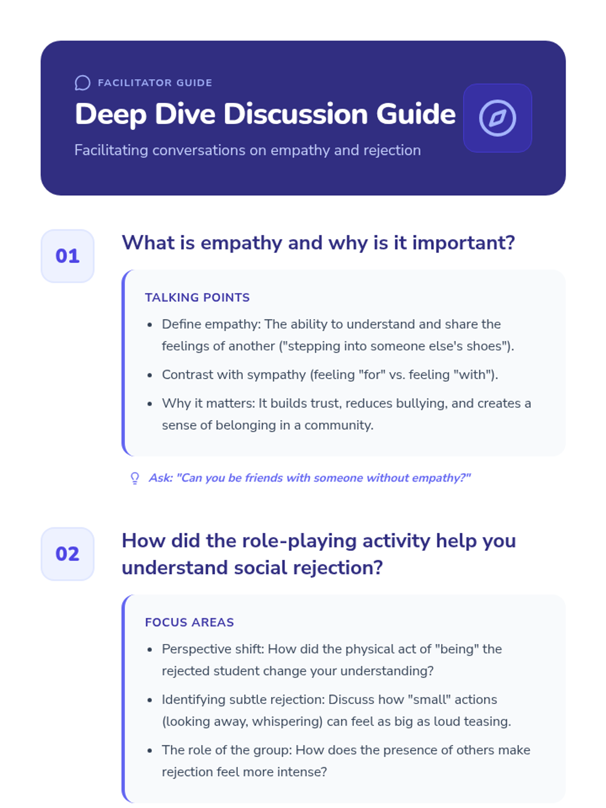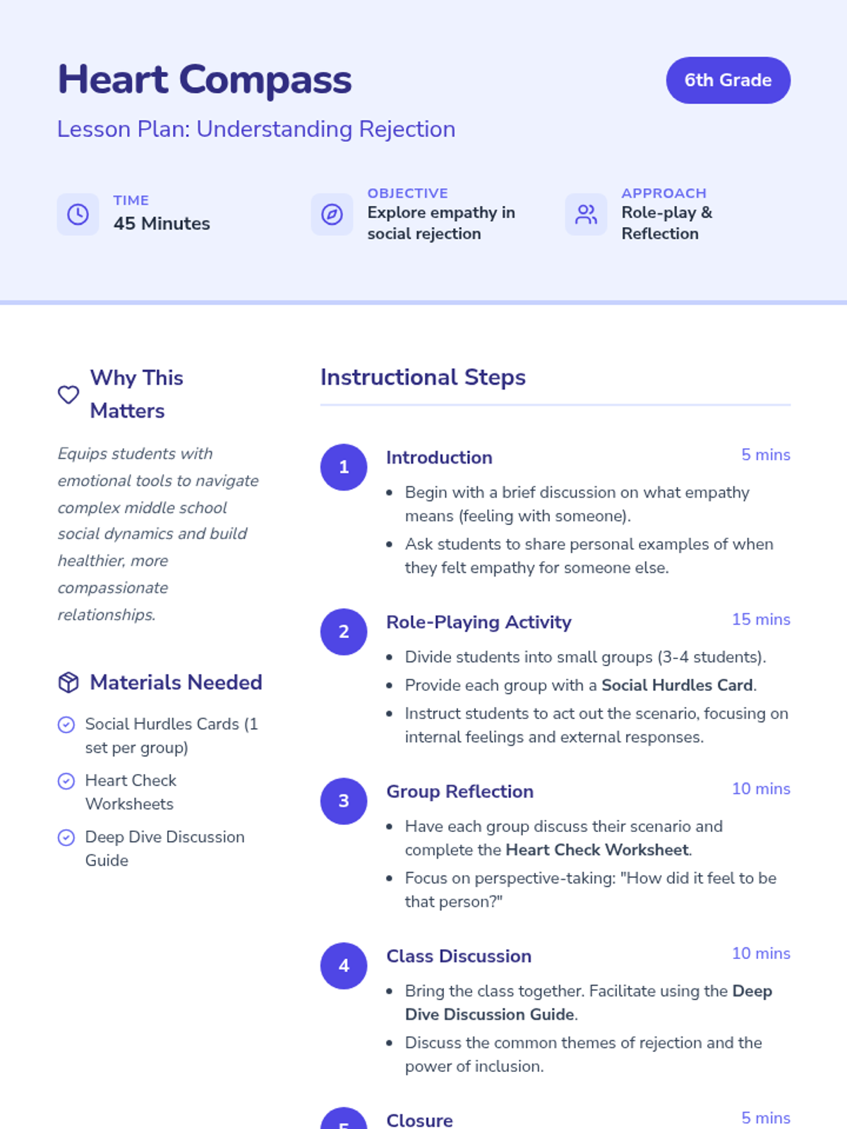 A middle school lesson focused on building empathy by exploring social rejection through role-playing and reflective exercises. Students develop emotional tools to navigate social dynamics and foster compassion.