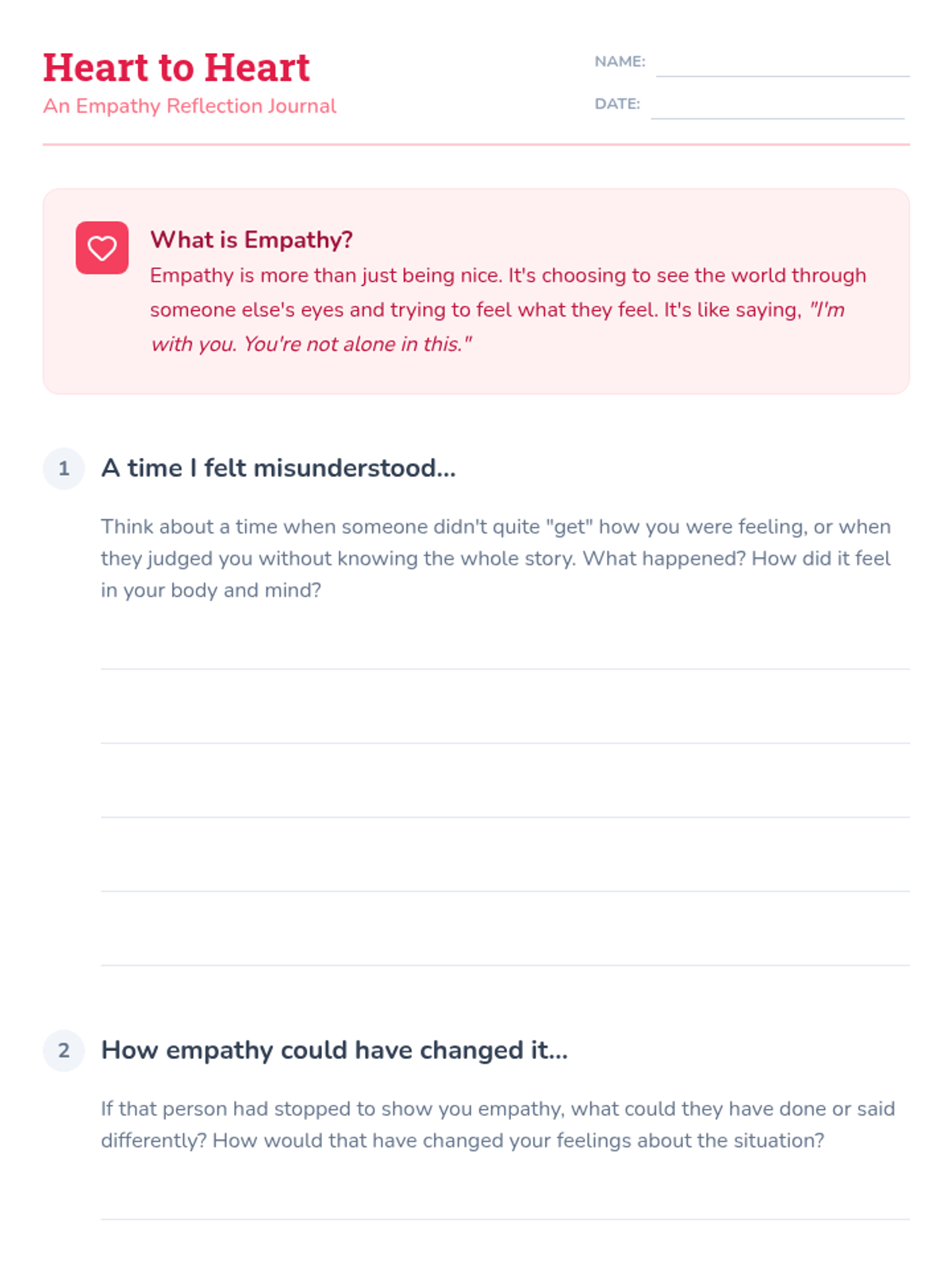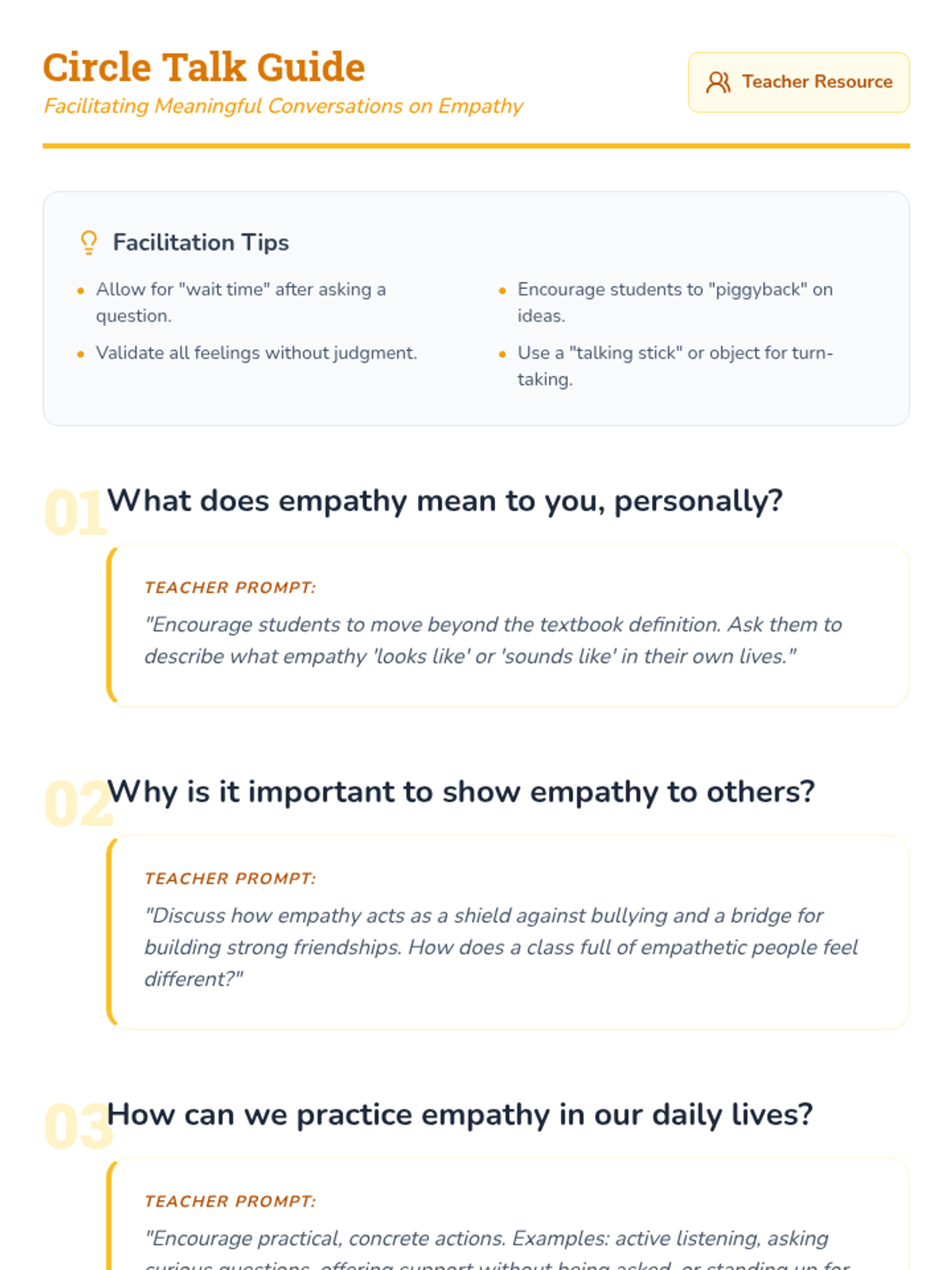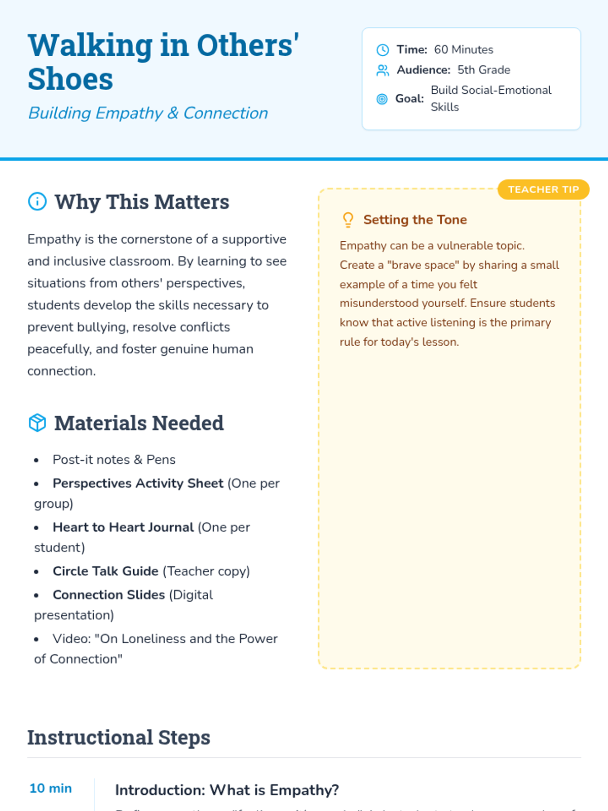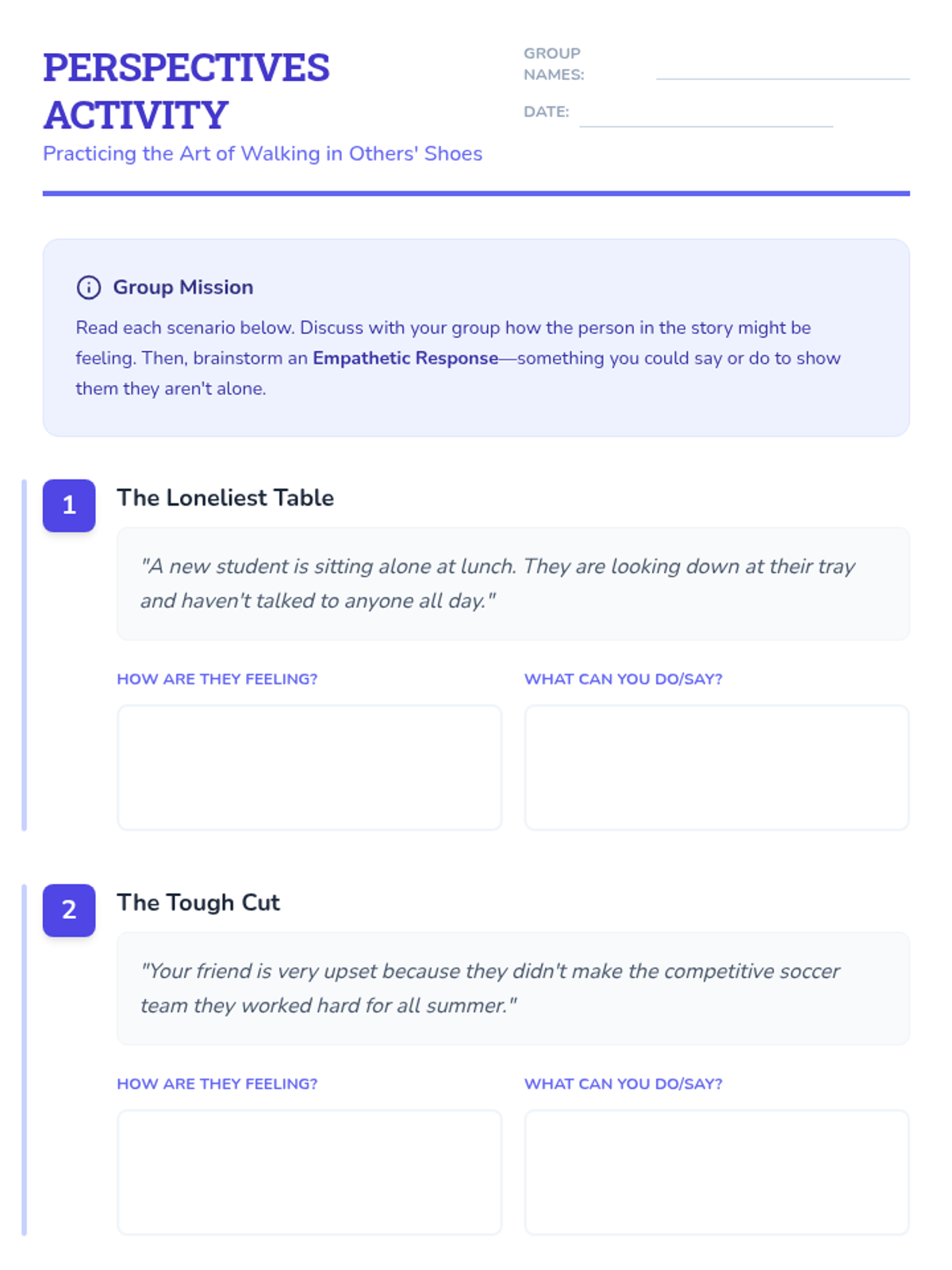 Students engage in activities to build empathy and understanding through reflections, group discussions, and a video on connection, fostering an inclusive classroom environment.