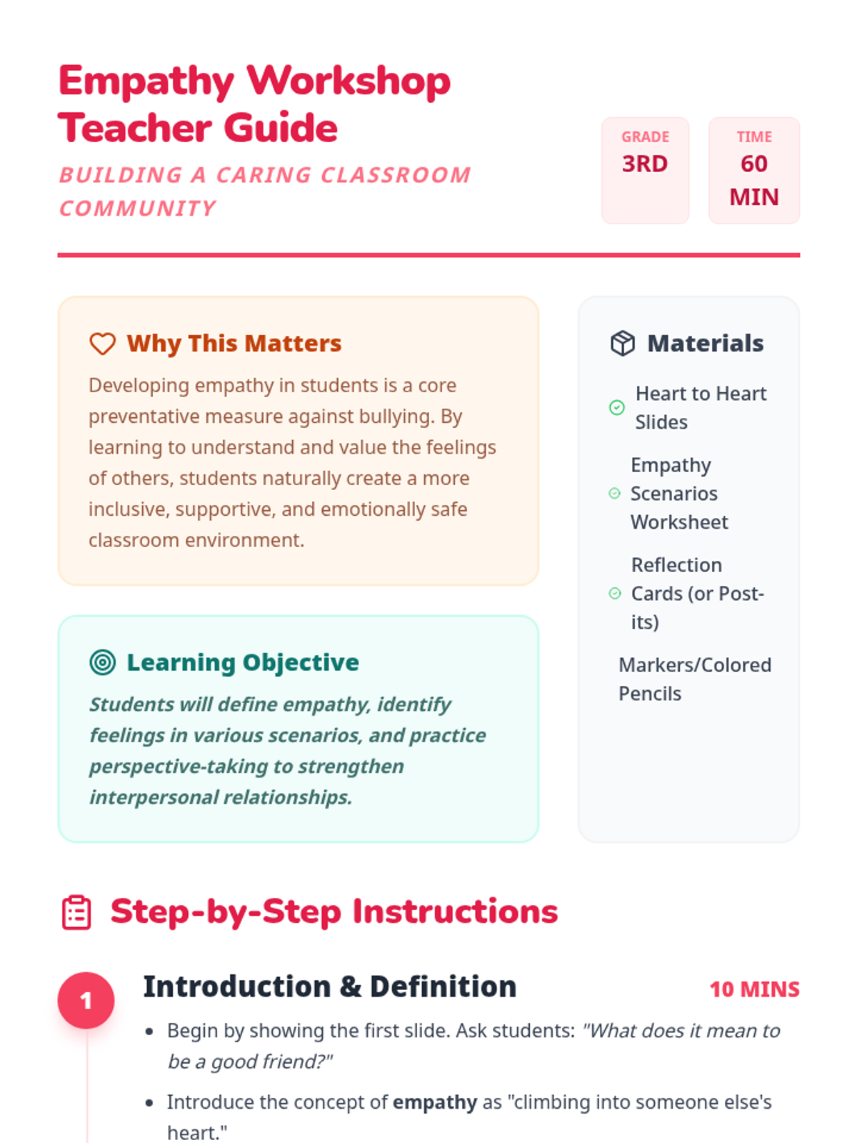 This lesson focuses on developing empathy among 3rd-grade students through guided activities and group discussions. Students will learn to understand others' feelings and perspectives to foster a supportive classroom environment.
