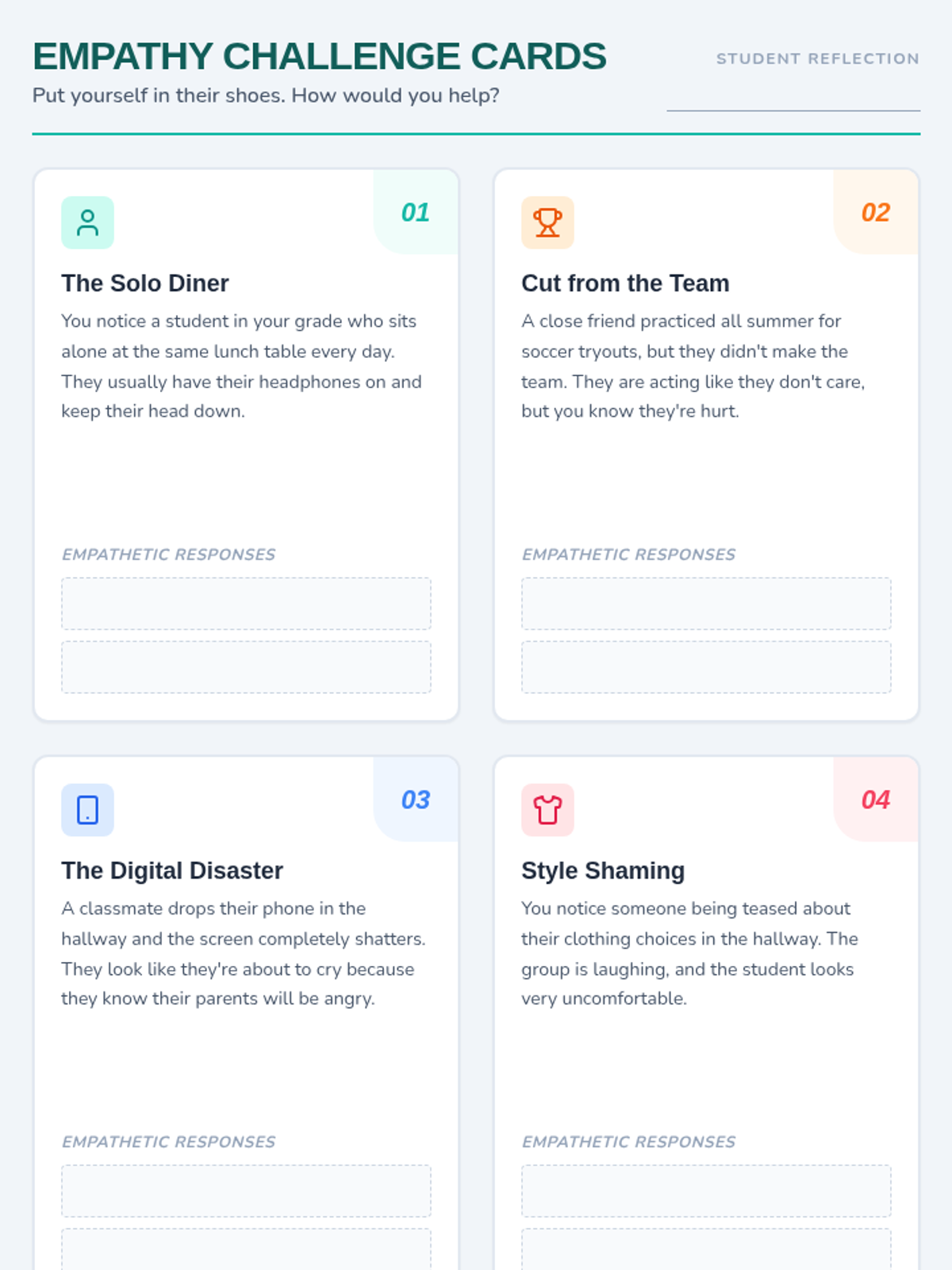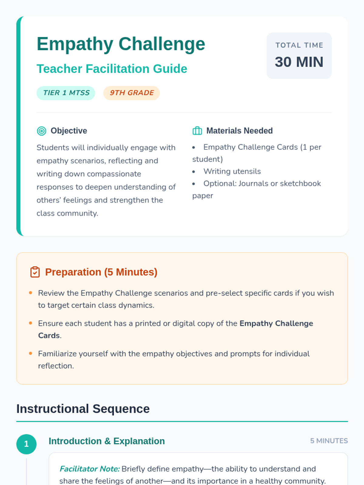 A 30-minute Tier 1 MTSS session for 9th-grade students to practice creative and compassionate problem-solving through empathy scenarios.