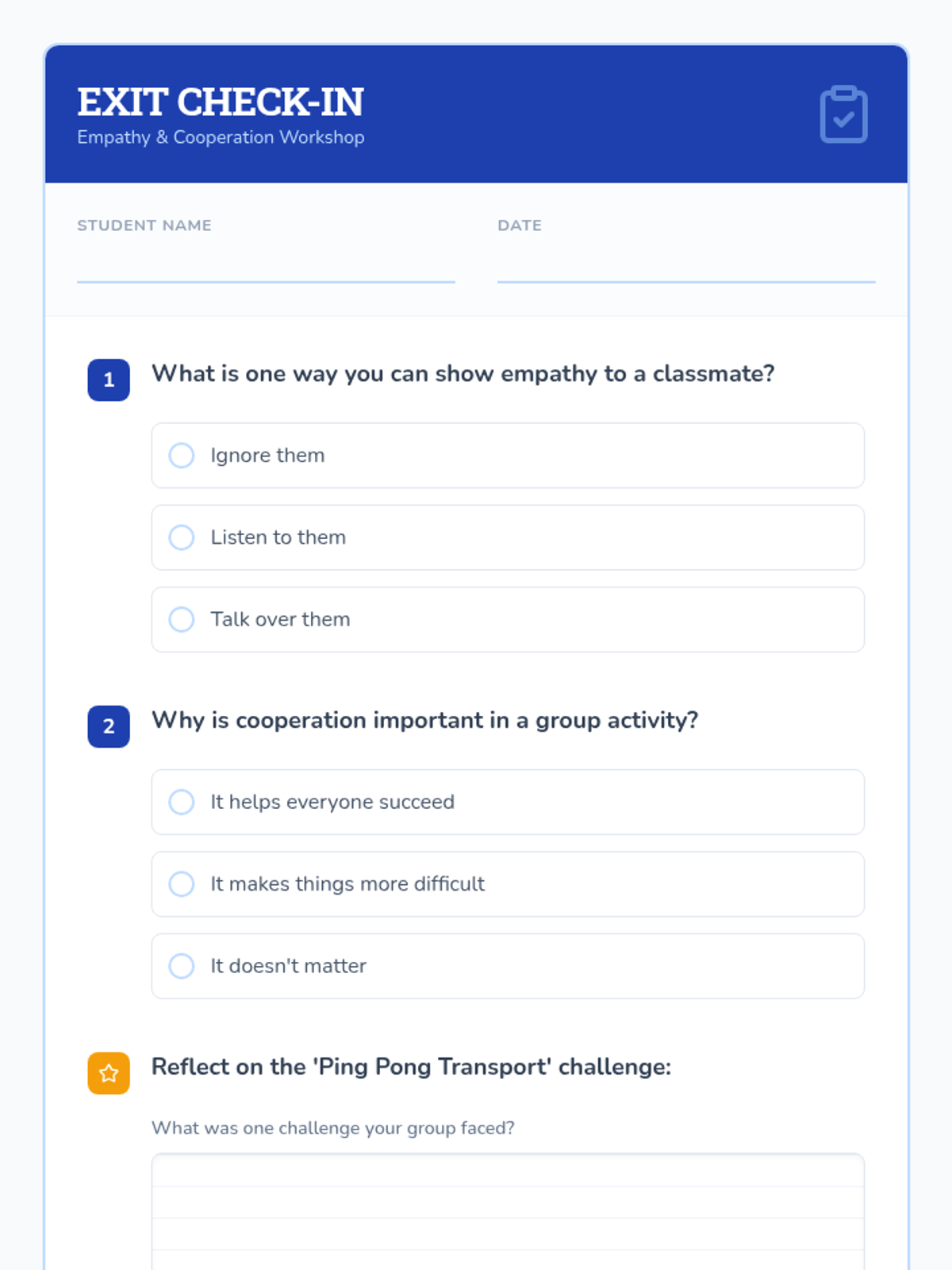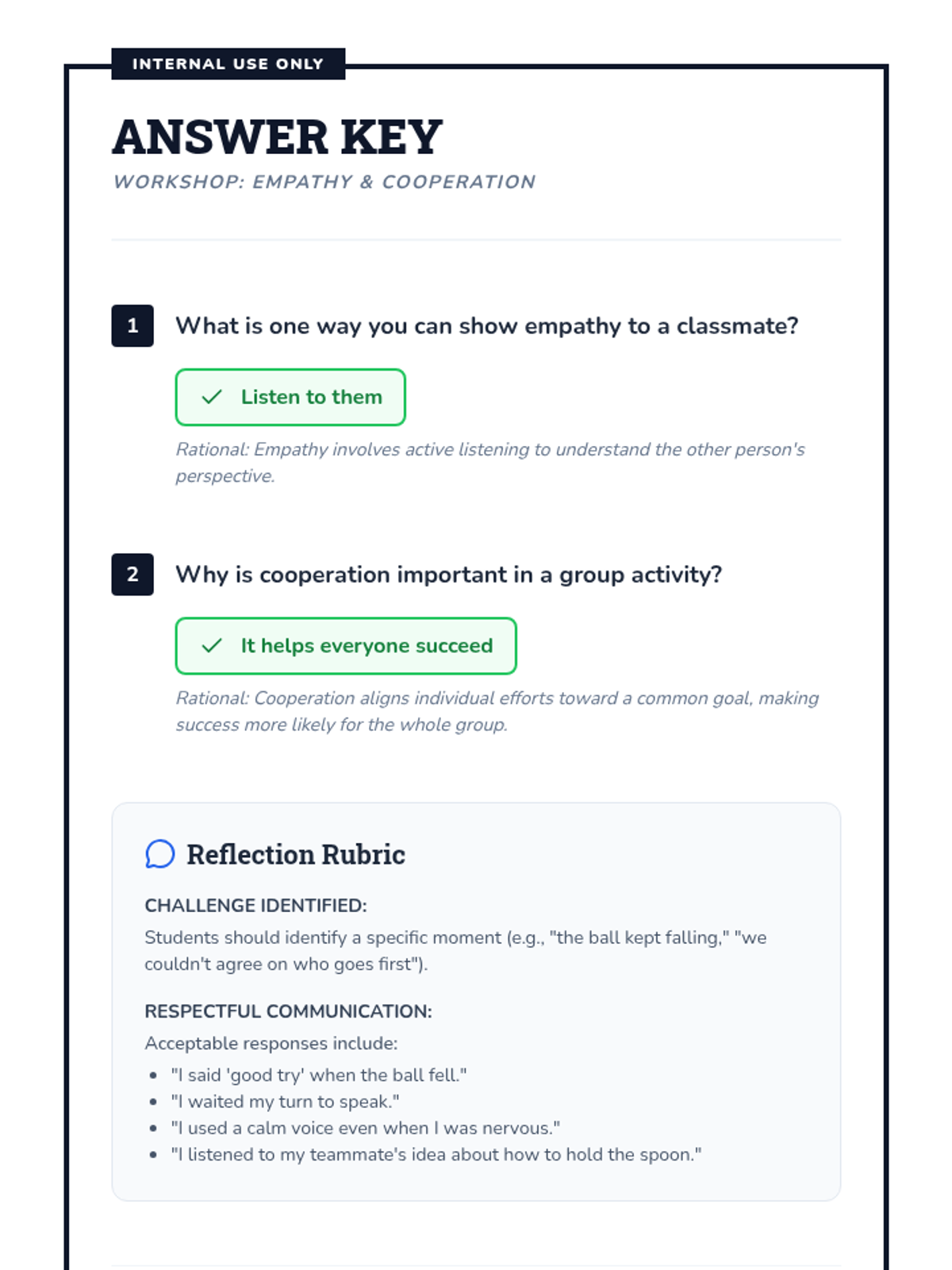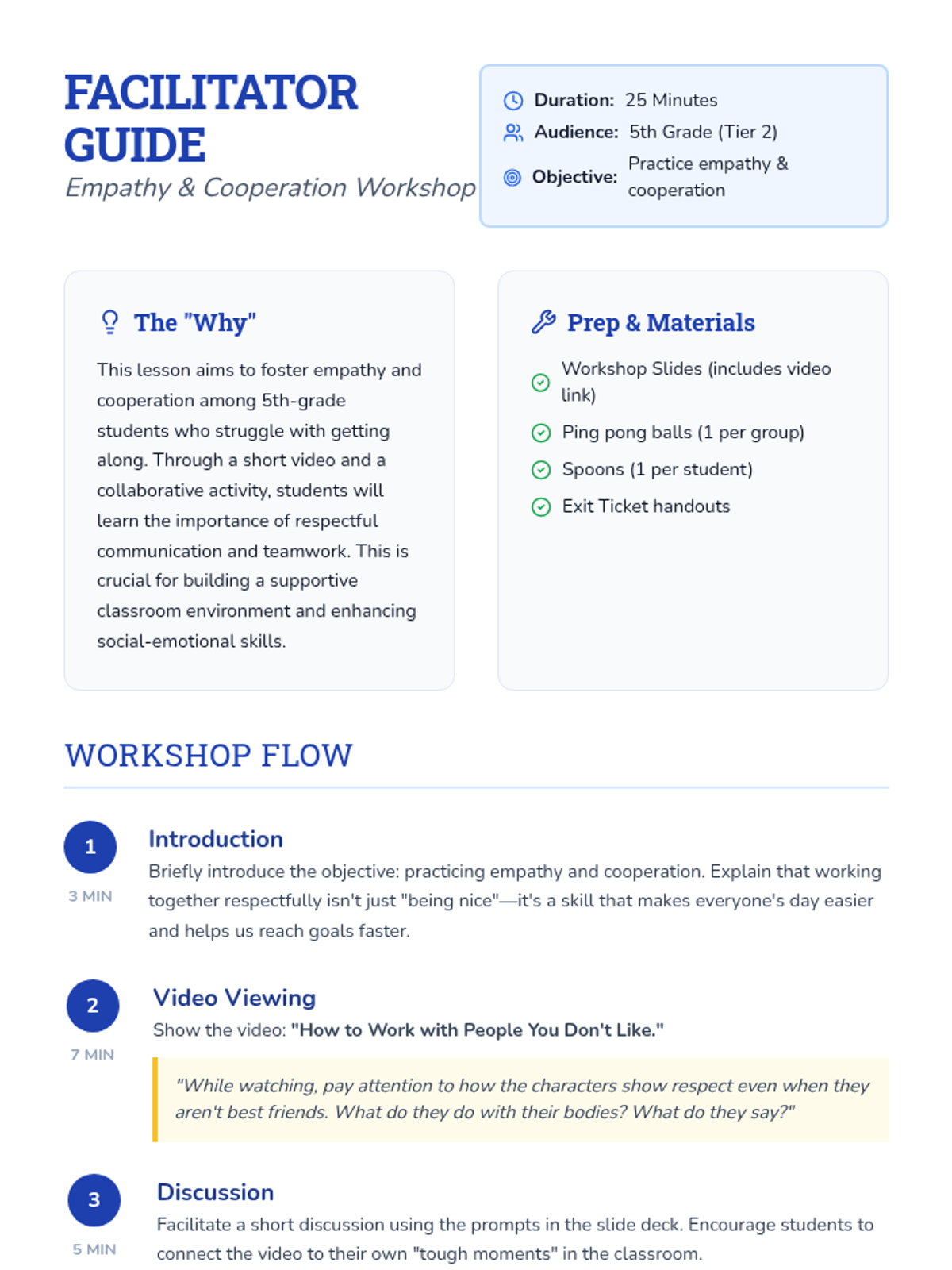 A 25-minute Tier 2 workshop for 5th-grade students focused on developing empathy and cooperative skills through video analysis, guided discussion, and a hands-on teamwork challenge.