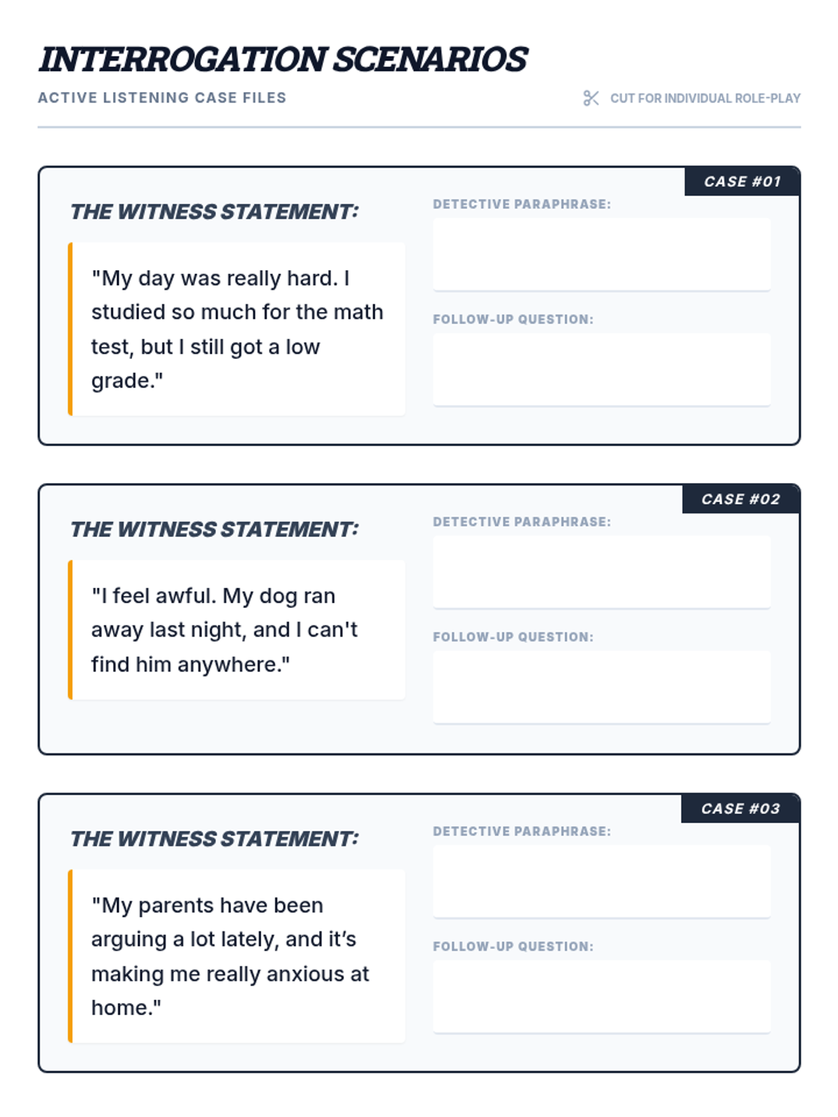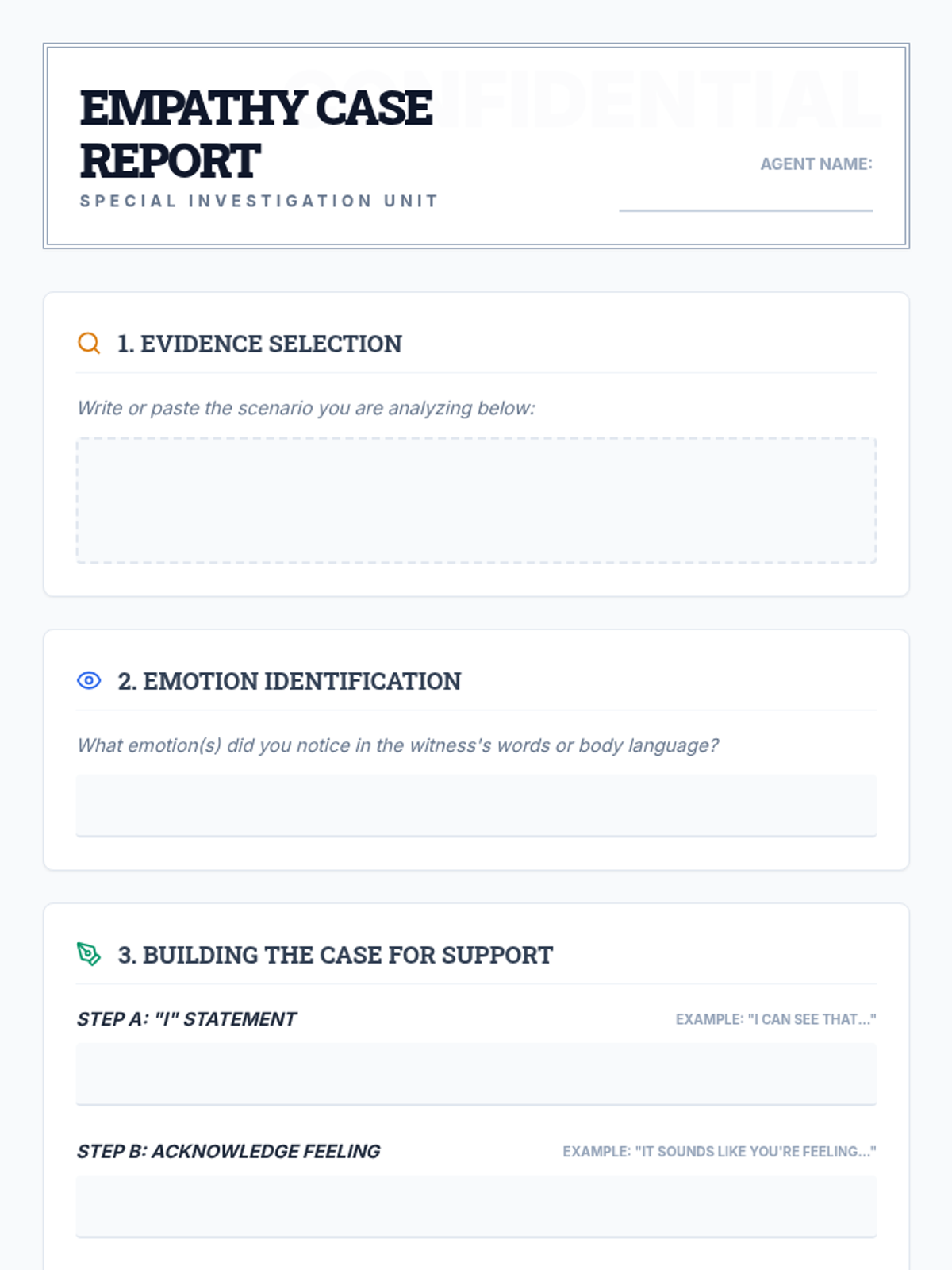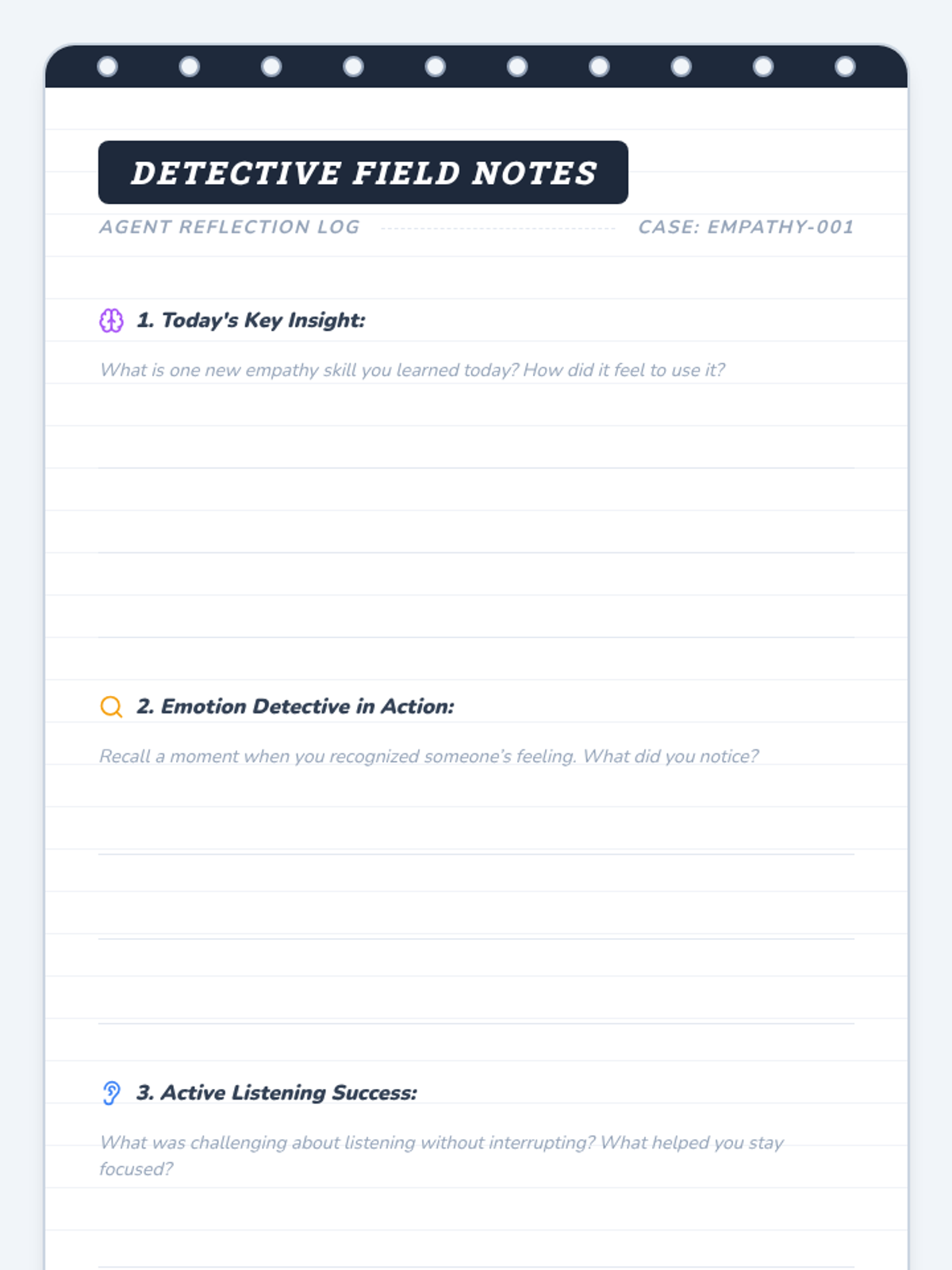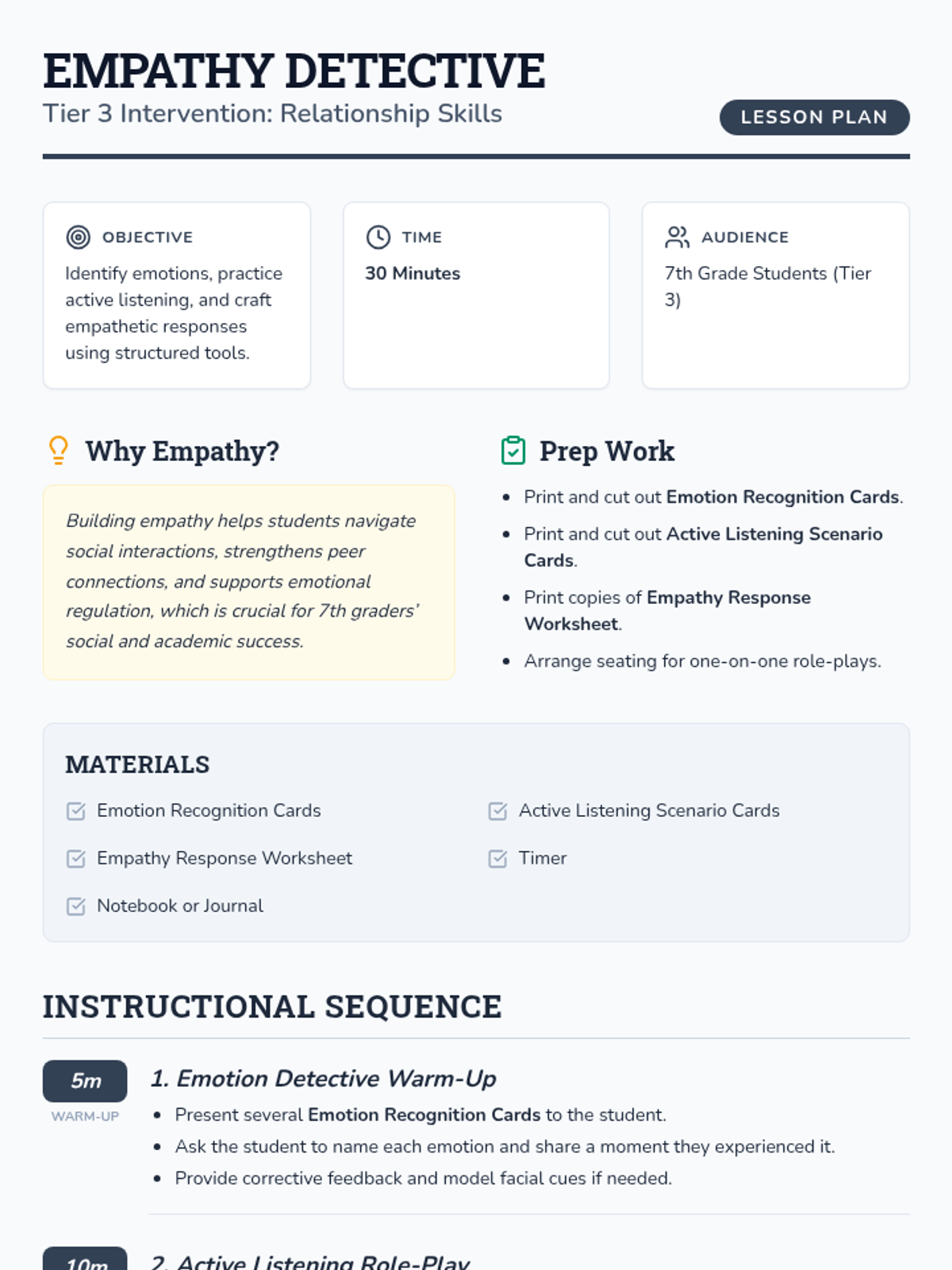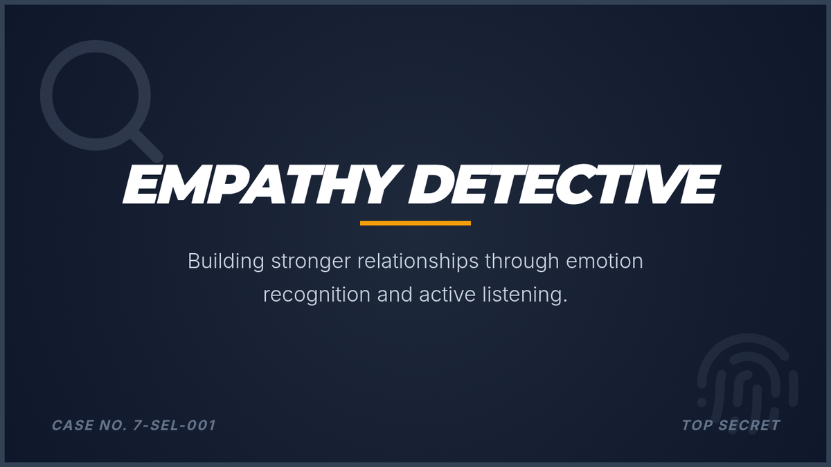 A 30-minute Tier 3 lesson for 7th graders focusing on relationship skills. Students will learn to recognize emotions, practice active listening, and craft supportive responses through a 'detective' lens.