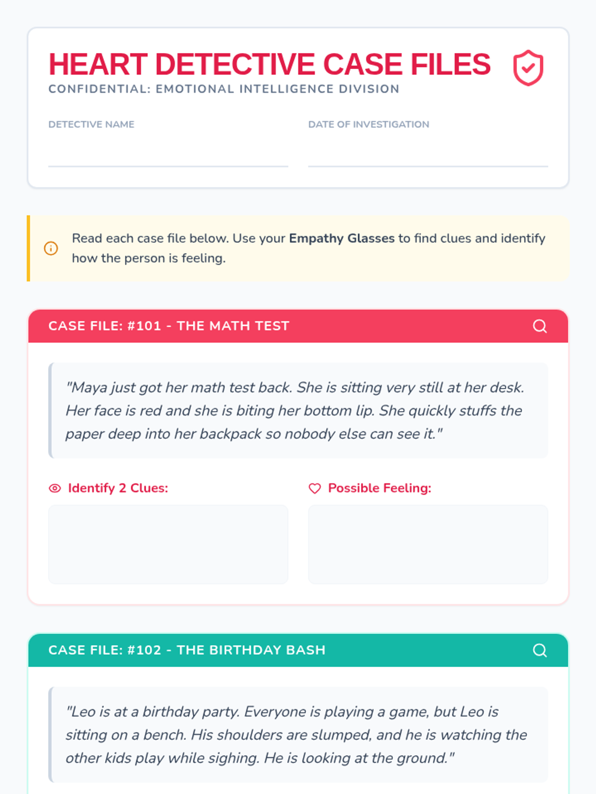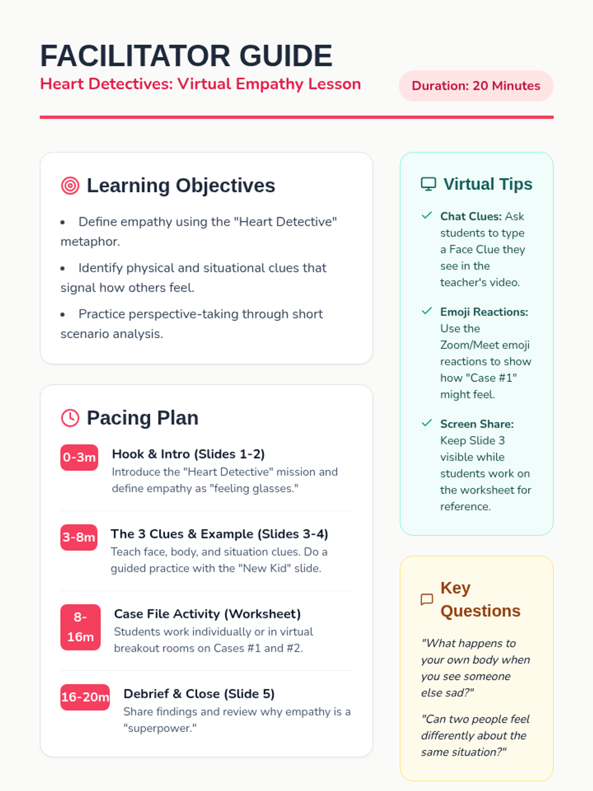 A 20-minute introductory lesson on empathy for virtual students, using a 'Heart Detectives' theme to learn how to identify and understand the feelings of others.