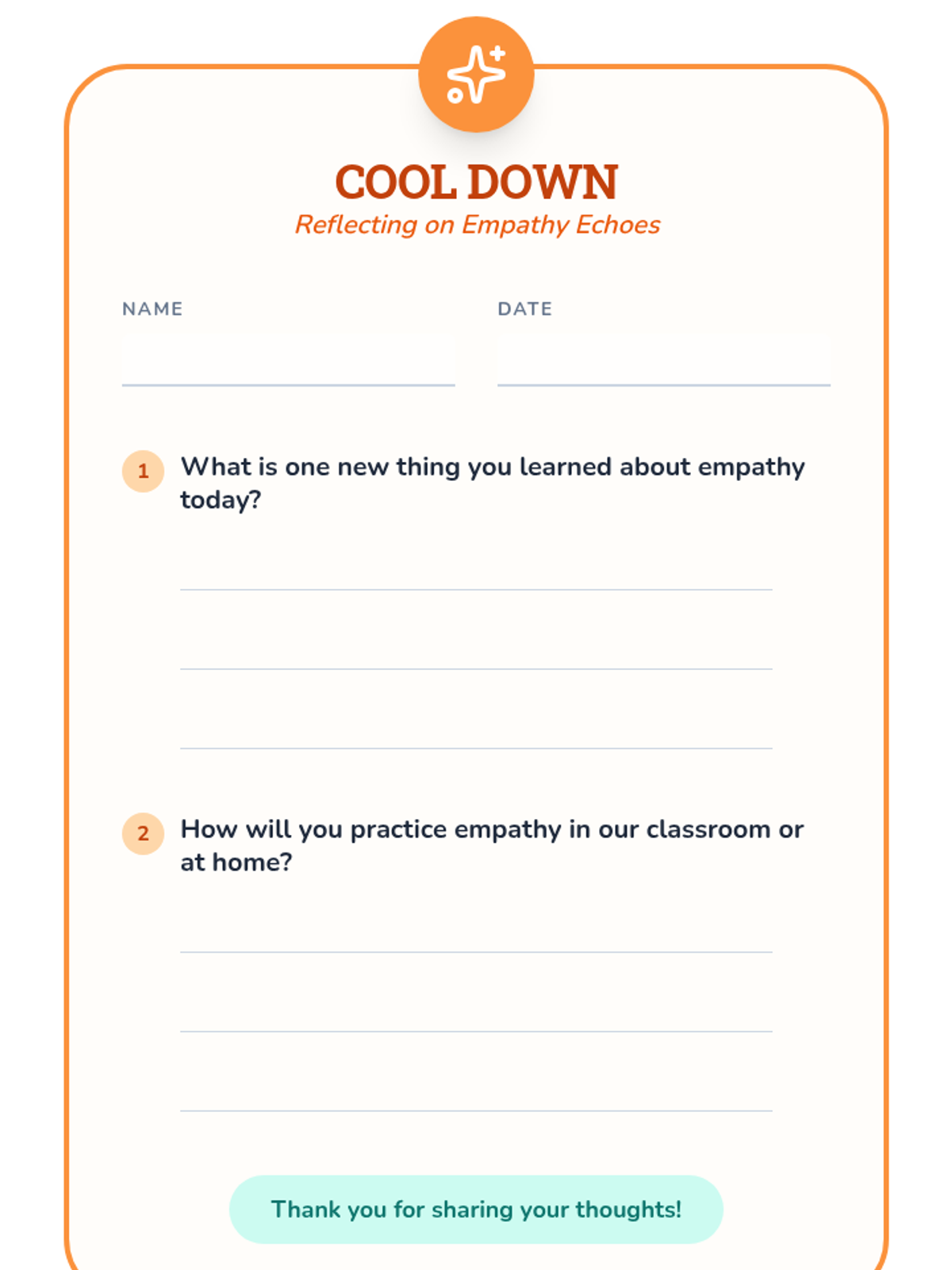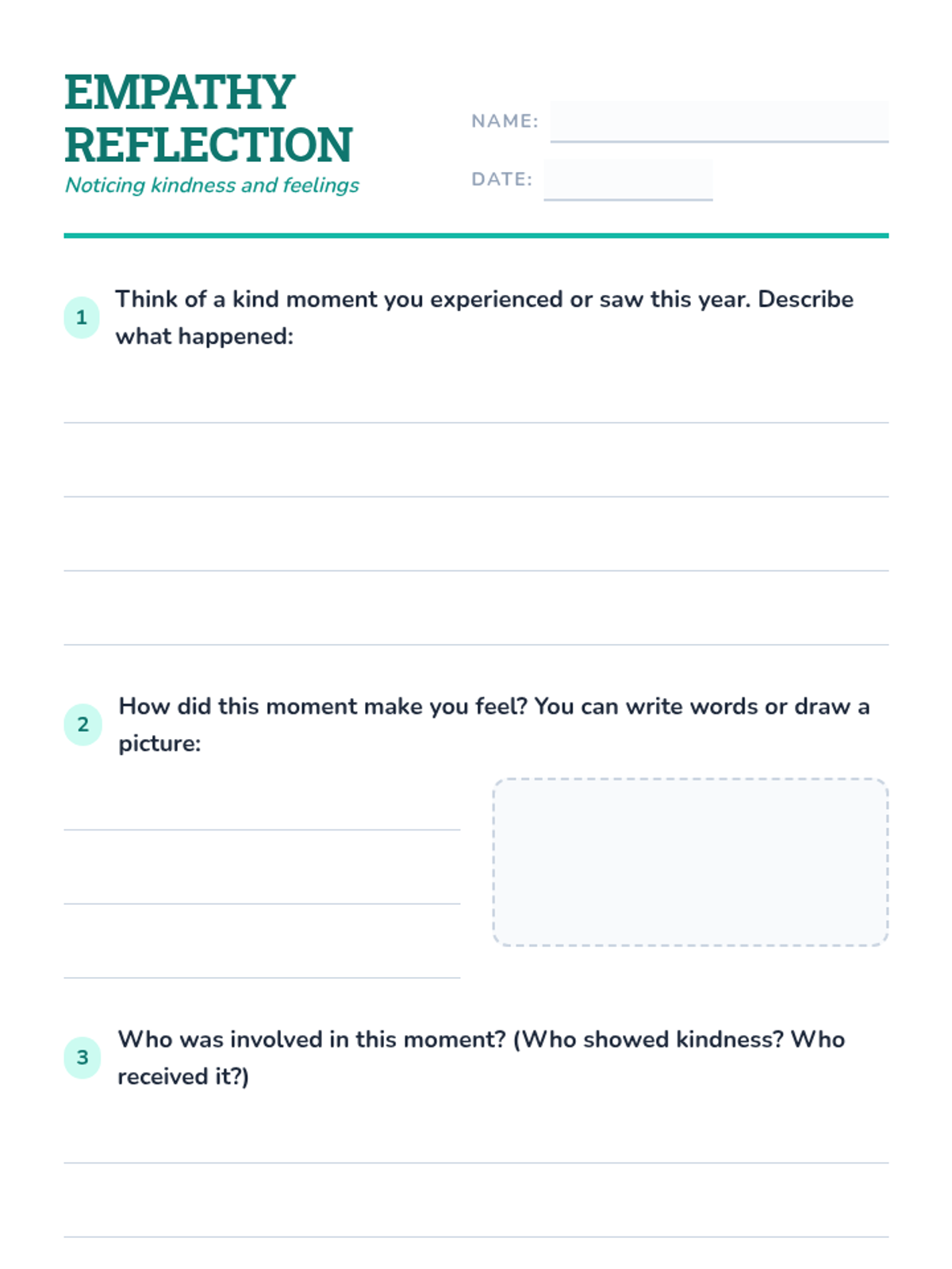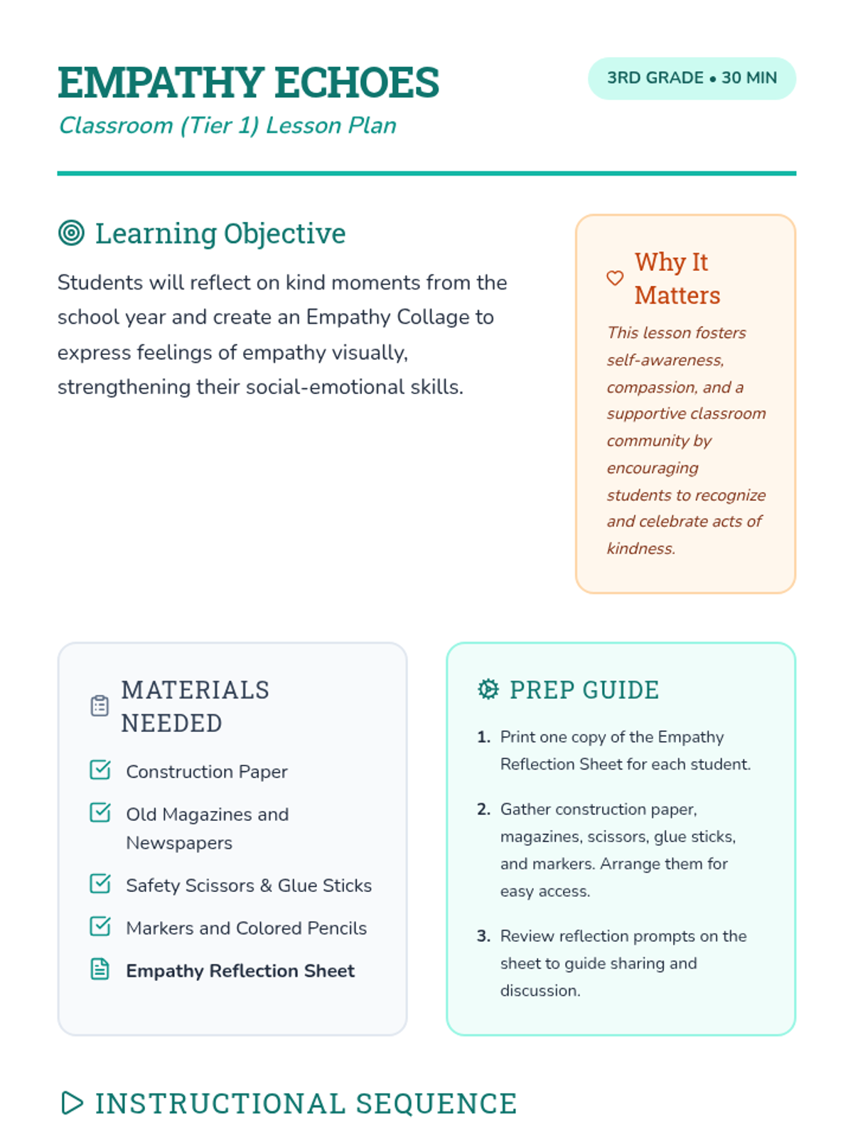 A 30-minute 3rd-grade lesson focusing on empathy through reflection and a creative collage activity. Students explore kind moments and feelings to foster a supportive classroom community.