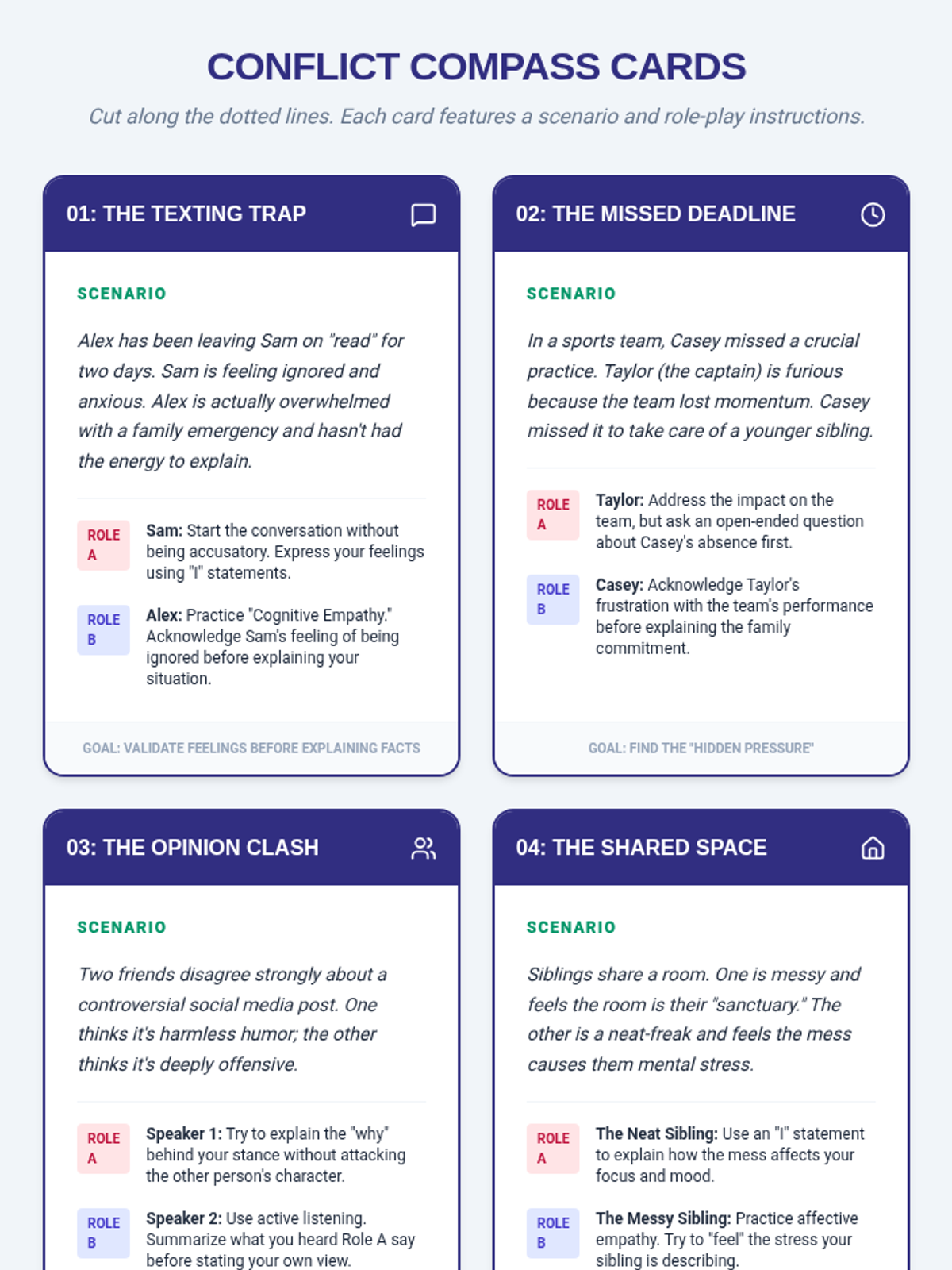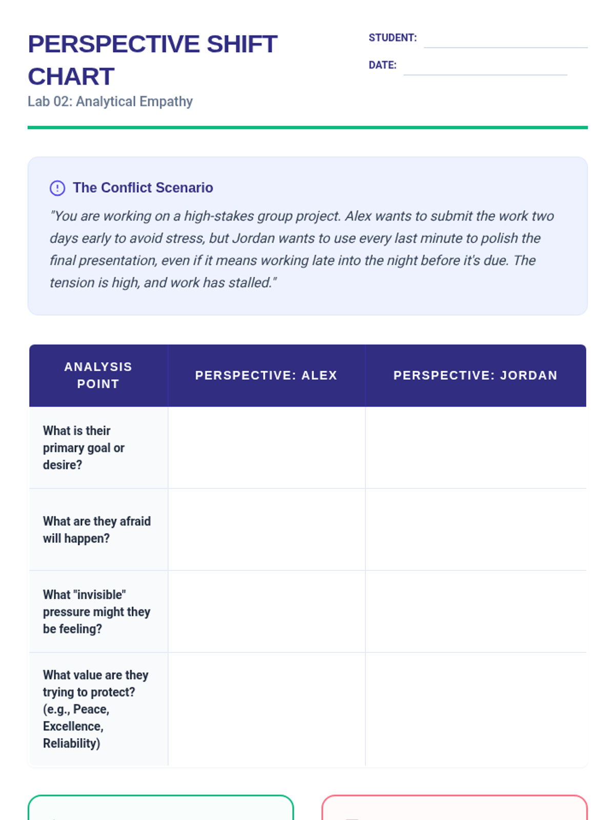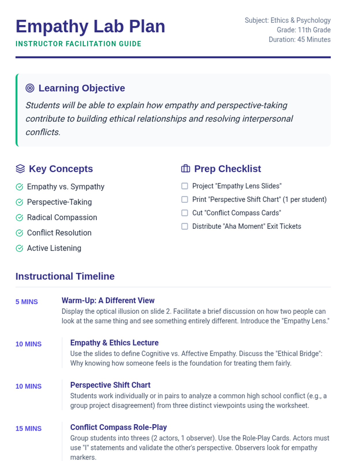 A comprehensive 45-minute lesson for 11th grade students on the role of empathy and perspective-taking in ethical relationships and conflict resolution. Students engage in discussions, analysis, and role-play to develop interpersonal skills.