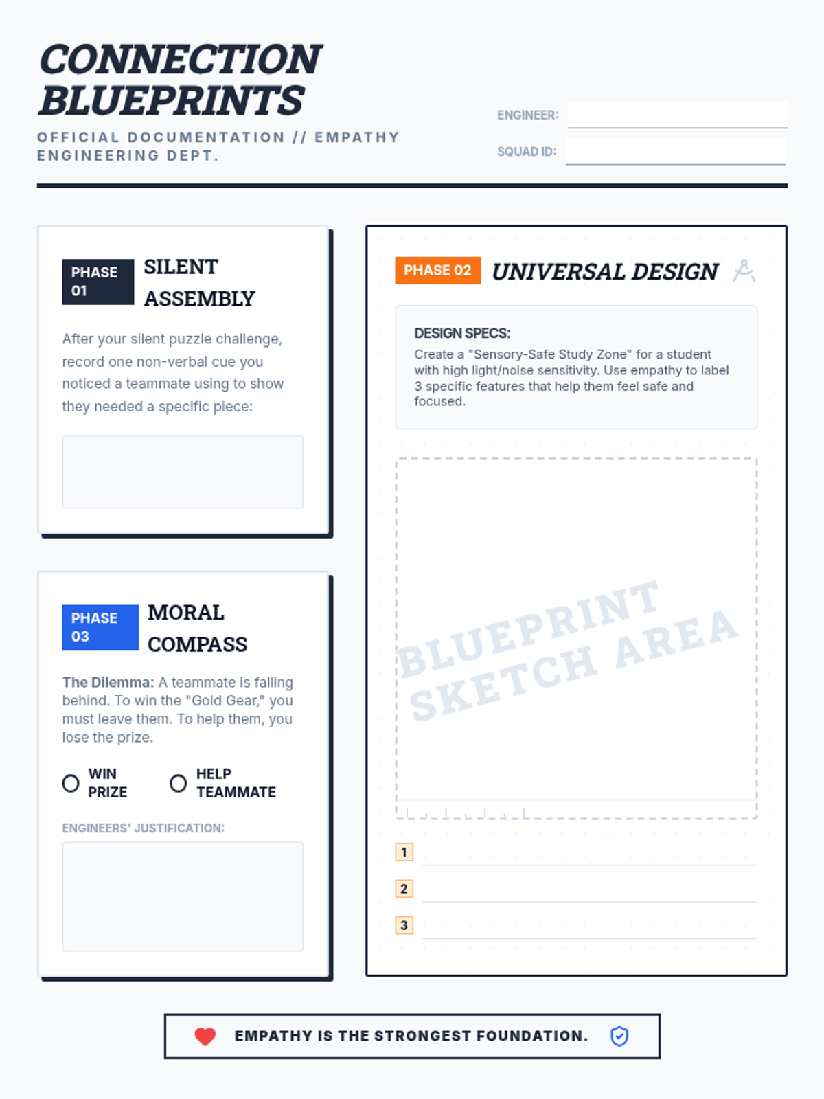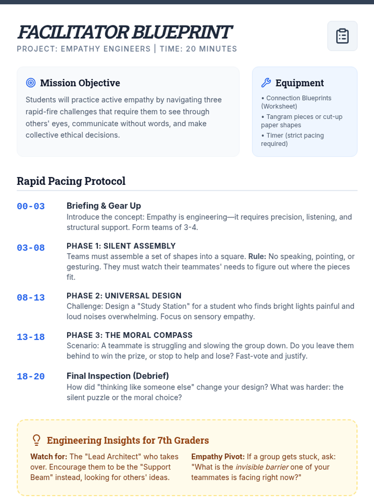 A high-energy, 20-minute SEL lesson for 7th graders focused on building empathy through rapid team-based design, non-verbal cooperation, and scenario-based decision making. Students act as 'Empathy Engineers' to solve social and structural puzzles.