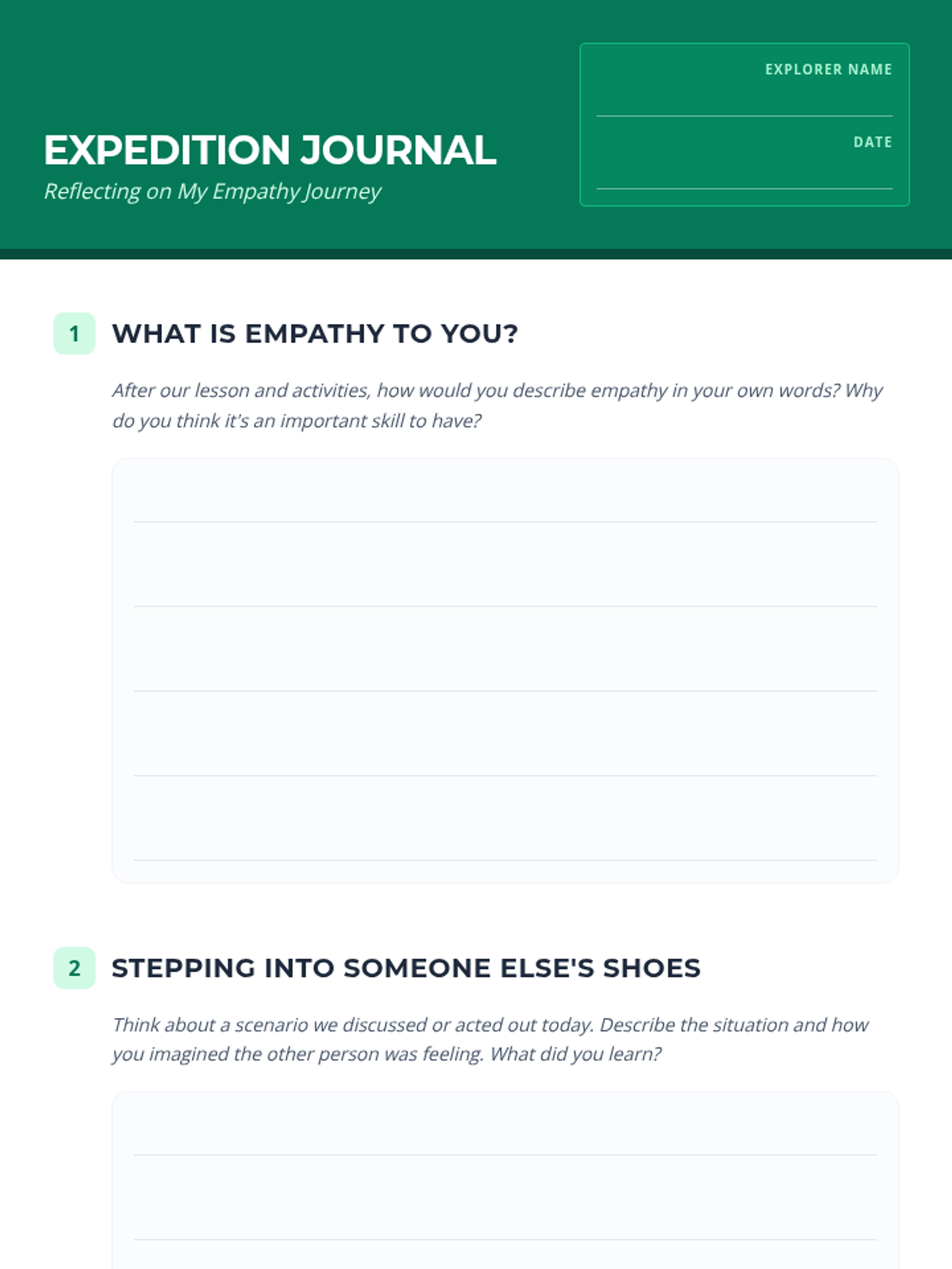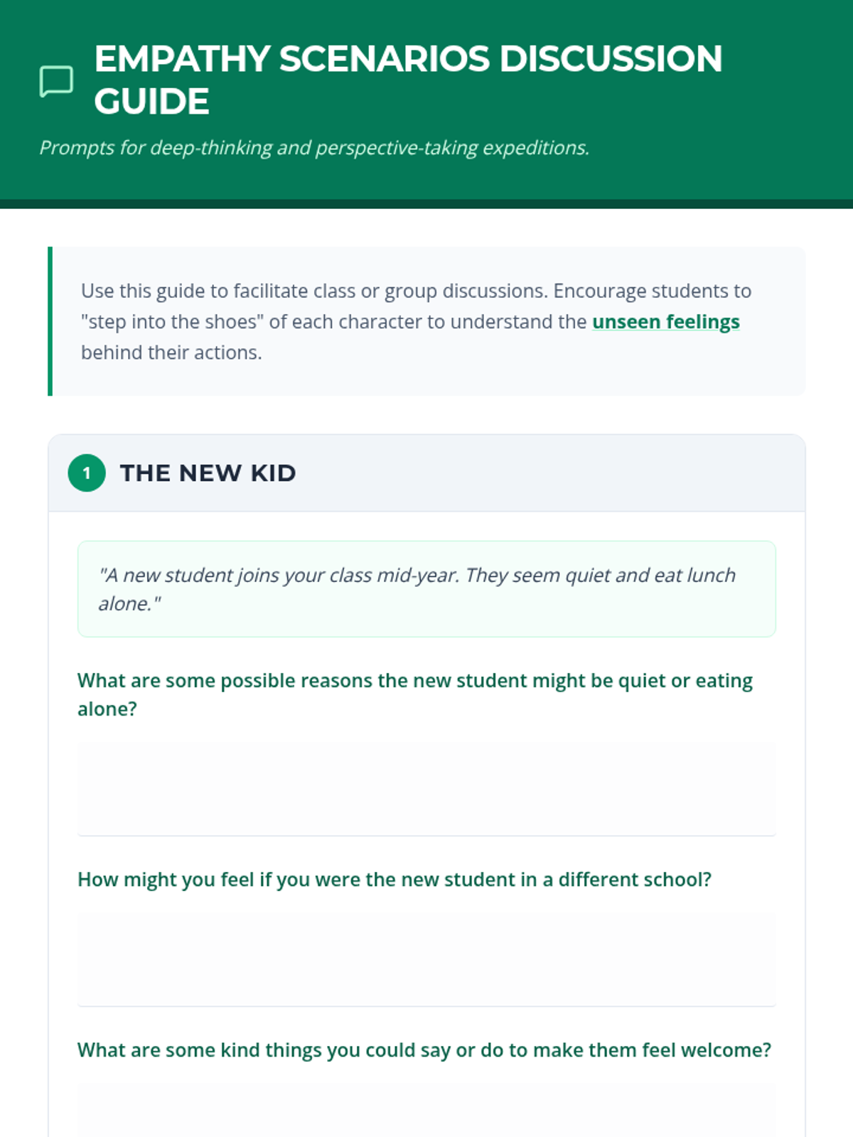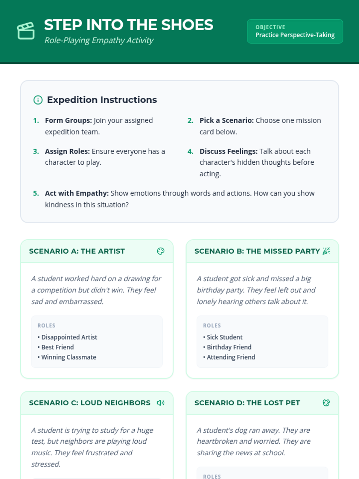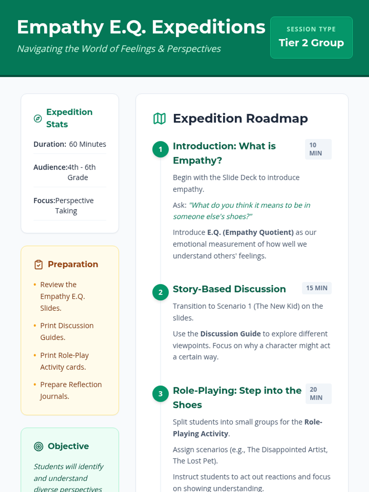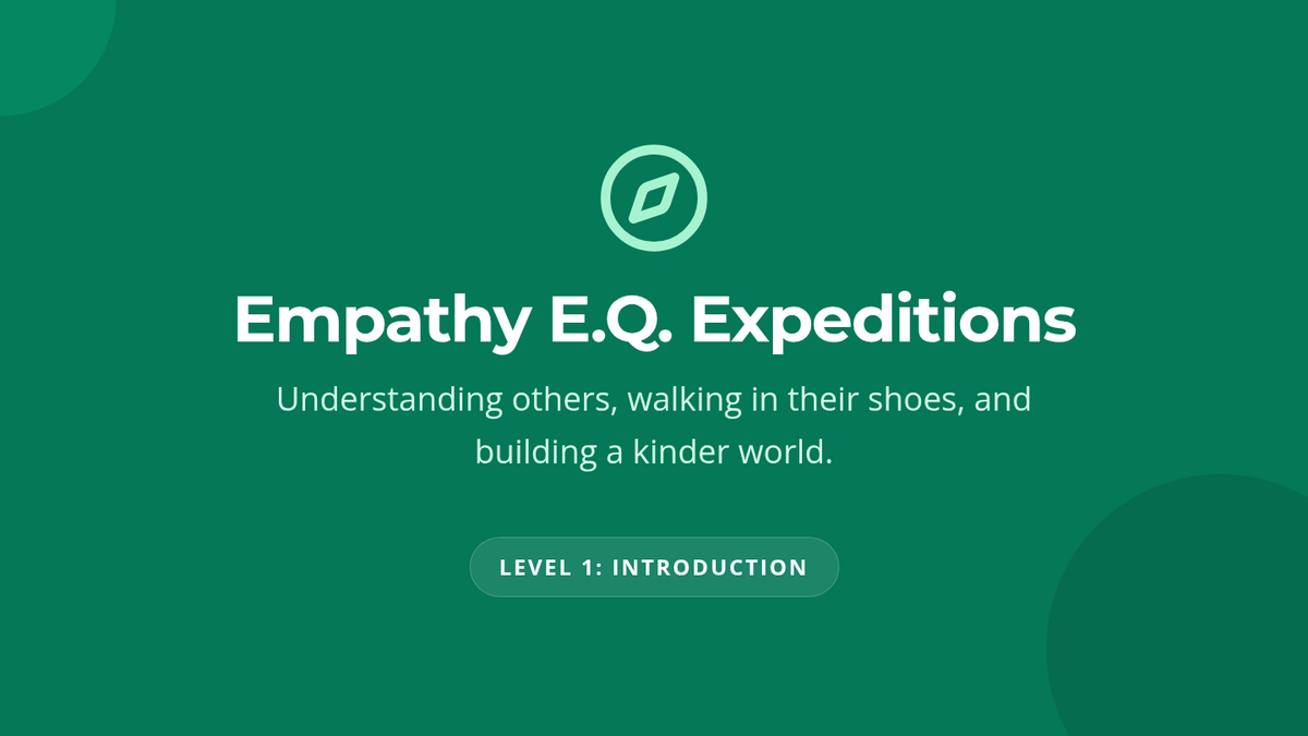 A 60-minute interactive lesson for 4th-6th graders focused on building empathy and perspective-taking through story-based discussions and role-playing activities. Students explore the concept of Empathy Quotient (E.Q.) and practice stepping into others' shoes in various social scenarios.