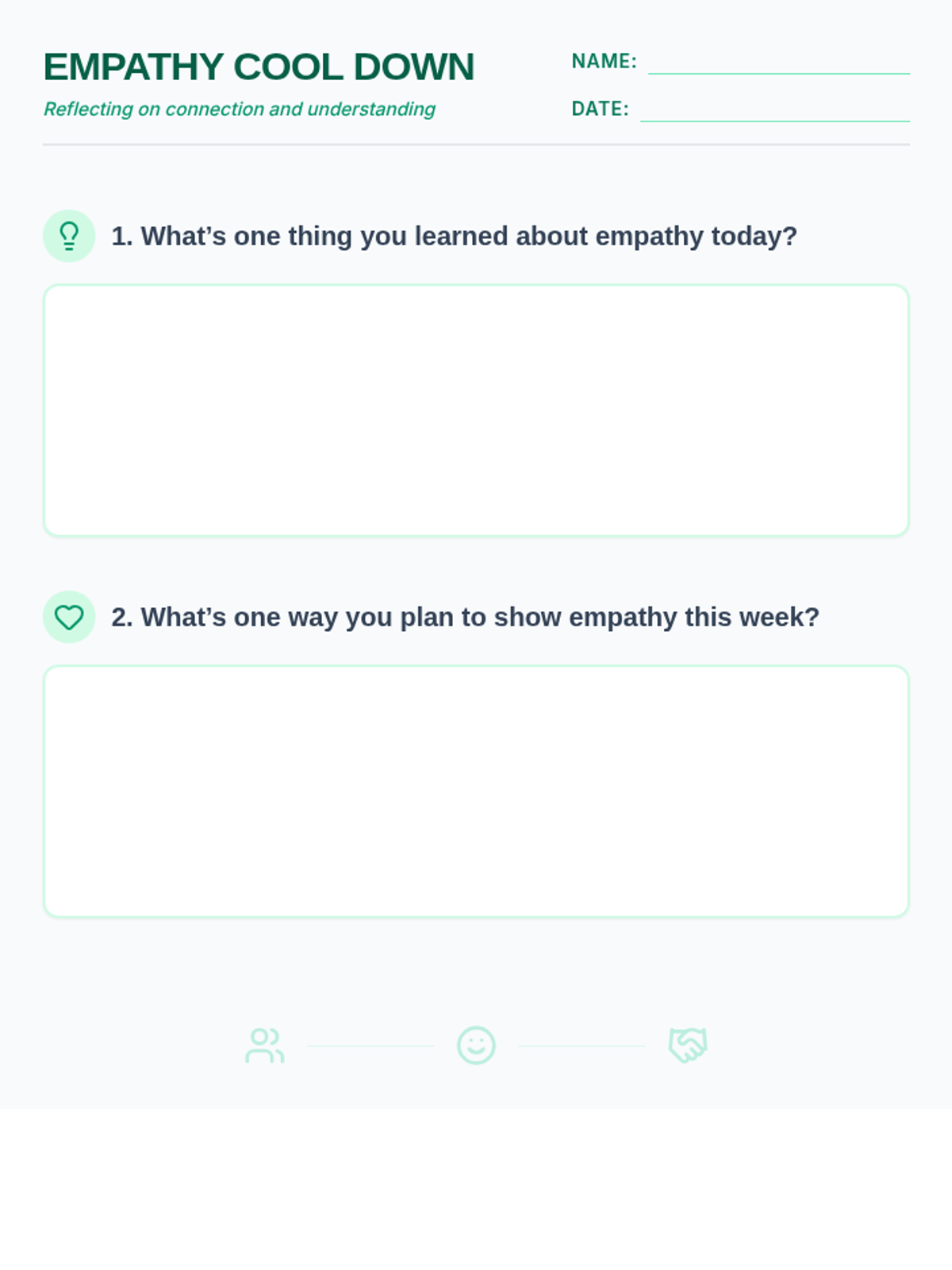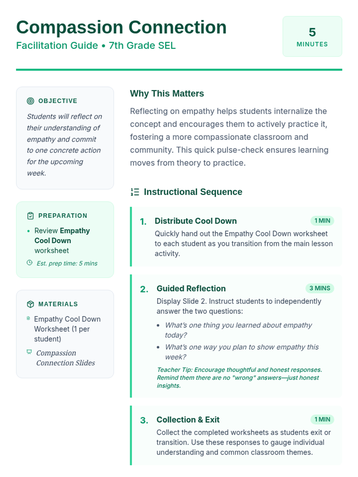 A quick 5-minute reflection session for 7th graders to internalize empathy concepts and plan practical application in their daily lives.