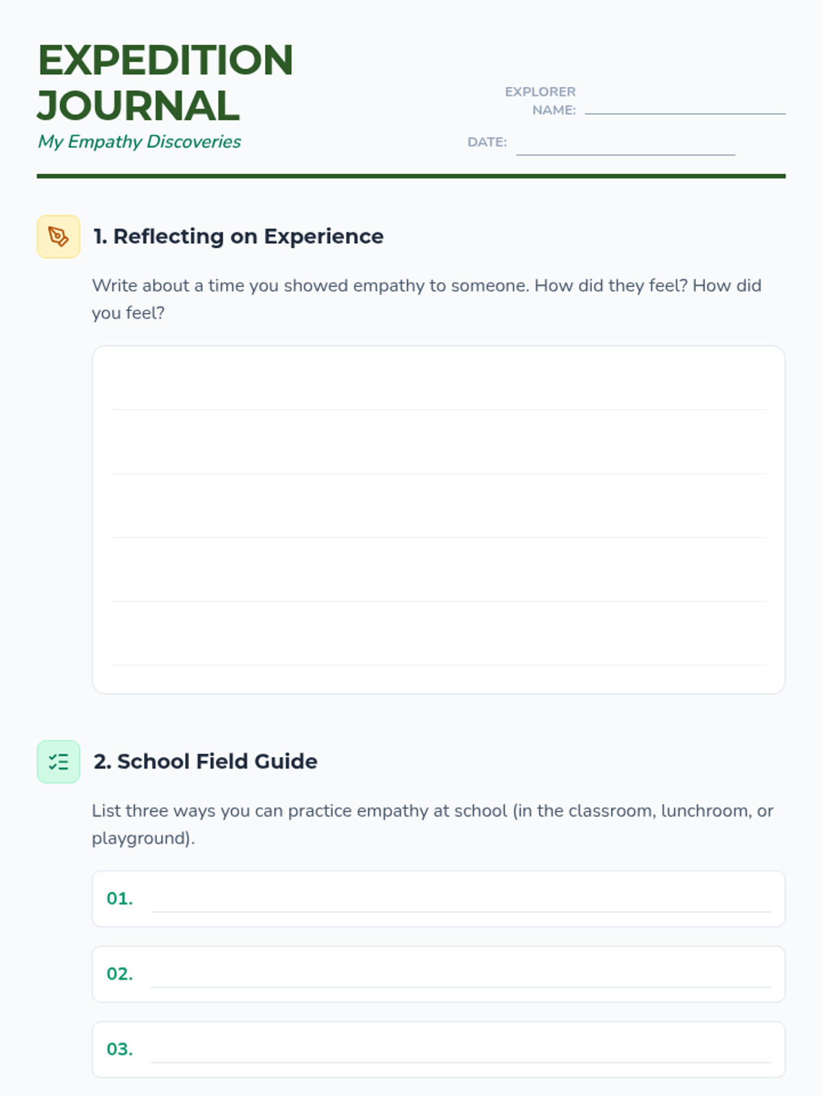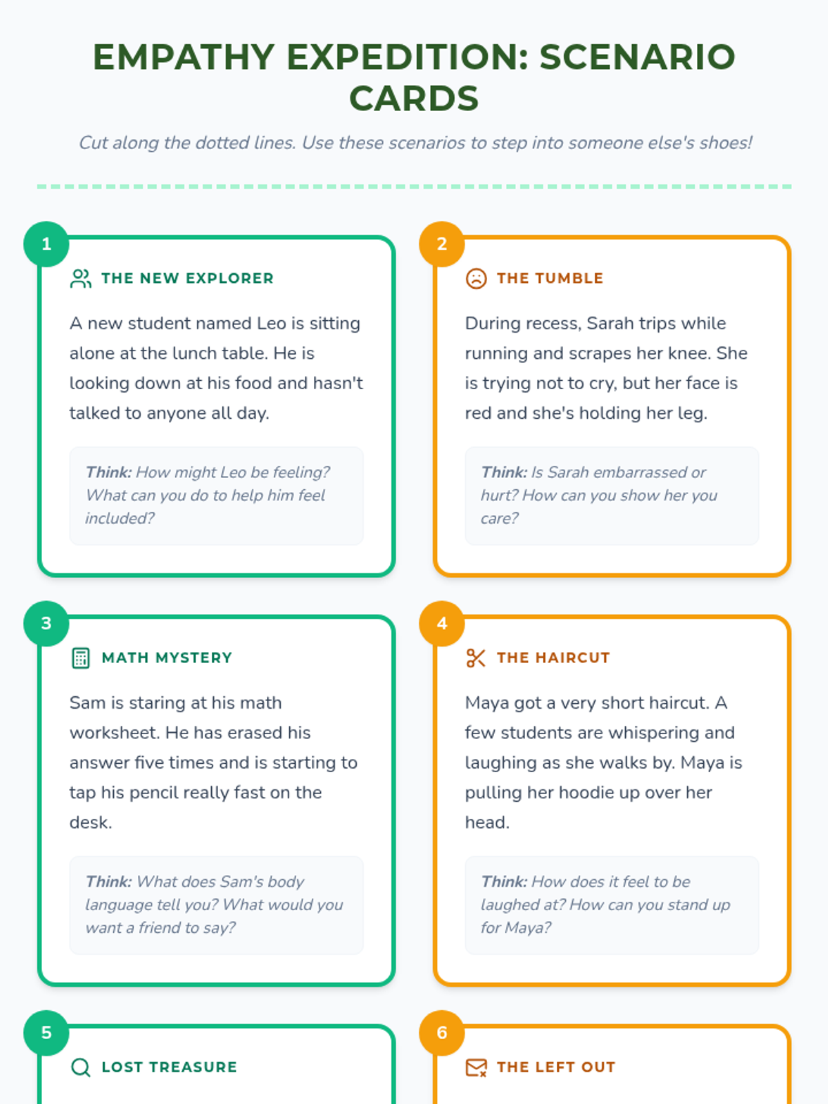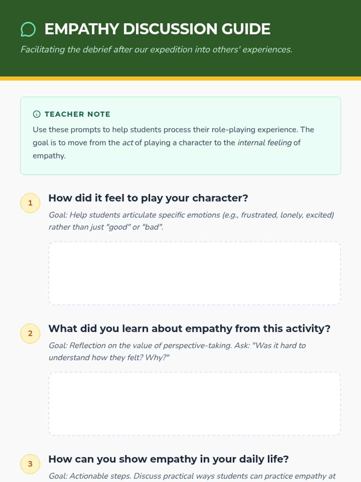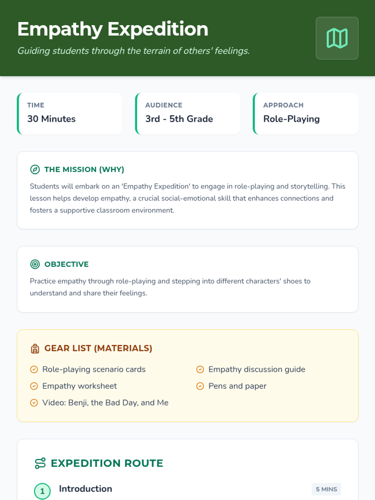 A lesson where students embark on an 'Empathy Expedition' to develop their social-emotional skills through role-playing, storytelling, and reflection. students will learn to understand and share the feelings of others by stepping into different characters' shoes.