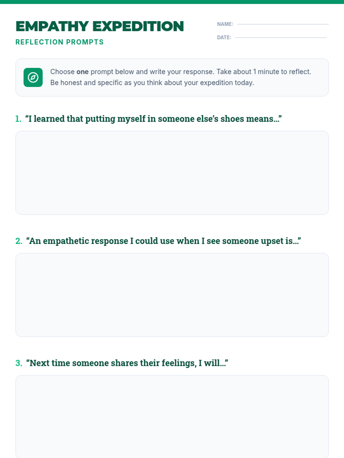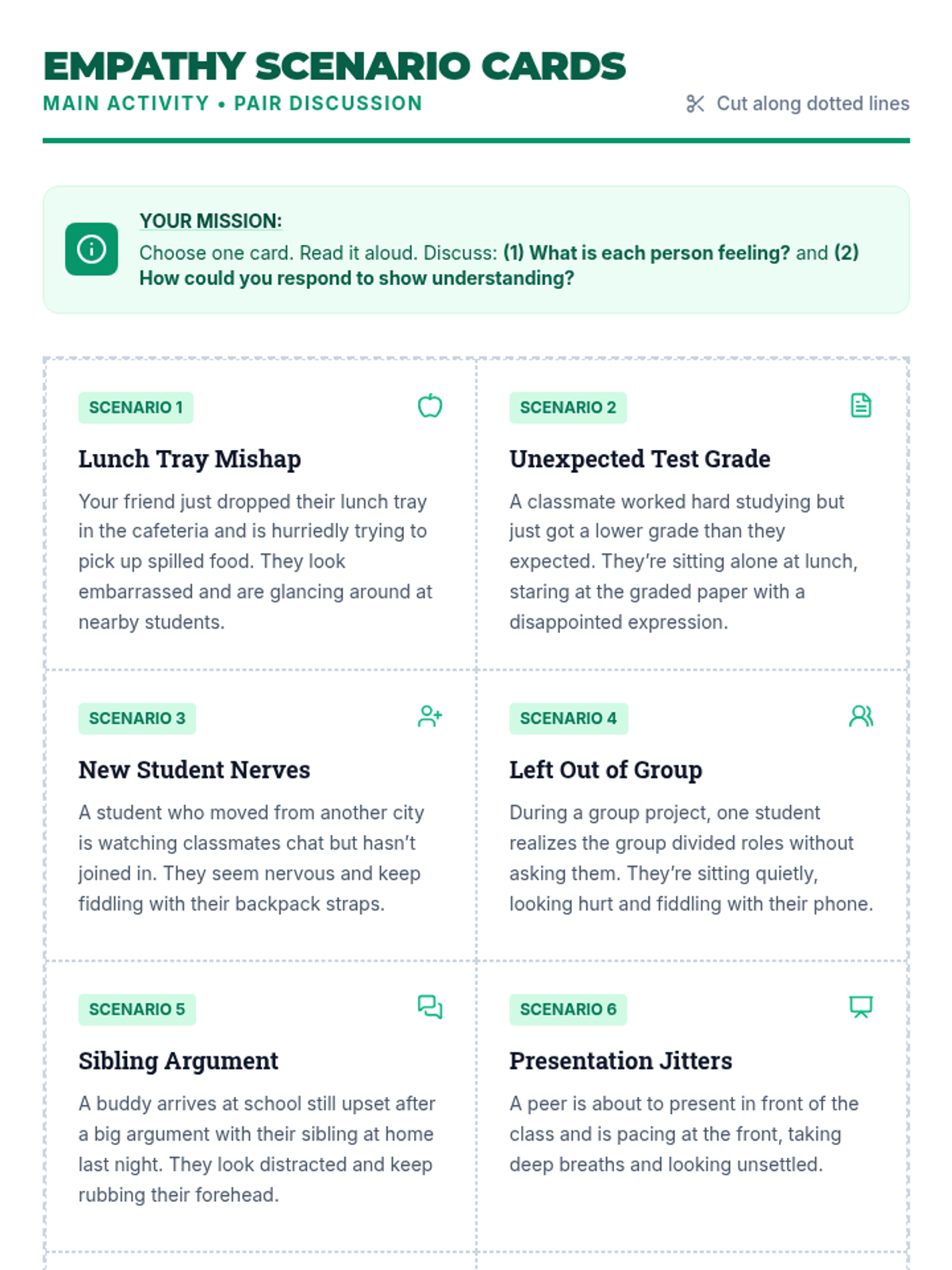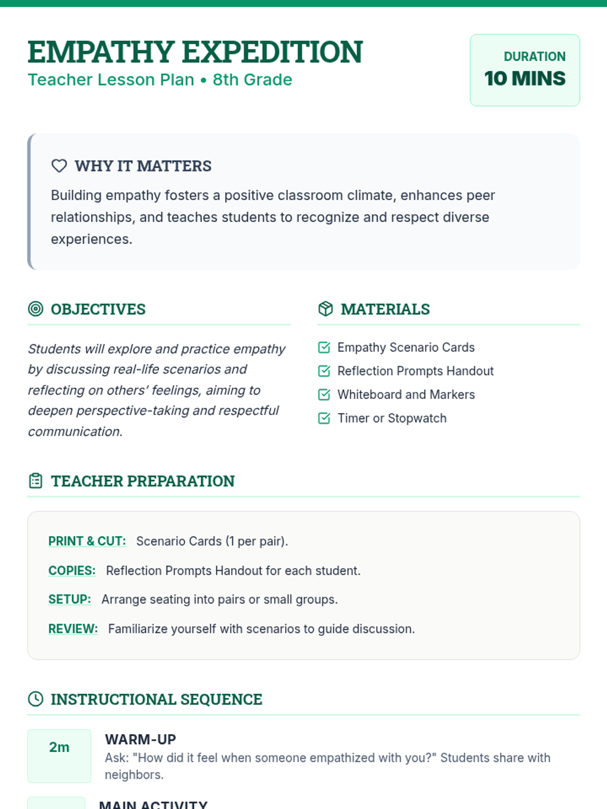 A 10-minute 8th-grade session designed to cultivate empathy and perspective-taking through scenario-based discussion and personal reflection.