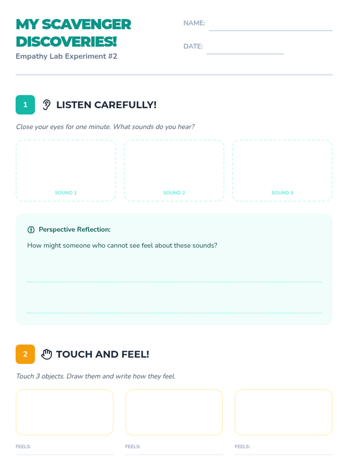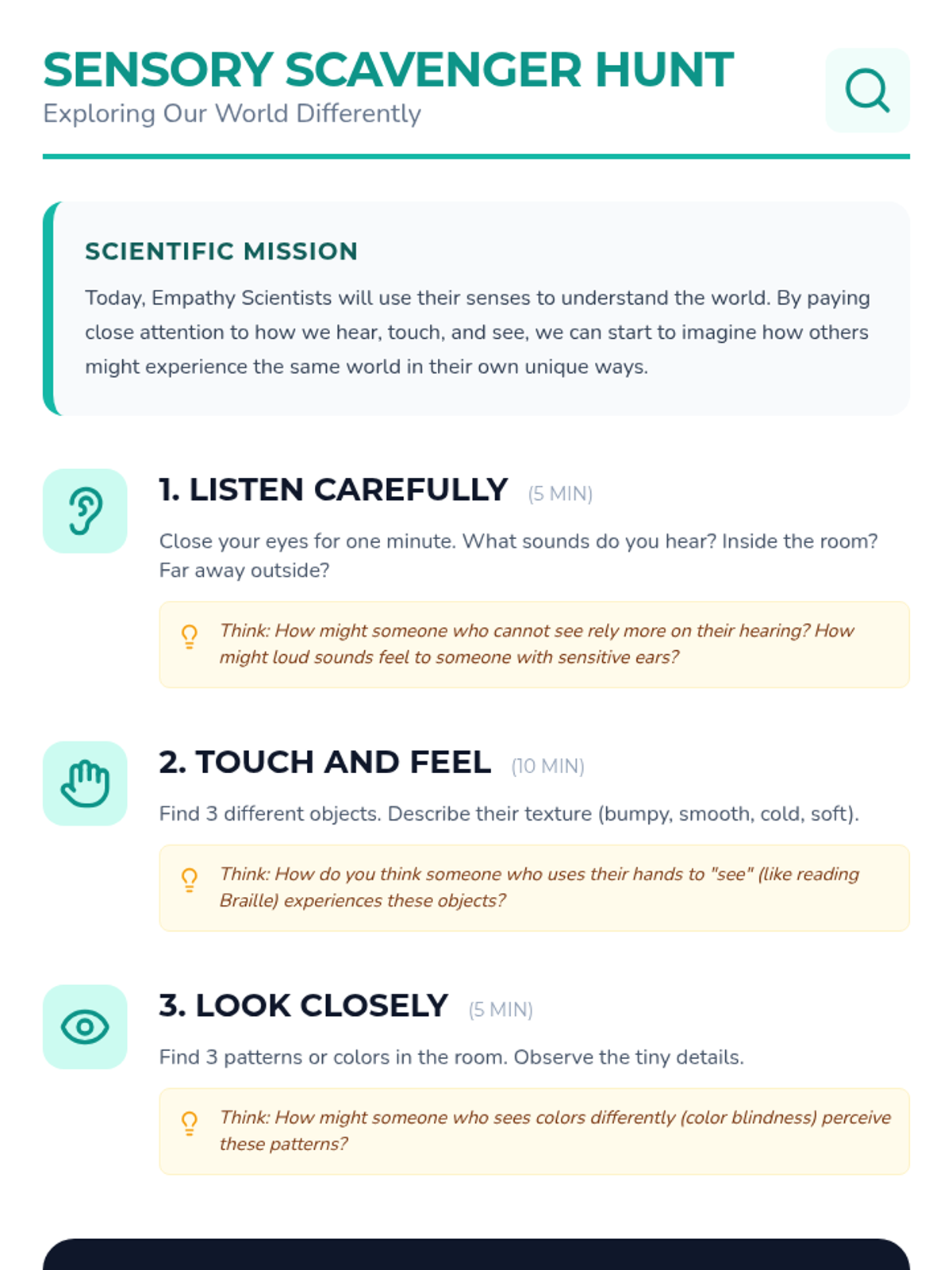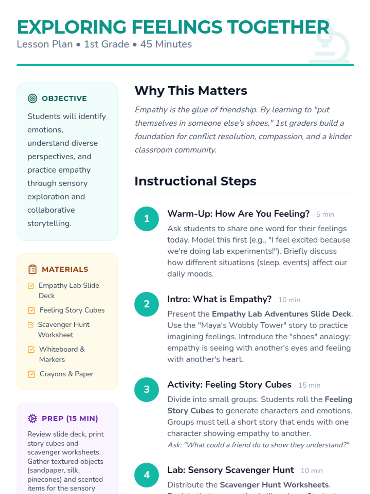 A hands-on 1st-grade lesson where students become 'Empathy Scientists' to explore emotions and perspectives through sensory experiments and storytelling.