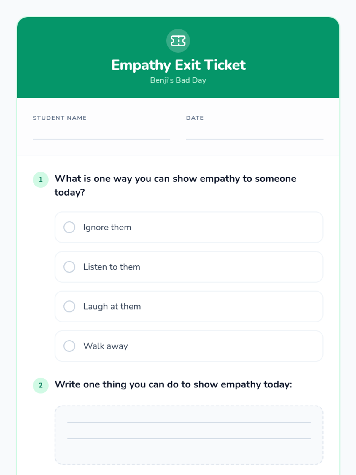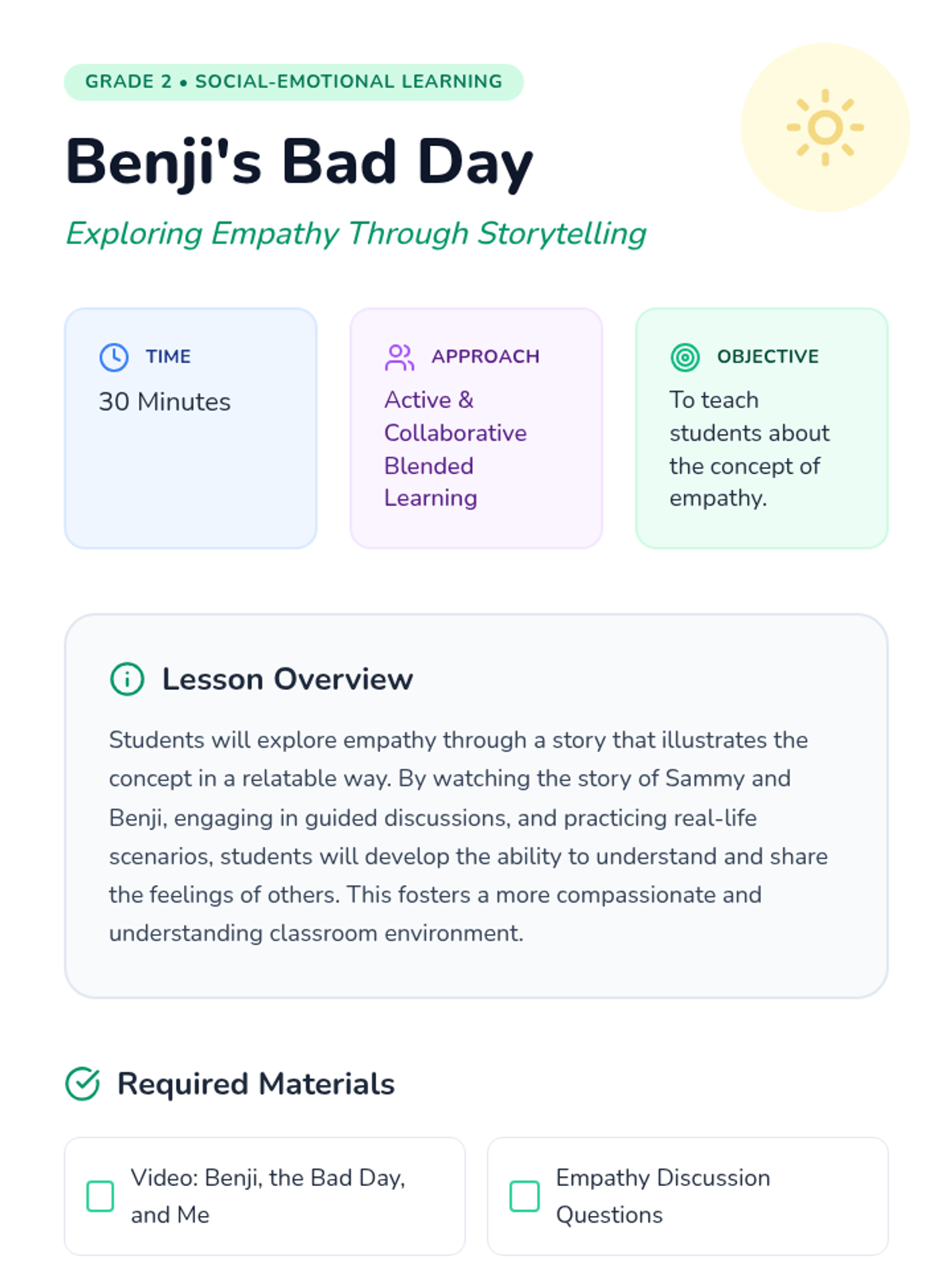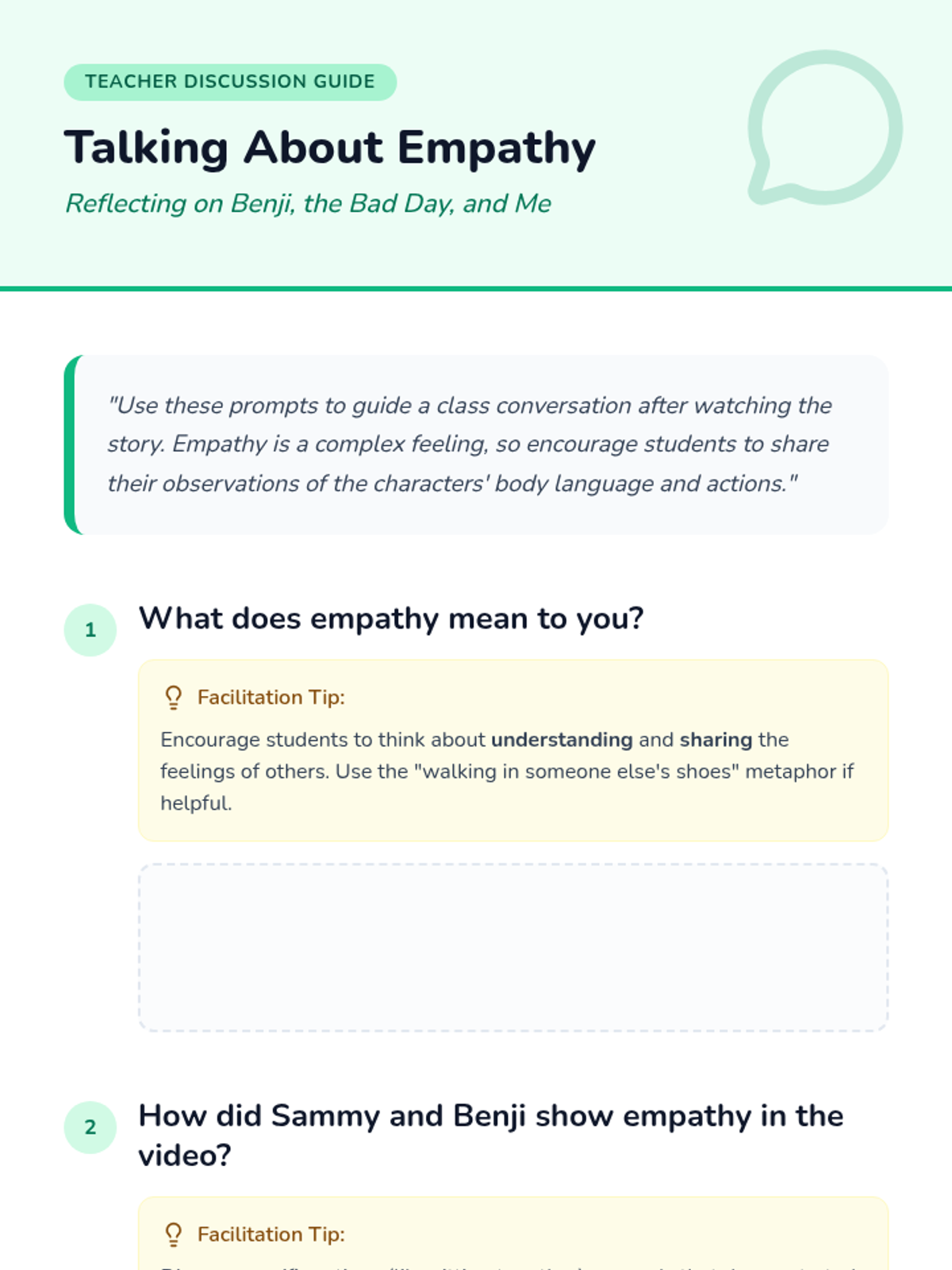 Students will explore empathy through the story 'Benji, the Bad Day, and Me', engaging in discussions and collaborative activities to understand and practice sharing the feelings of others.