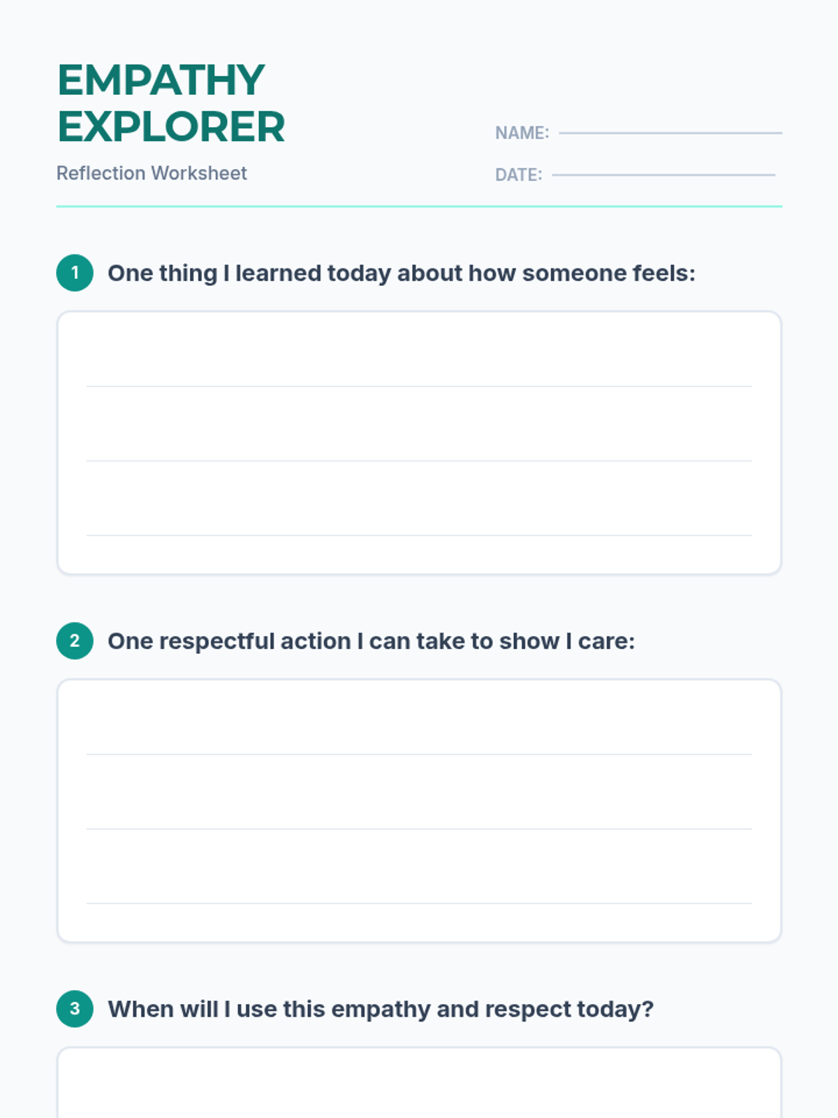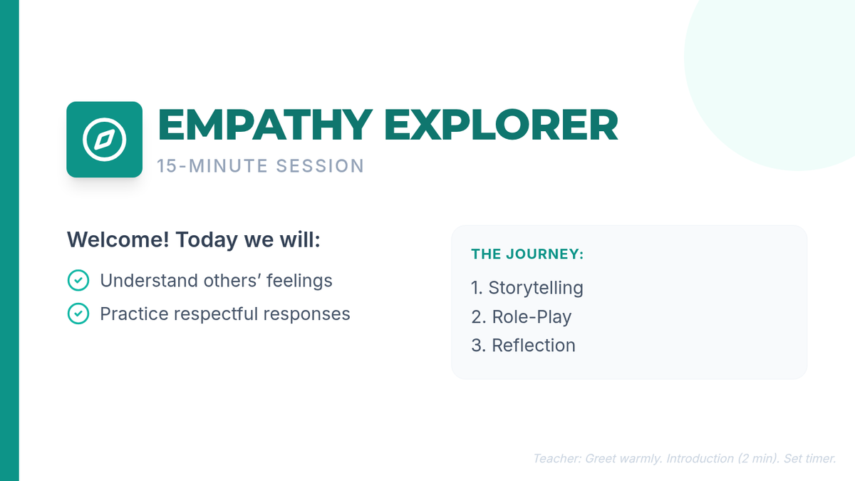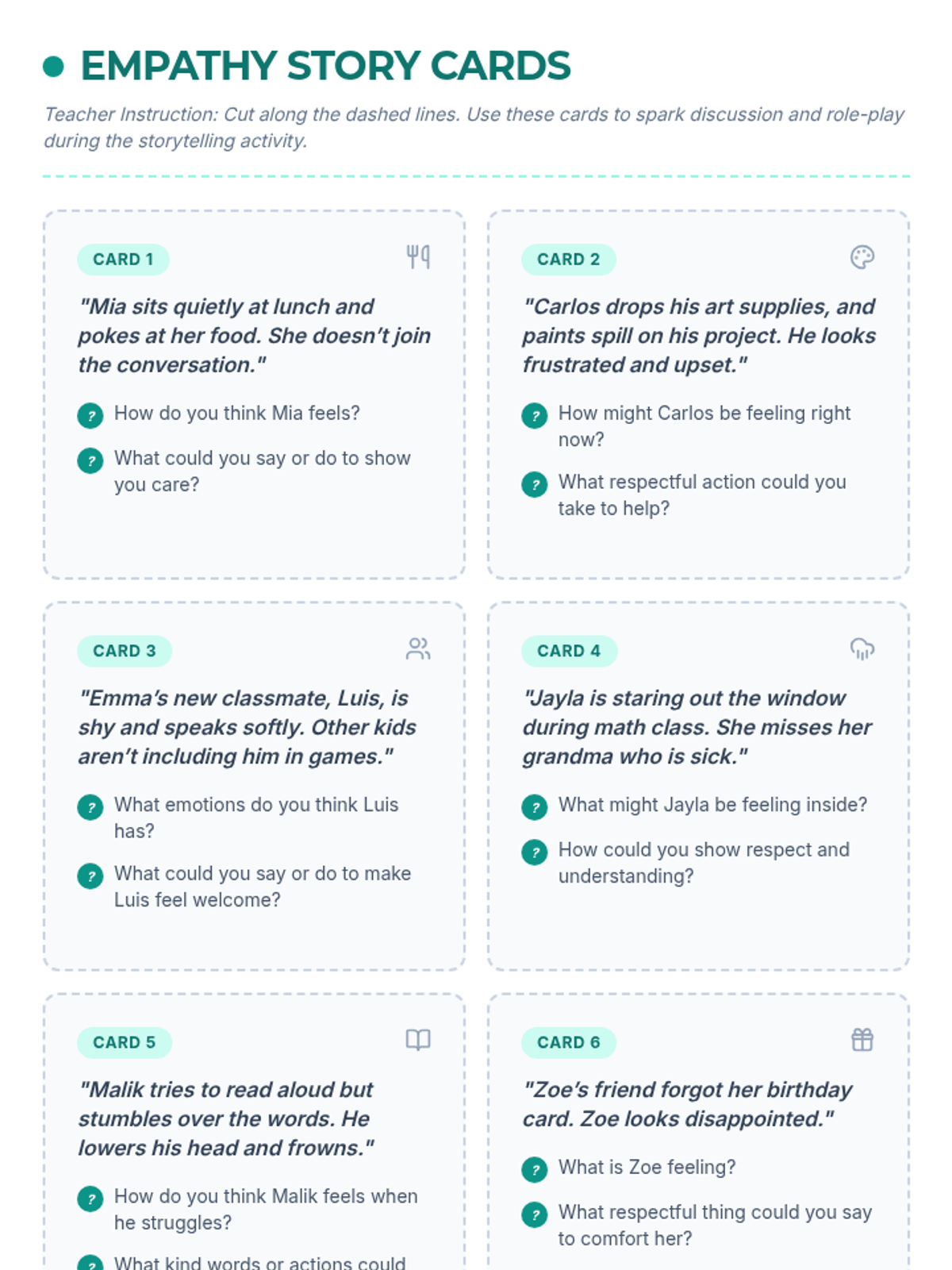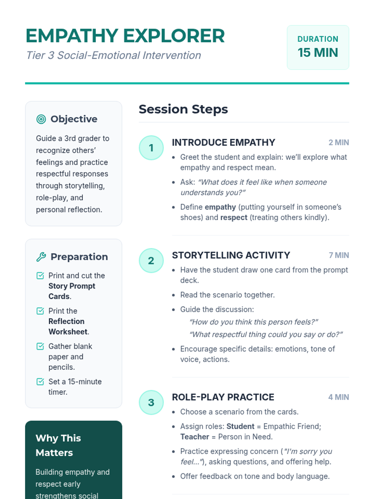 A targeted 15-minute one-on-one session for 3rd graders to develop empathy and respect through storytelling and role-play.