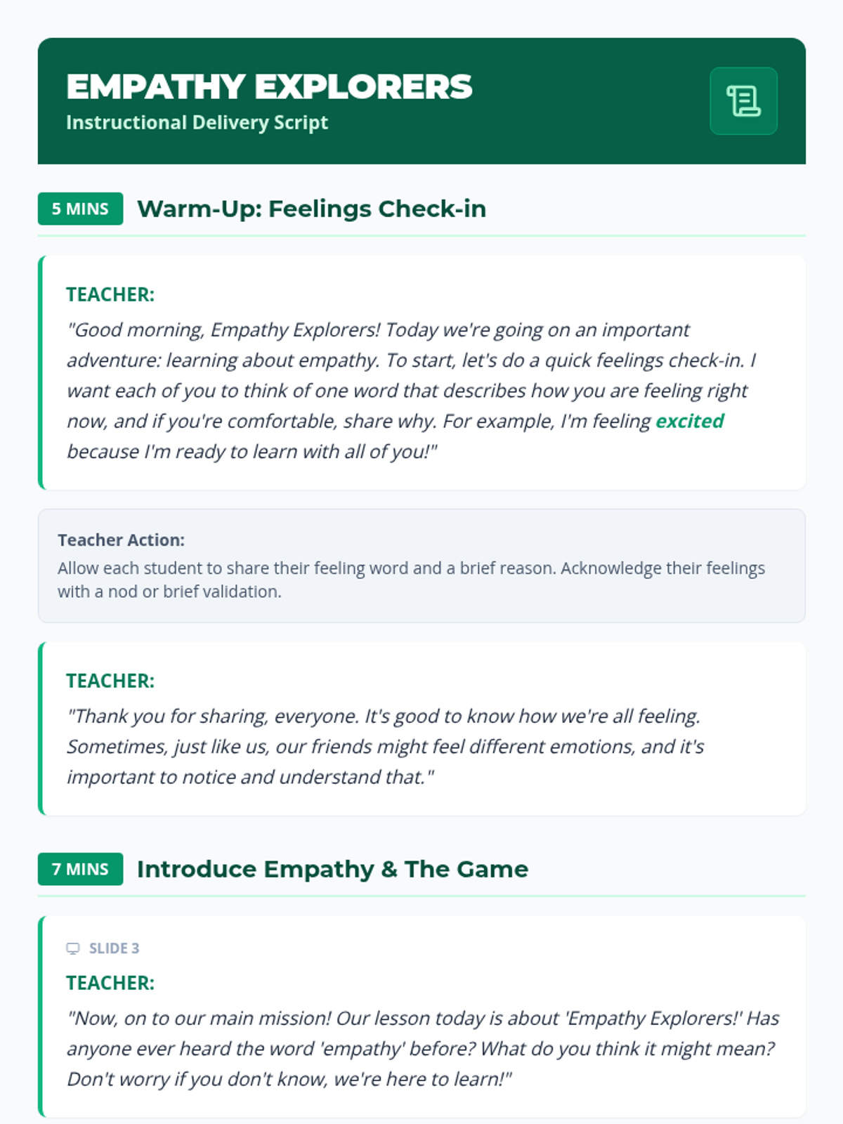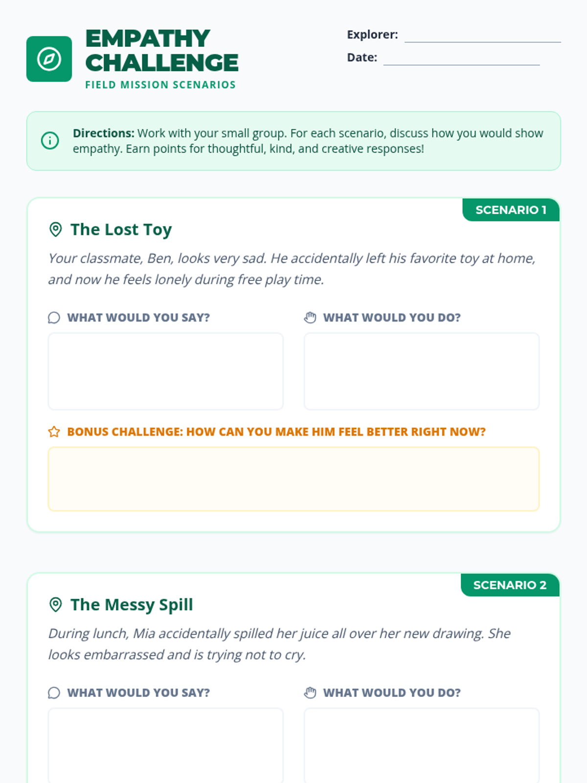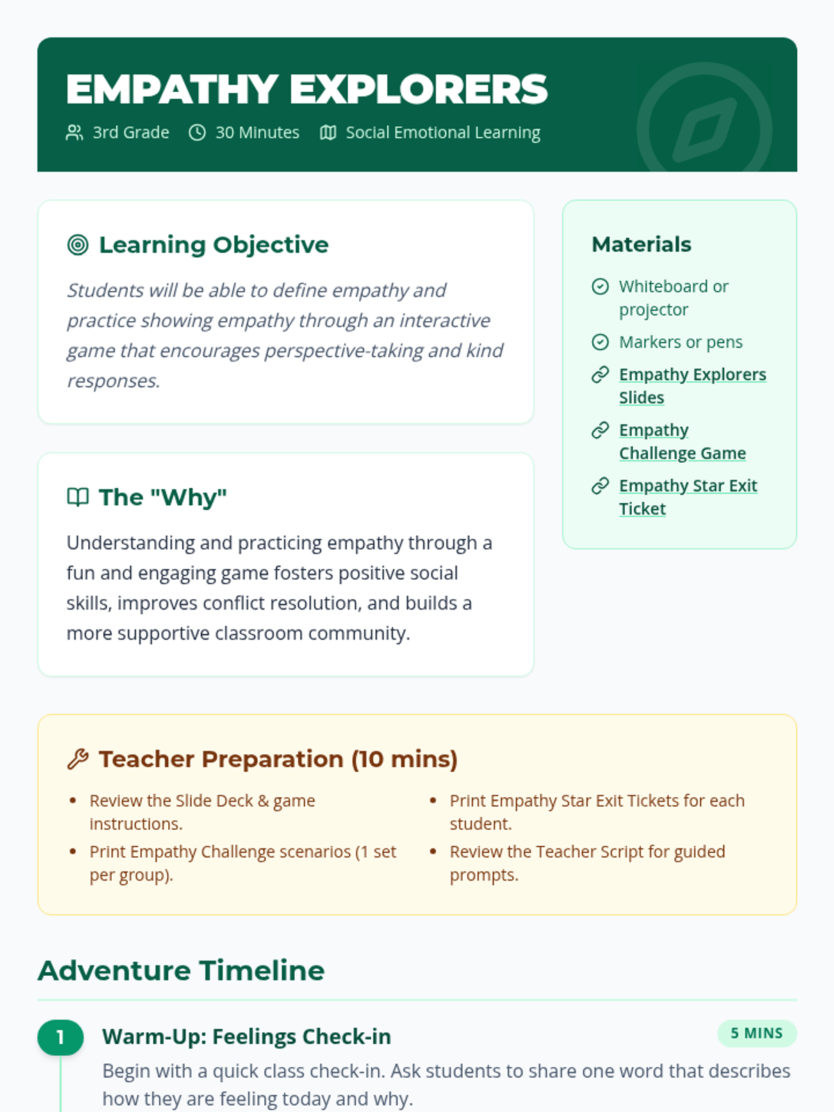 This 30-minute lesson for 3rd graders uses a 'forest explorer' theme to help students understand and practice empathy through scenarios, discussion, and a hands-on empathy challenge.
