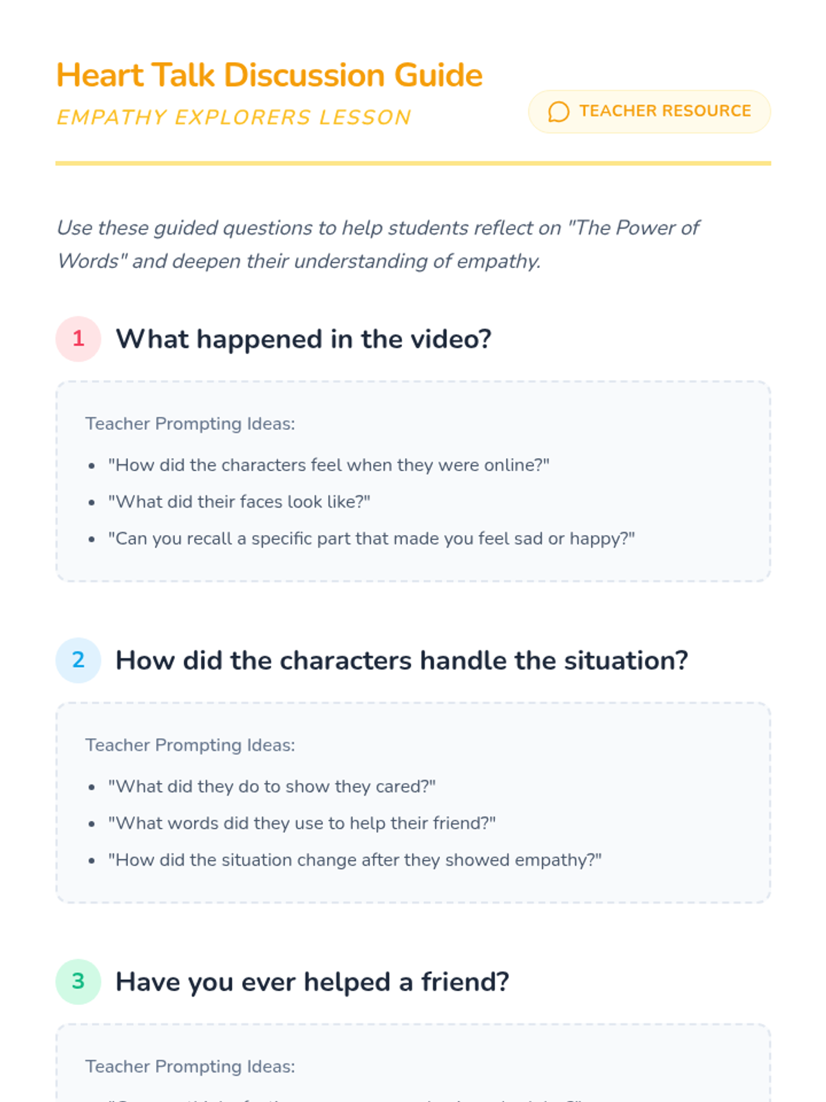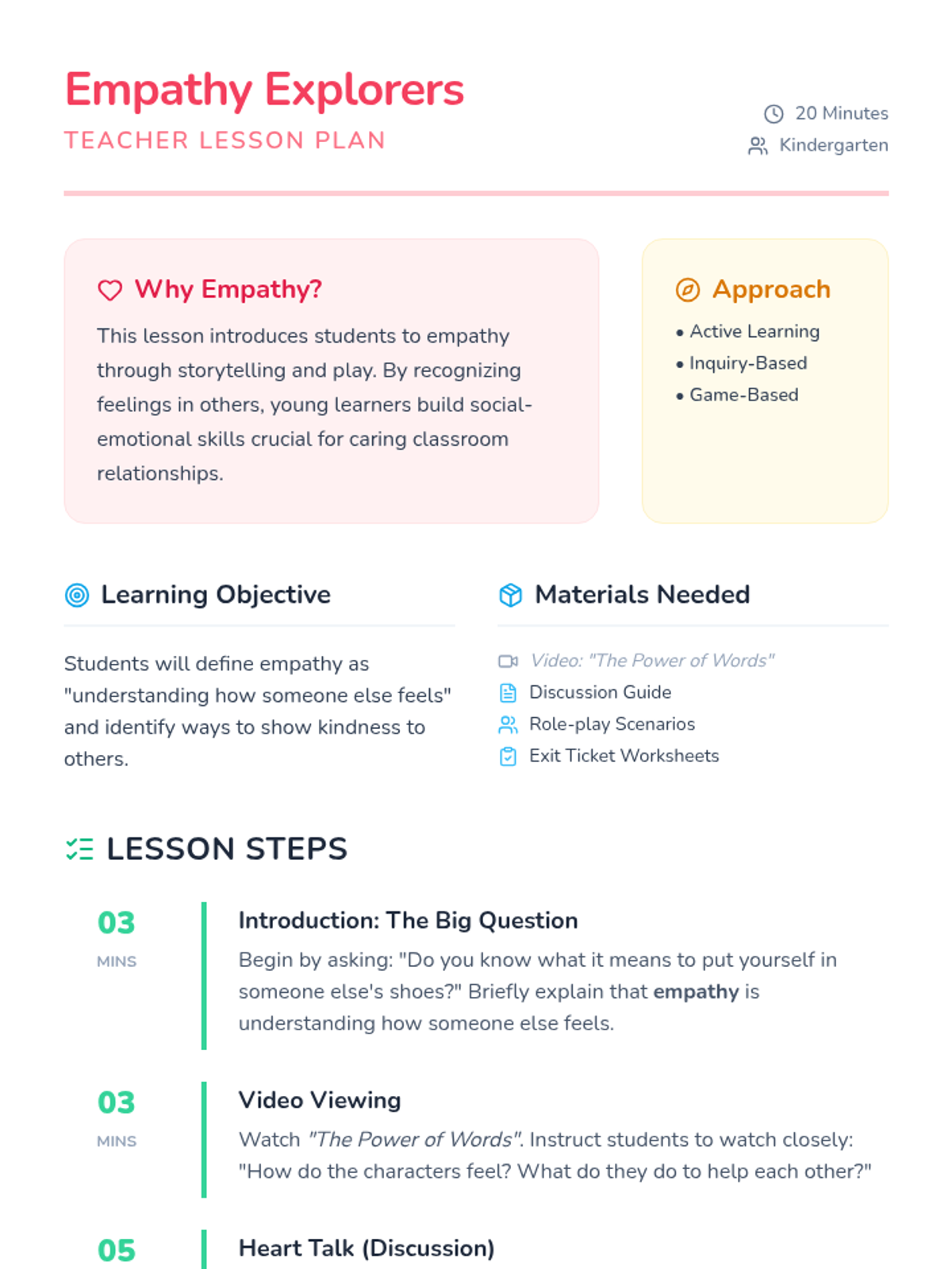 A social-emotional learning lesson for kindergarten students that explores the concept of empathy through storytelling, role-play, and reflective discussion. Students learn to identify others' feelings and understand the metaphor of walking in someone else's shoes.