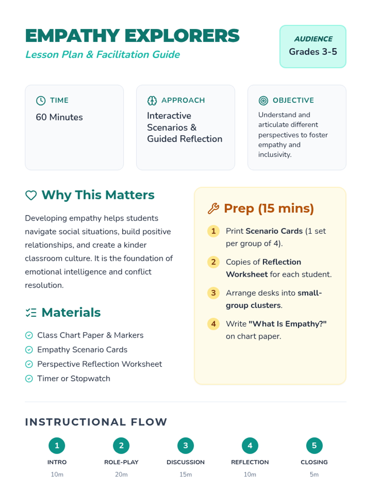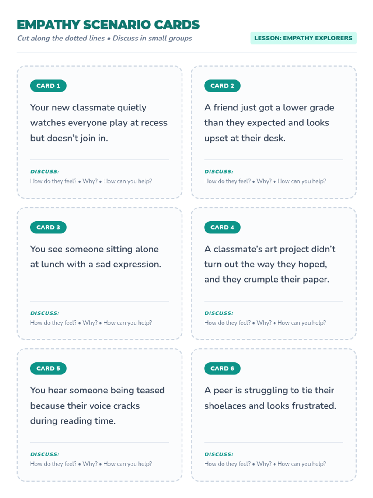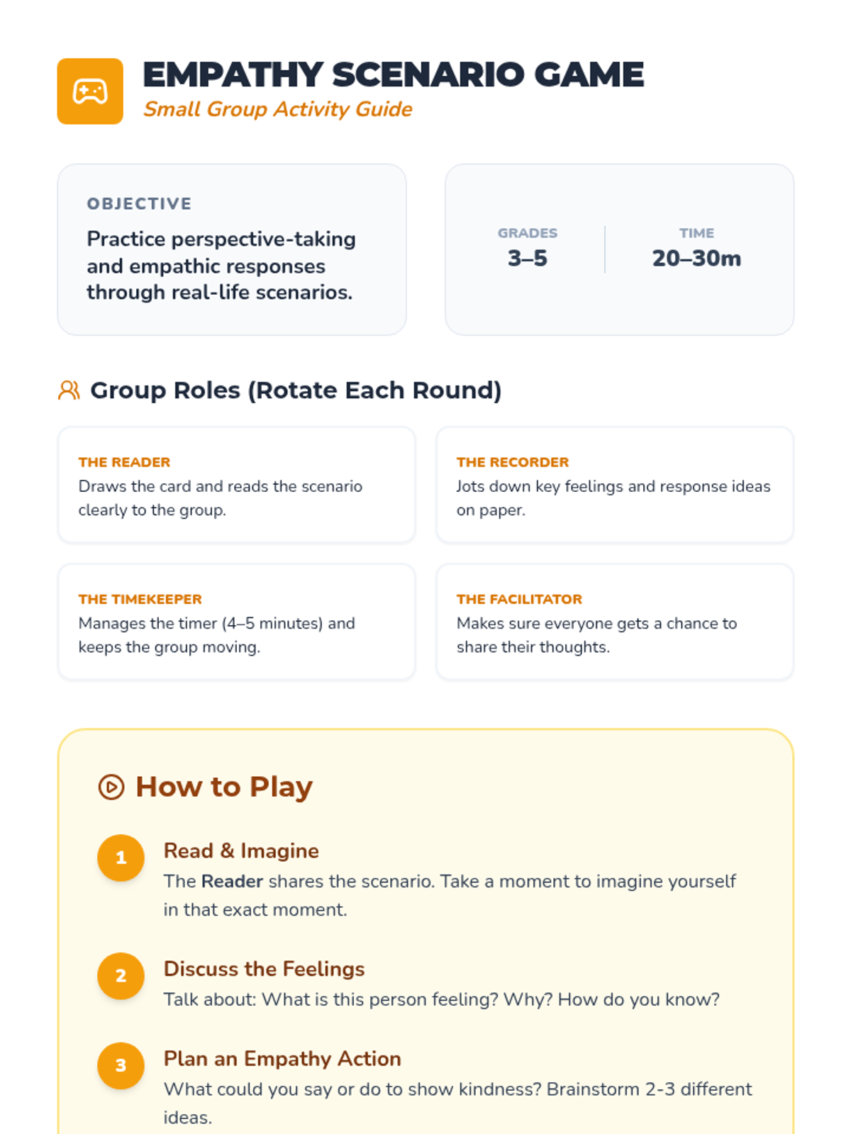 A SEL lesson for grades 3-5 that uses scenario-based role-play and reflection to develop empathy, perspective-taking, and kindness in social situations.