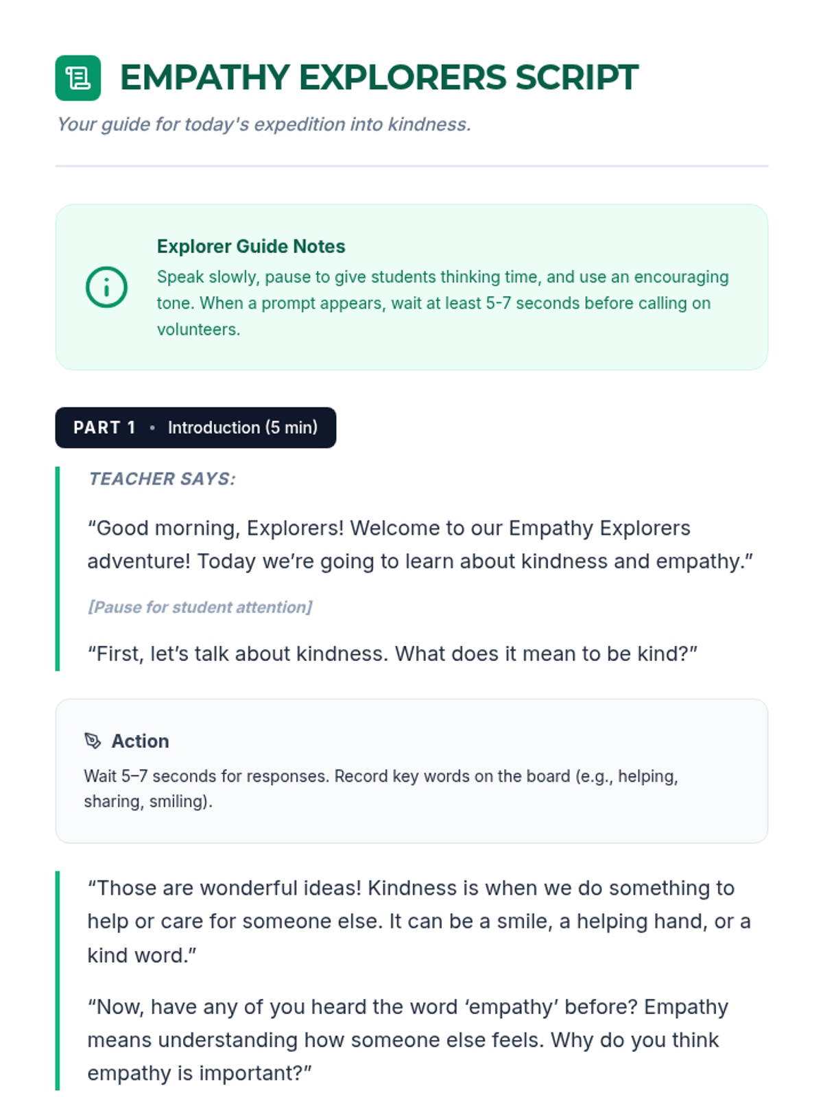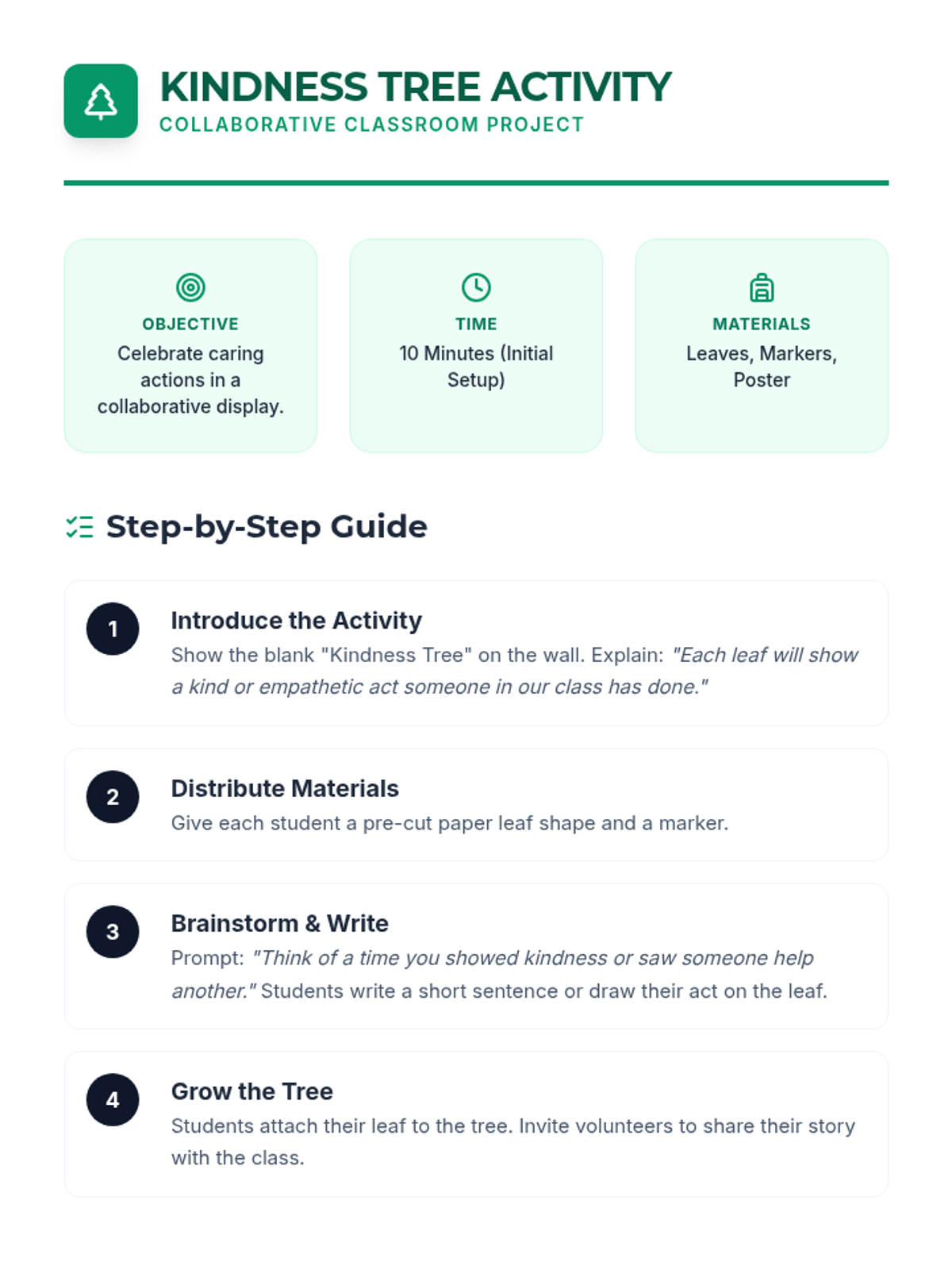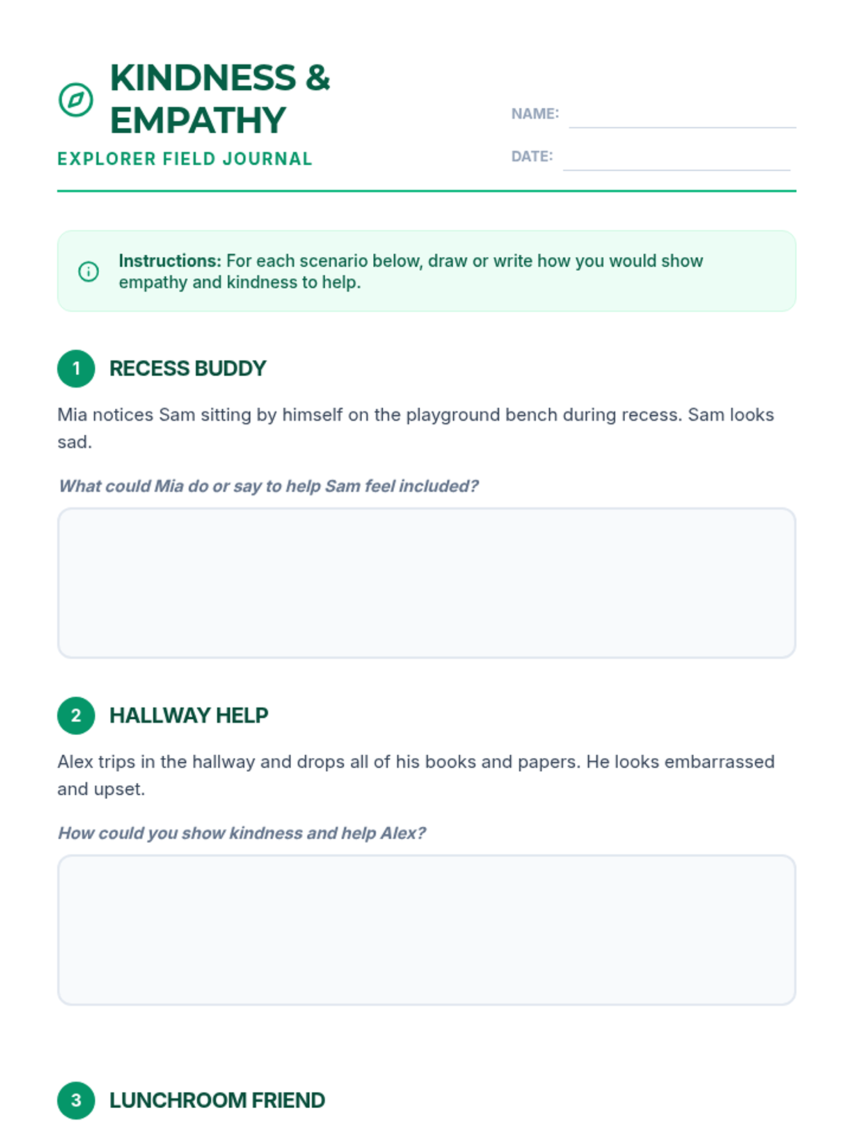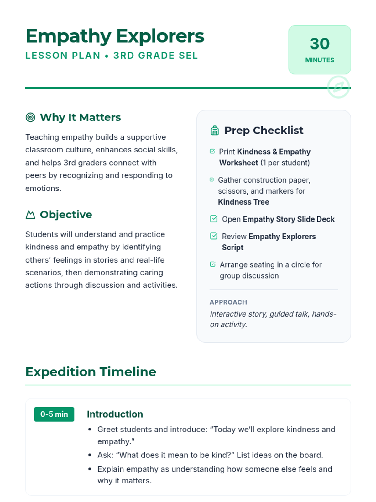 A 30-minute interactive lesson for 3rd graders focused on building empathy and kindness through stories, discussion, and hands-on activities. Students learn to recognize emotions in others and practice caring responses to foster a supportive classroom community.