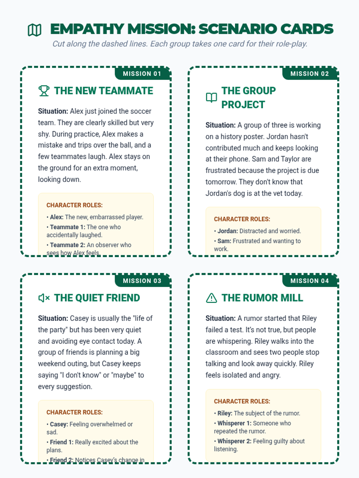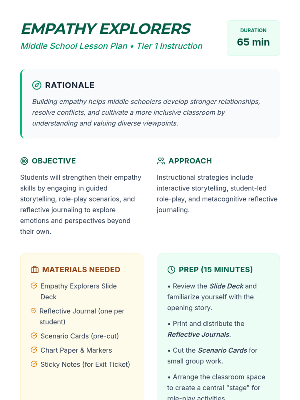 A comprehensive middle school lesson that uses storytelling and role-play to build empathy and understanding of diverse perspectives. Students explore emotions through interactive skits and reflective journaling.