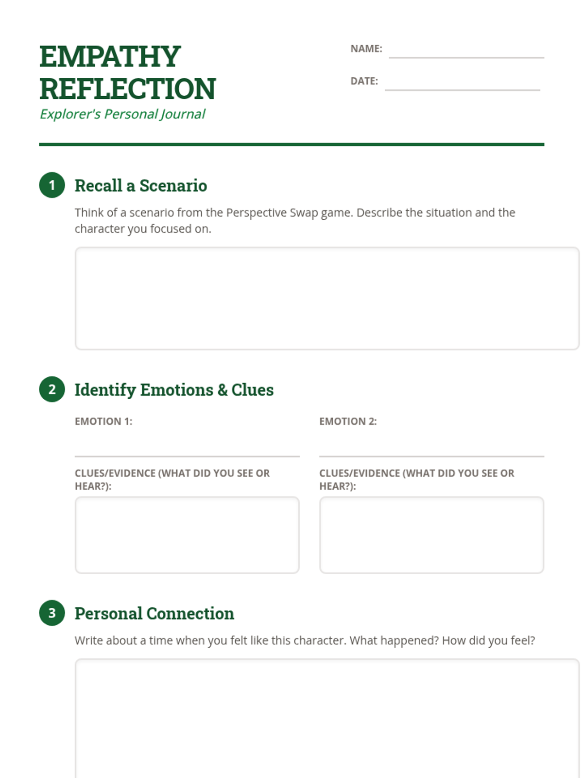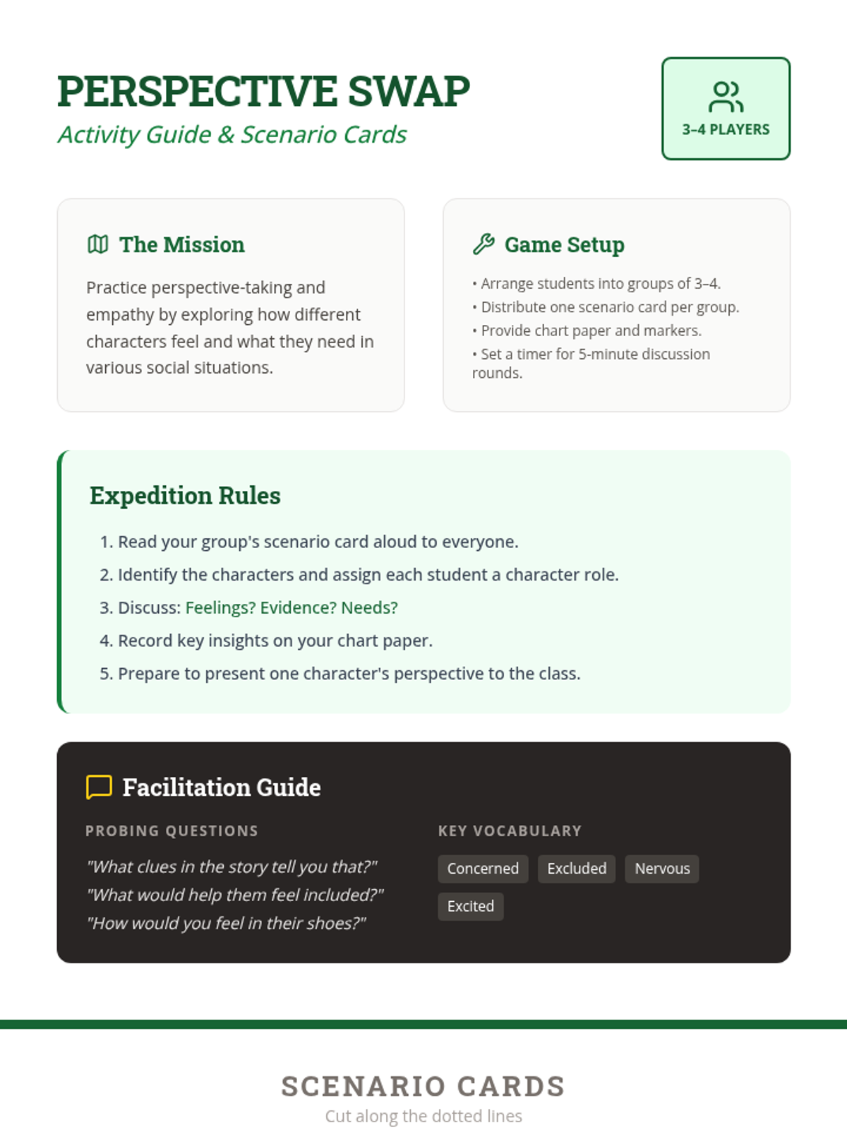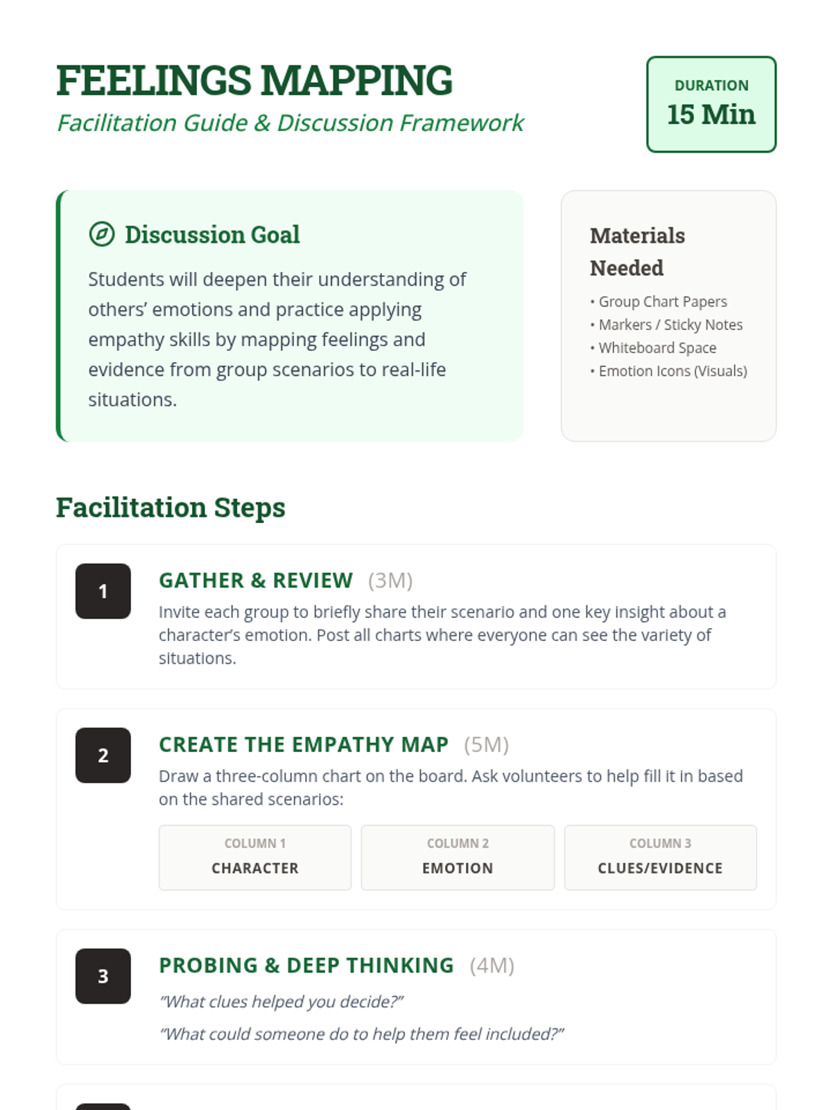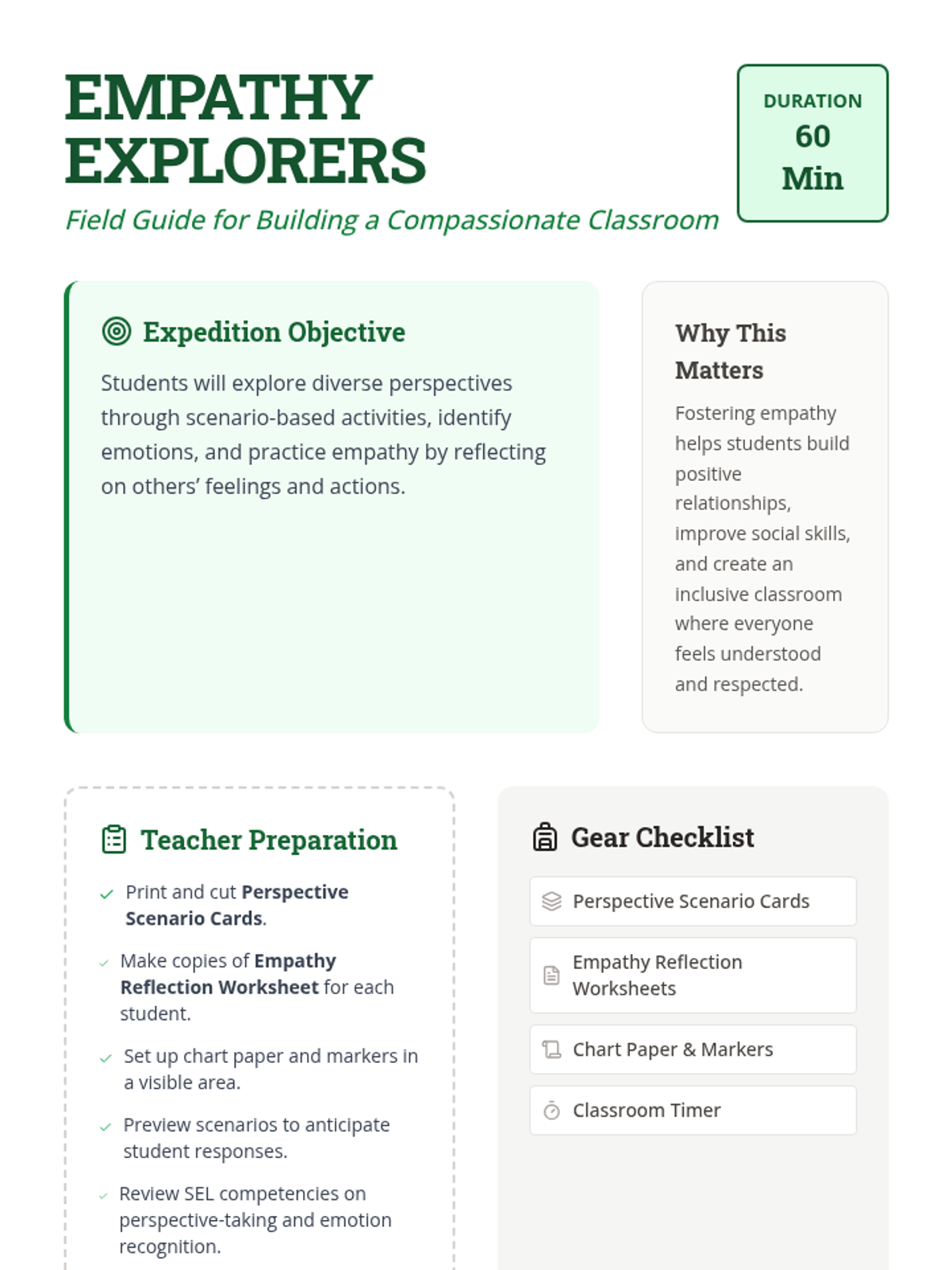 A 60-minute session for grades 3-5 focusing on empathy, perspective-taking, and social dynamics through scenario-based games and individual reflection. Students will learn to identify emotions and develop actionable plans for kindness.