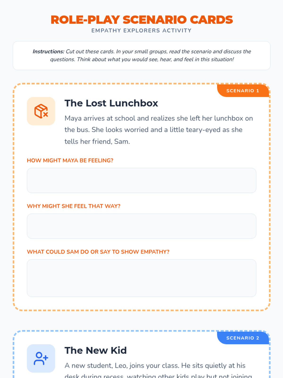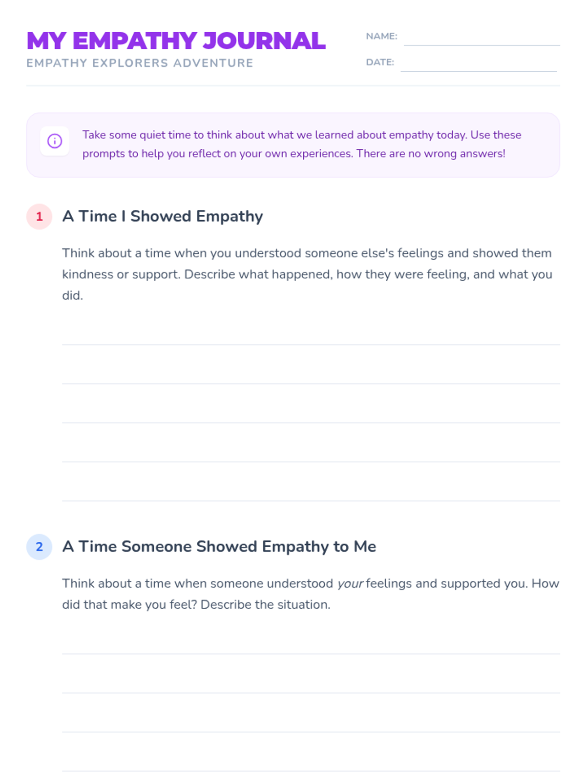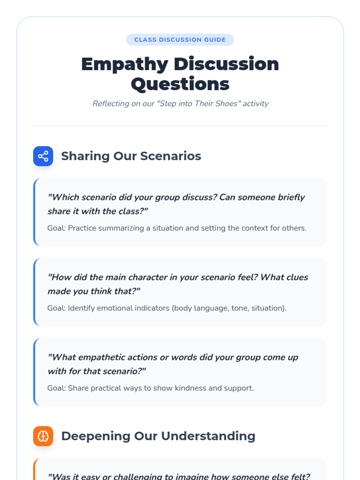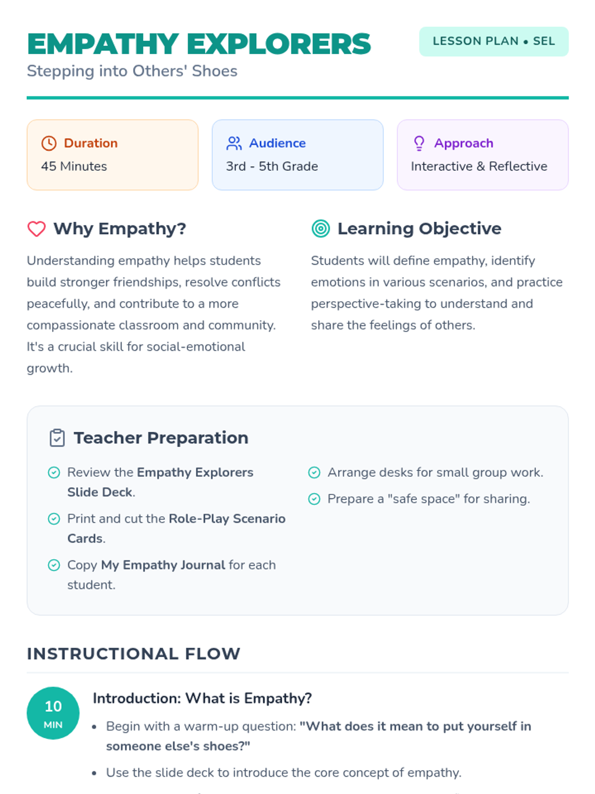 A comprehensive 45-minute lesson for 3rd-5th graders to develop empathy through perspective-taking, role-playing, and reflection. Students explore what it means to 'step into someone else's shoes' and practice responding with kindness and compassion.