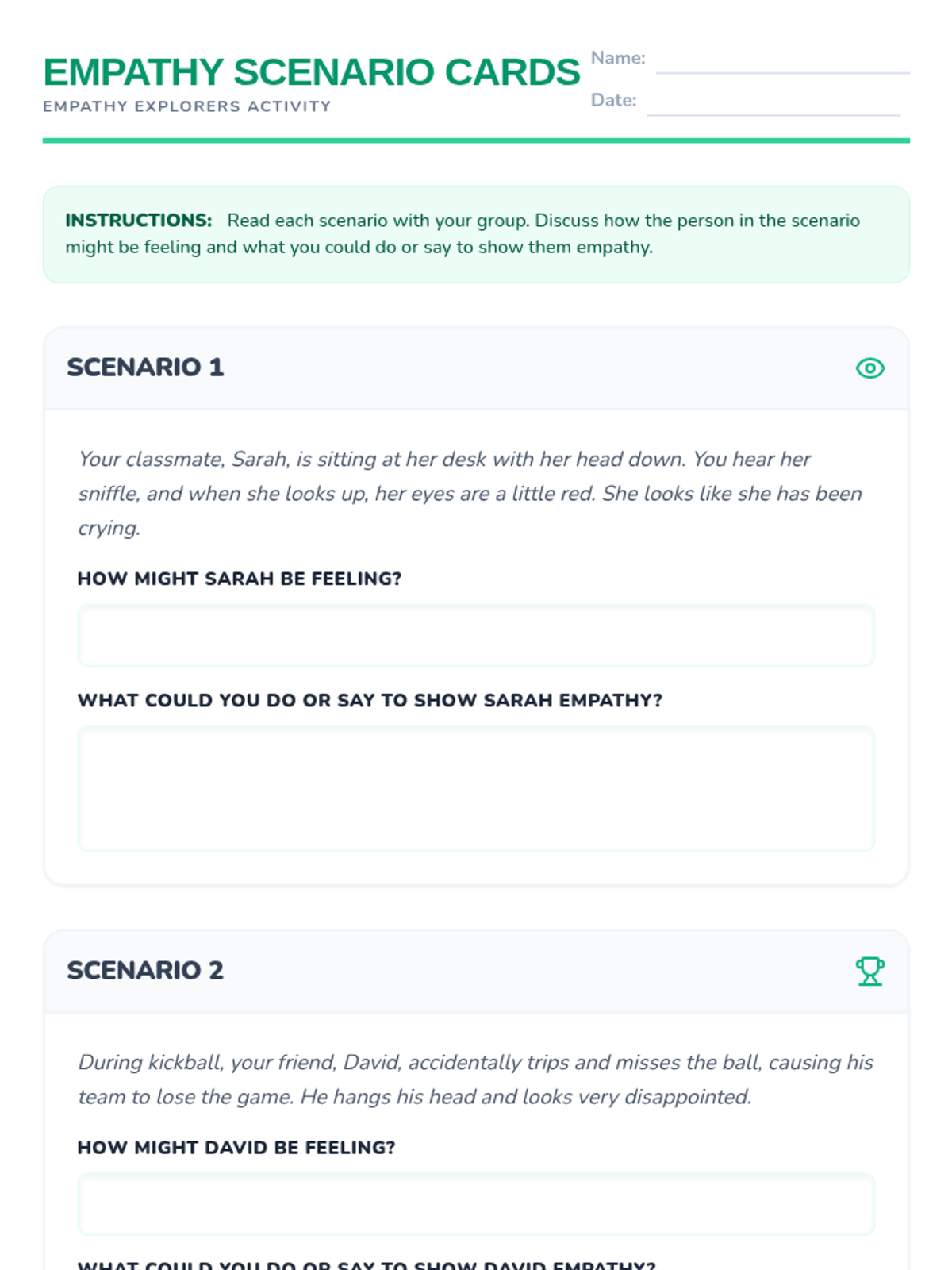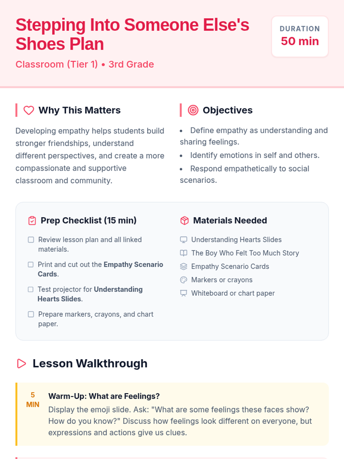 A 50-minute social-emotional learning lesson for 3rd graders focused on defining empathy, recognizing emotions in others, and practicing empathetic responses through stories and scenarios.