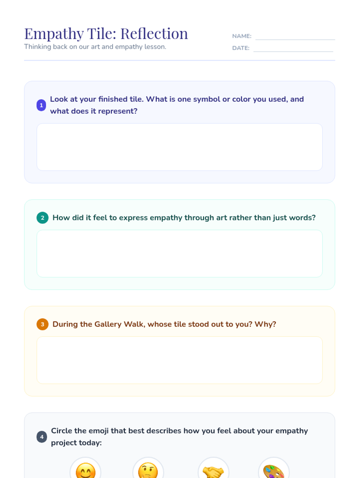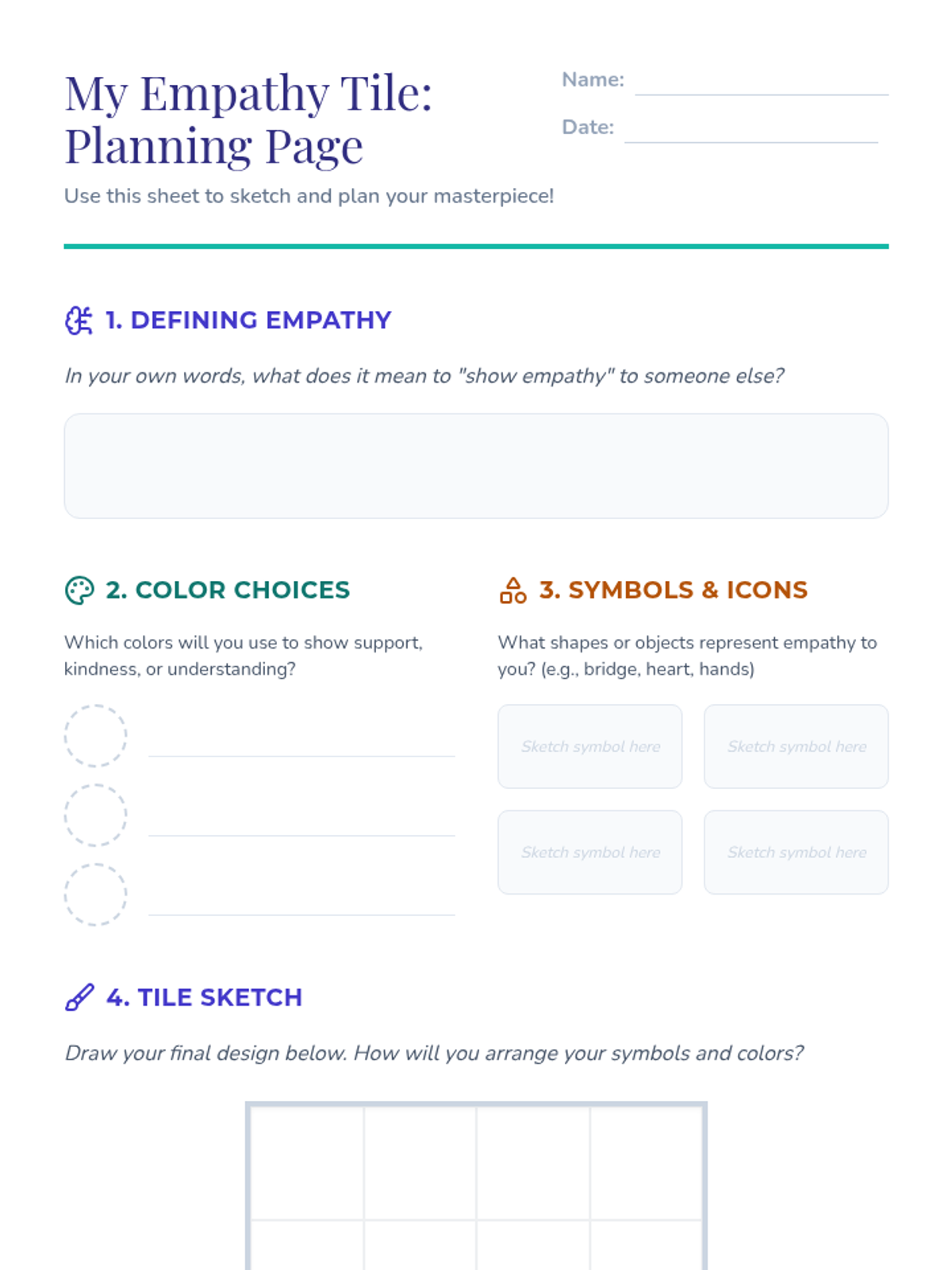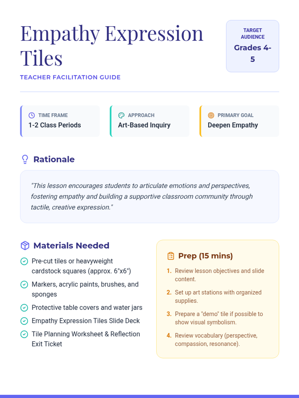 Students in Grades 4-5 create personalized tiles expressing their understanding of empathy through a tactile art project that fosters emotional understanding and a supportive classroom atmosphere.