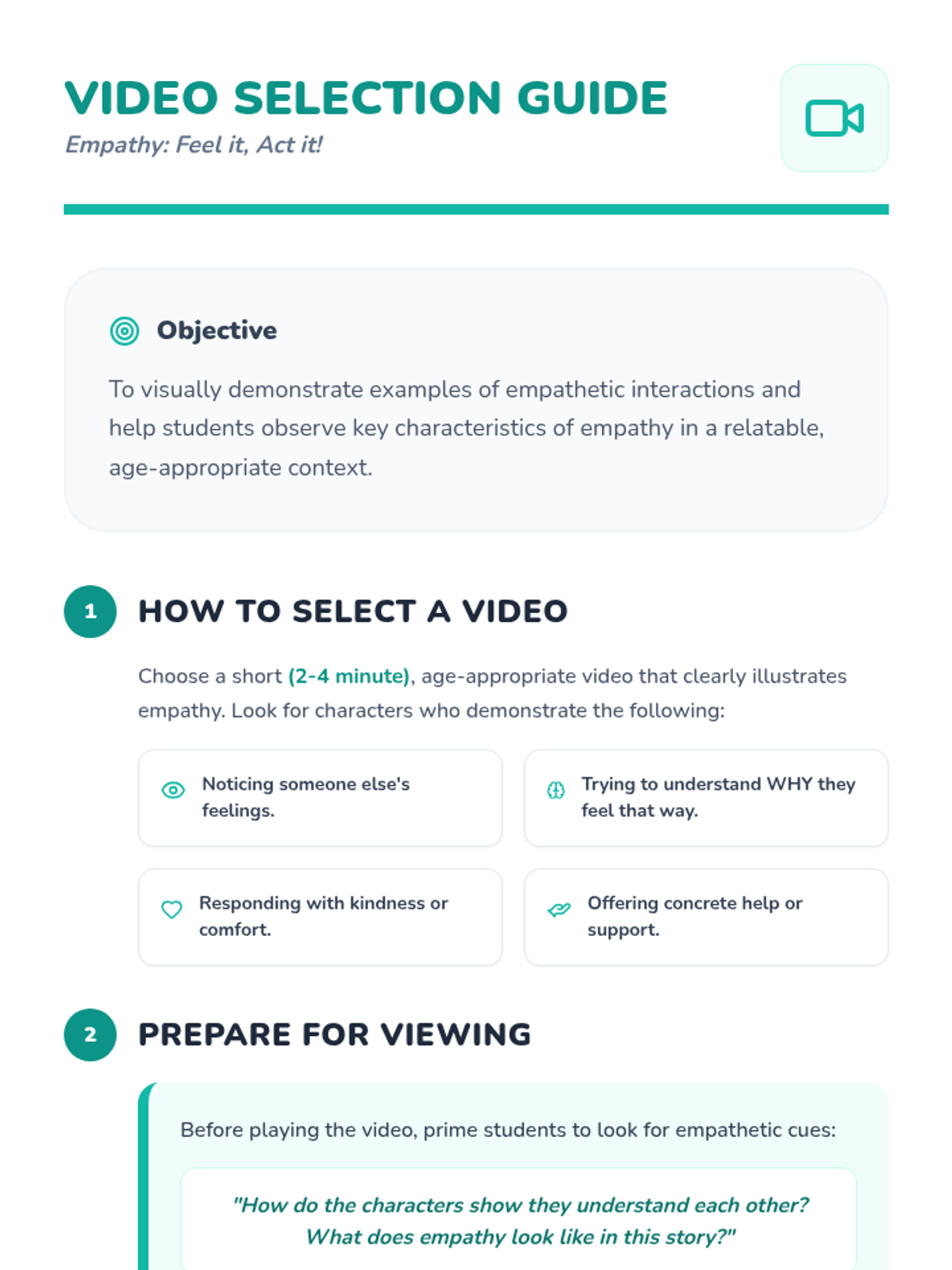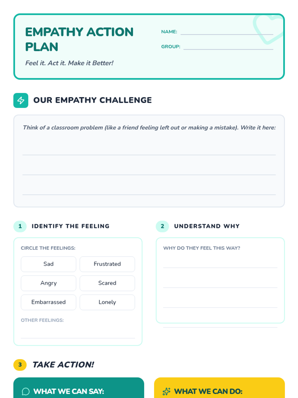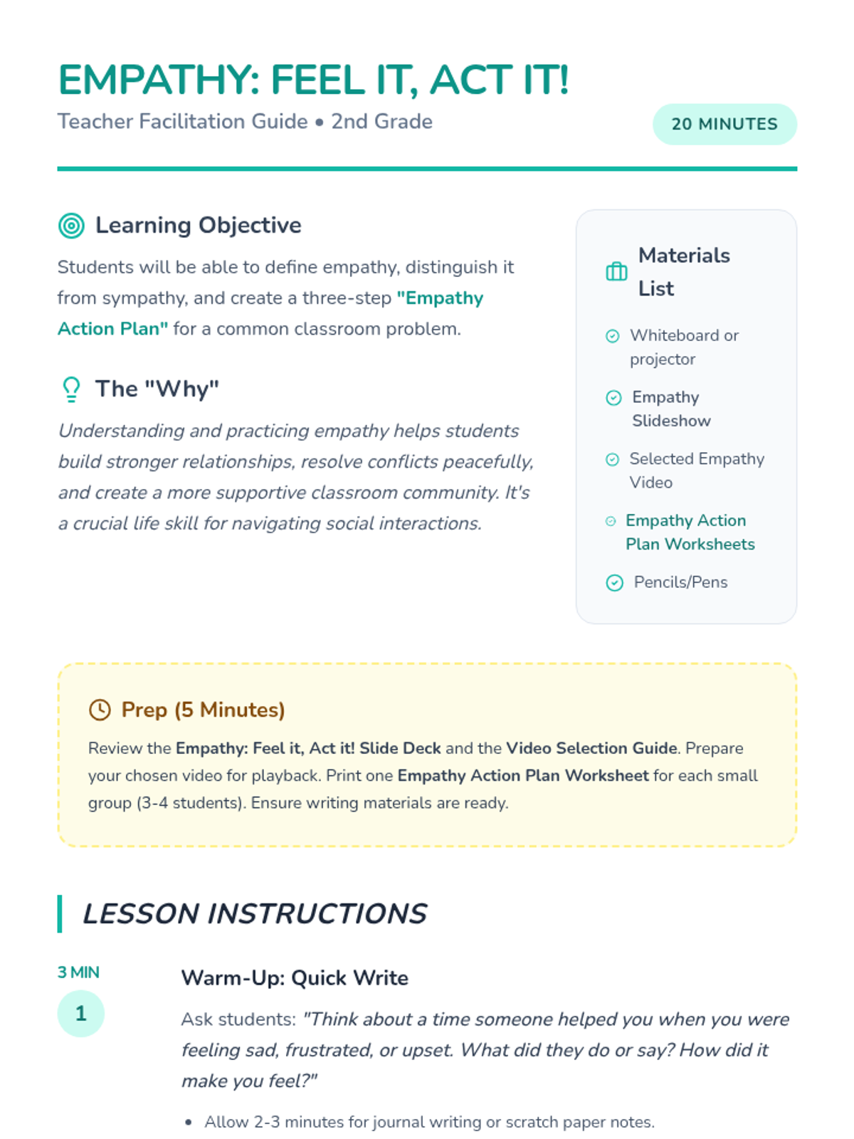 A 20-minute lesson for 2nd graders to define empathy, distinguish it from sympathy, and create actionable 'Empathy Action Plans' for classroom scenarios.
