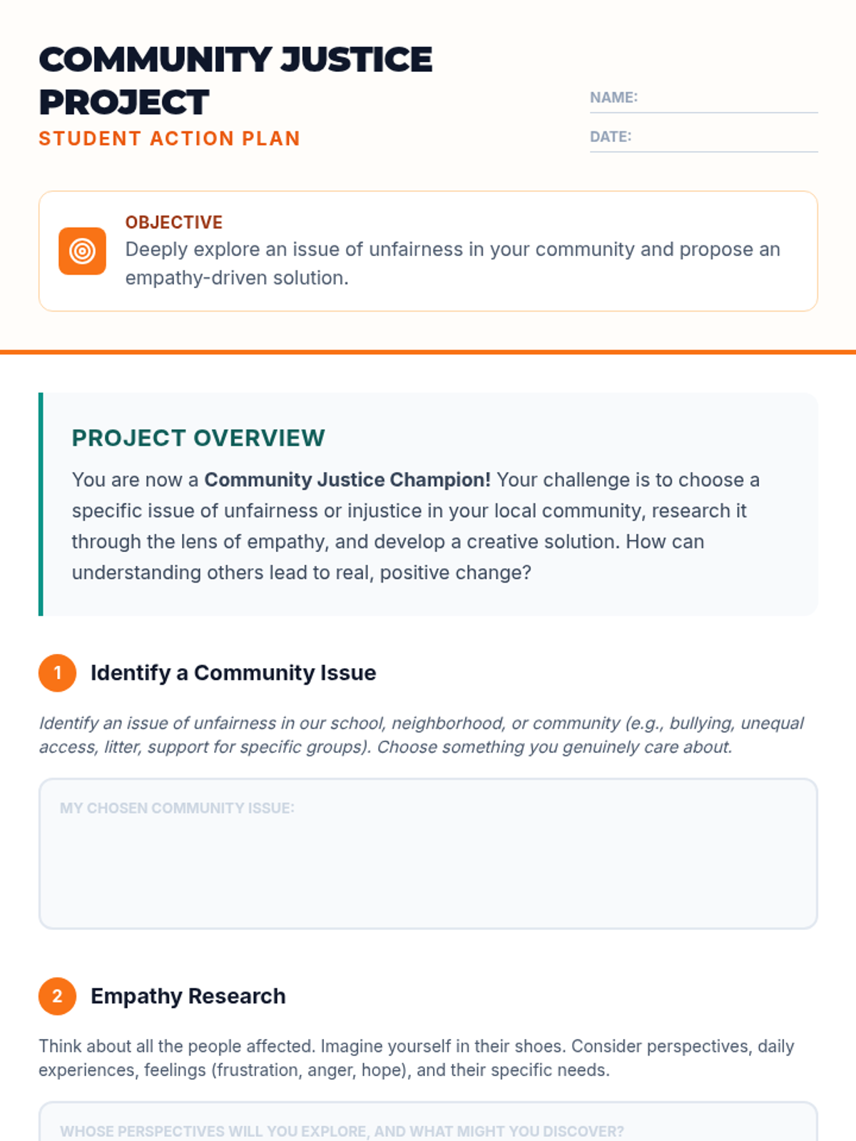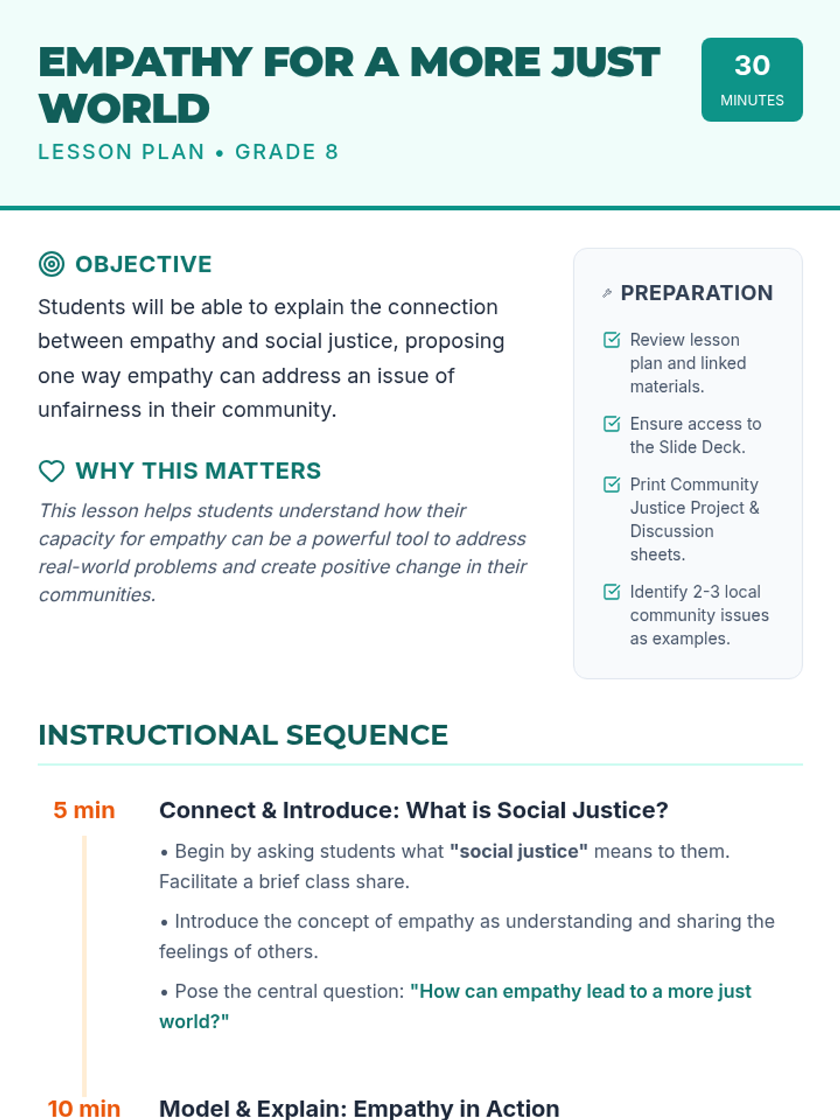 A 30-minute lesson for 8th-grade students that explores the intersection of empathy and social justice, encouraging students to identify local issues and propose empathetic solutions.