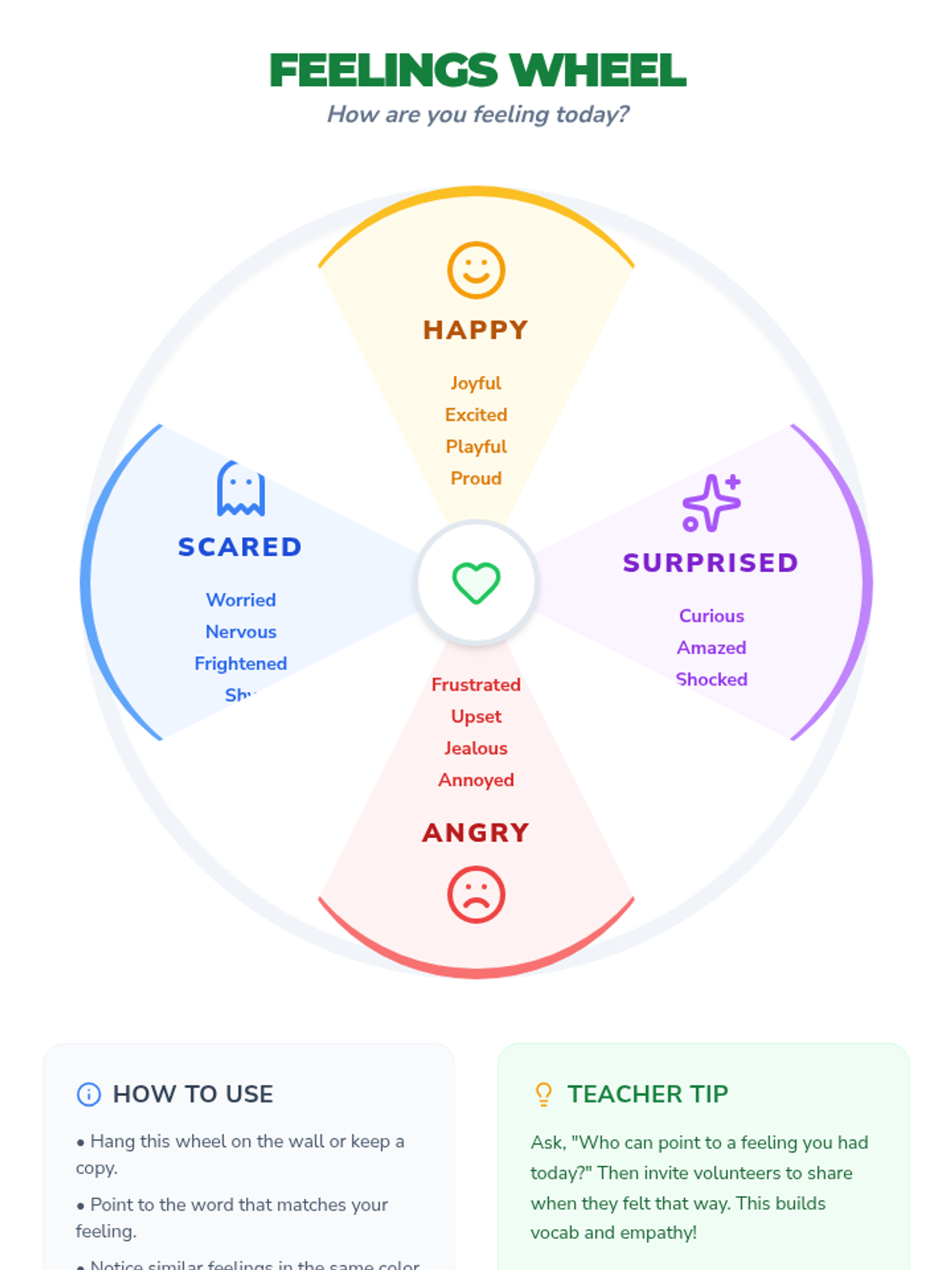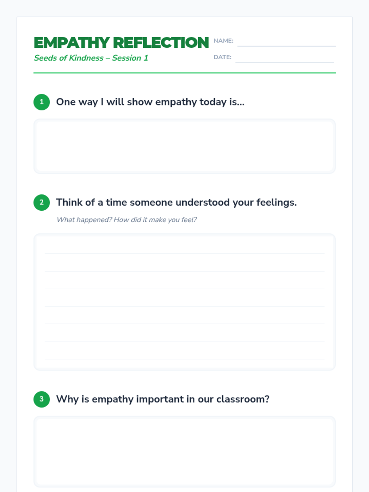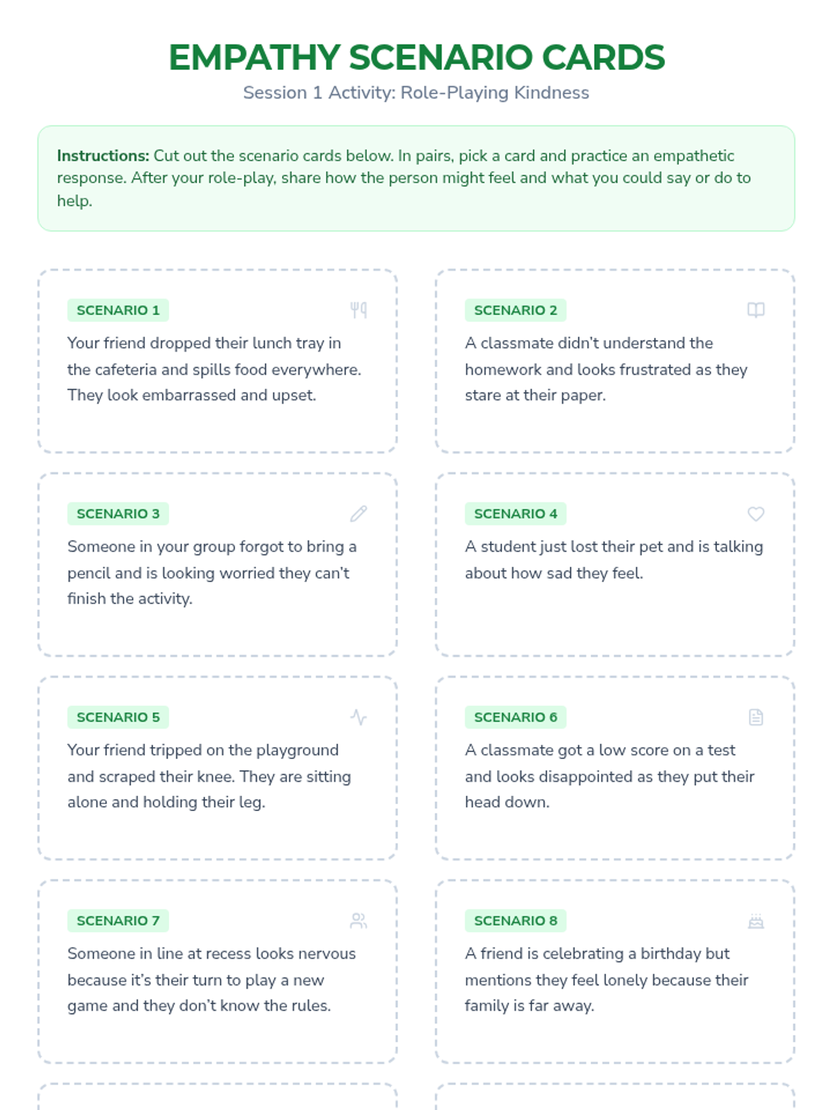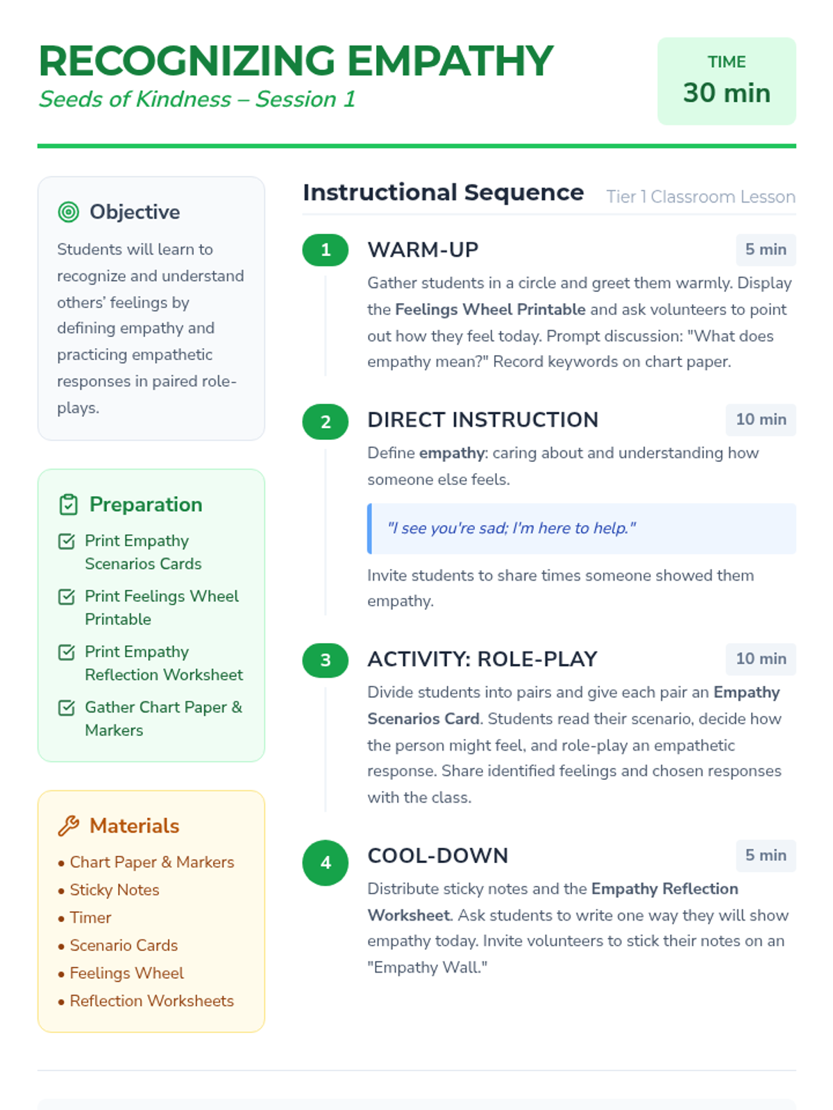 Students will learn to recognize and understand others’ feelings by defining empathy and practicing empathetic responses in paired role-plays.