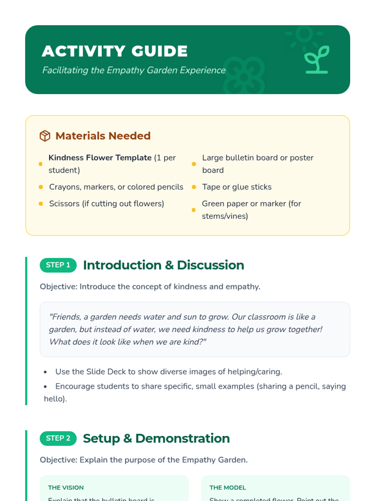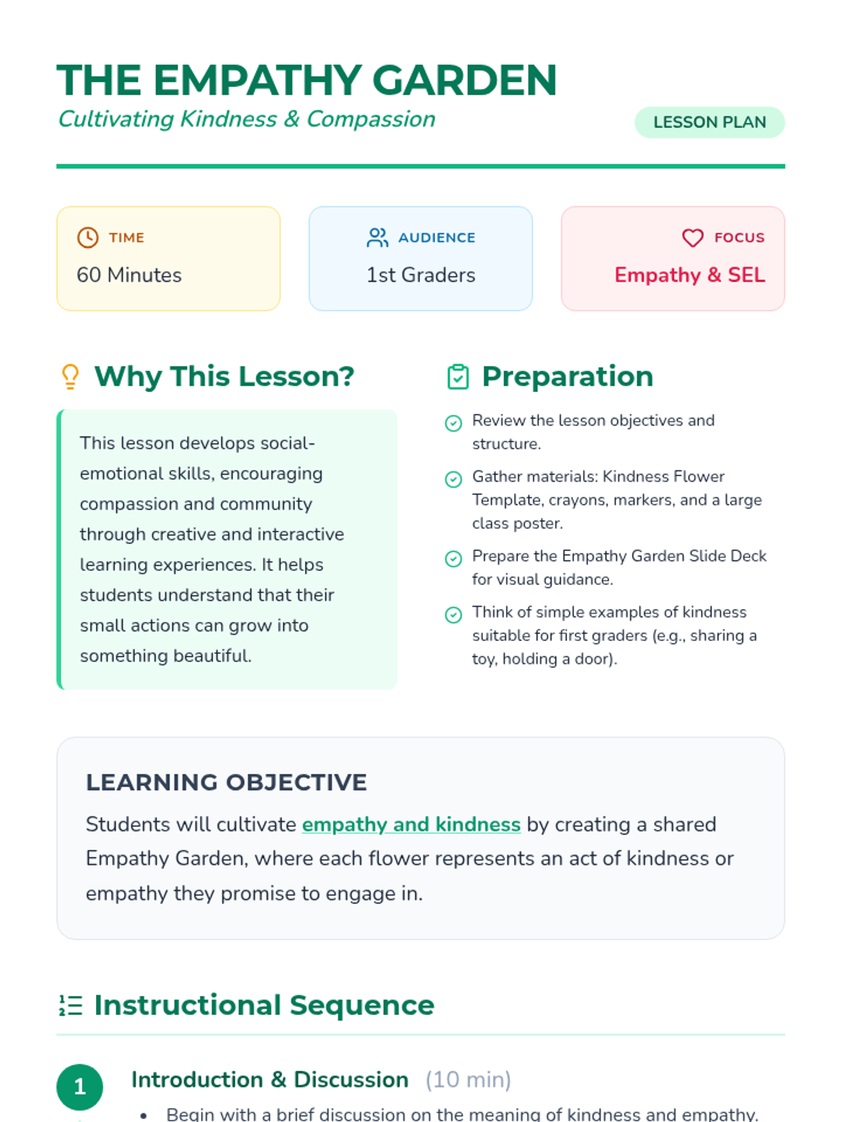A social-emotional learning lesson for first graders that uses a garden metaphor to teach empathy and kindness through interactive discussion and a creative flower-making activity.
